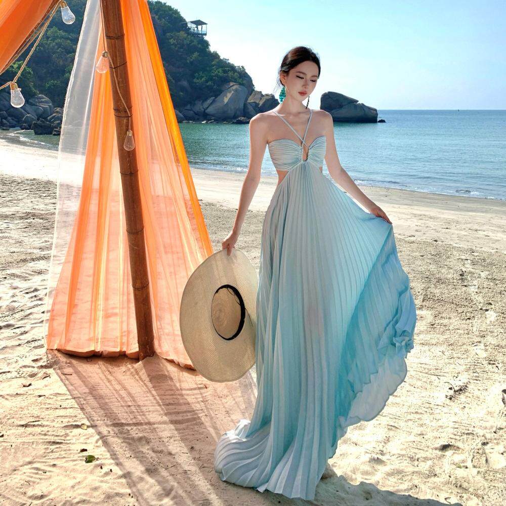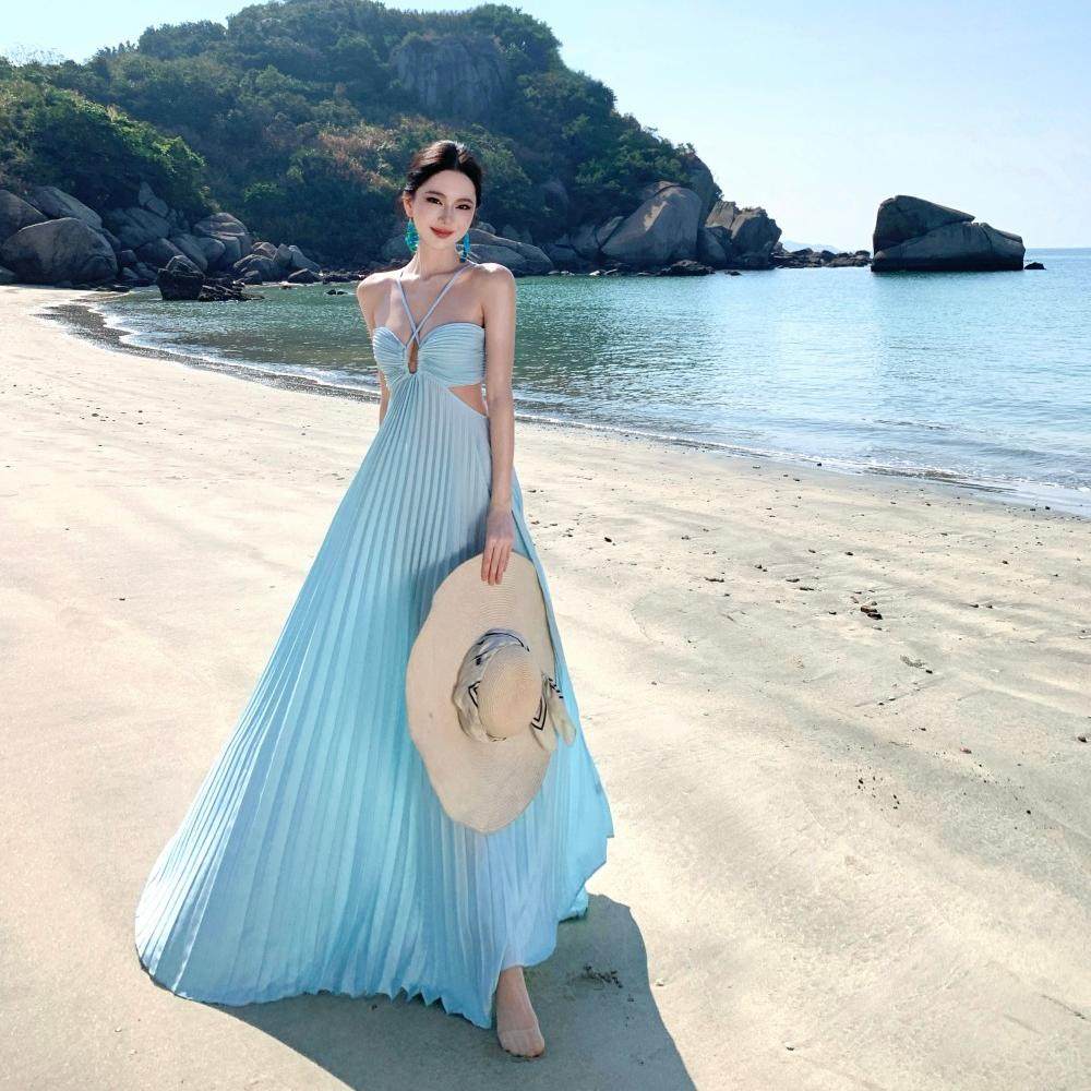 超仙大擺氛圍感碎花氣質收腰顯瘦百褶掛脖抹胸吊帶長裙海邊度假裙