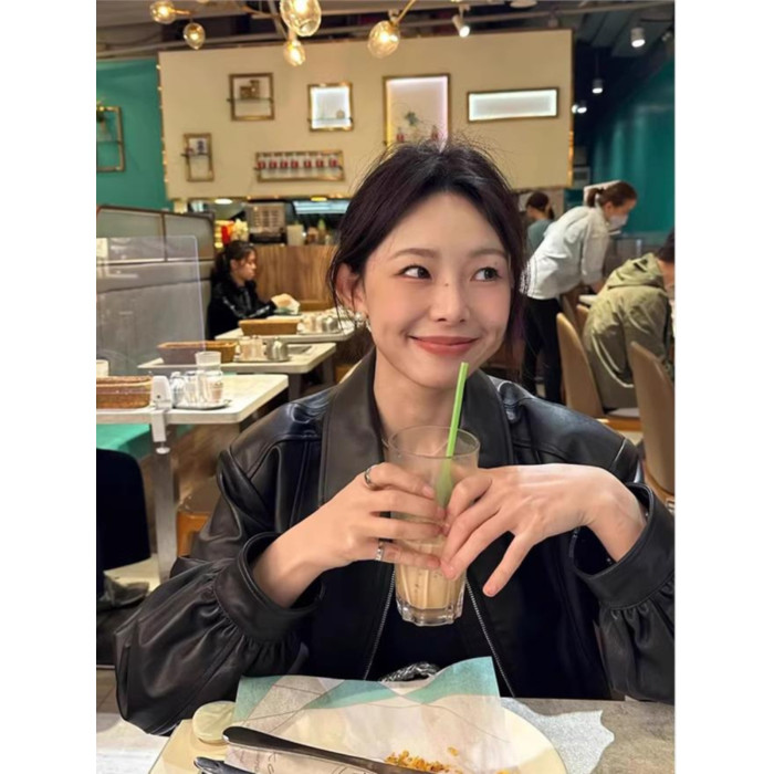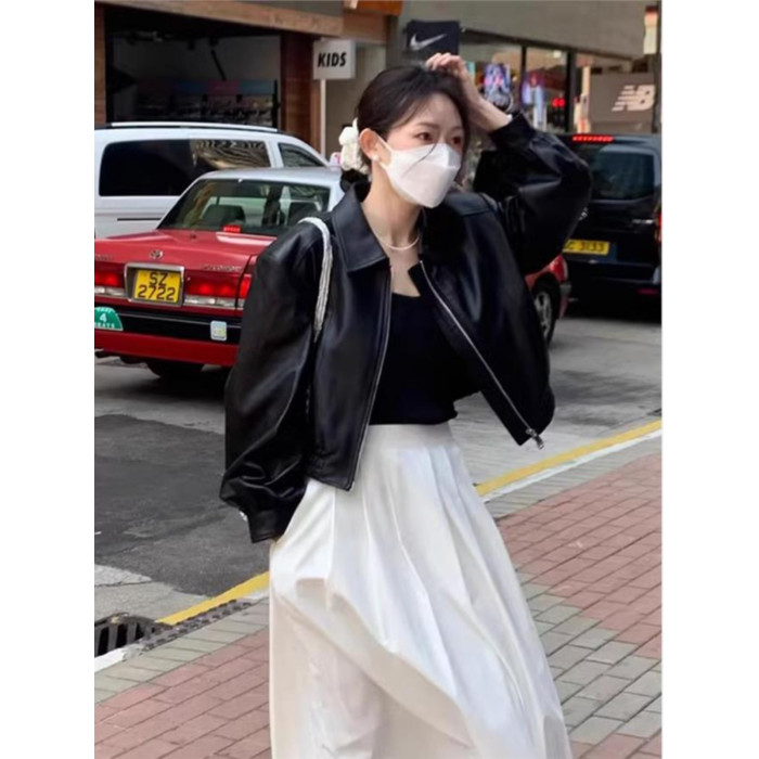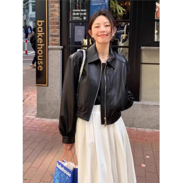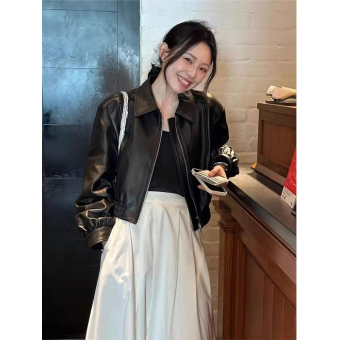 2024秋季新款黑色夾克短款皮衣外套高級感美式復古小個子休閒上衣
