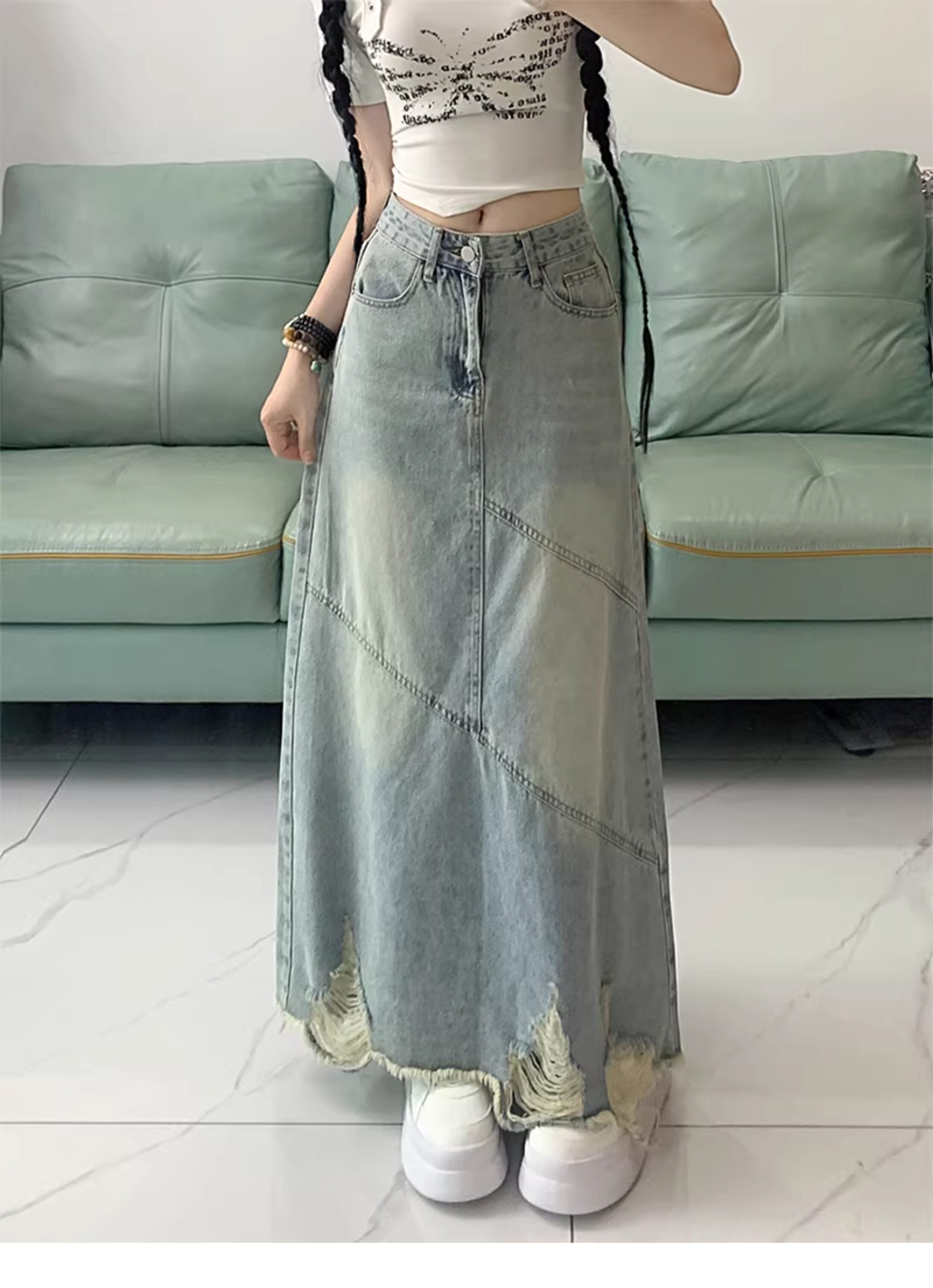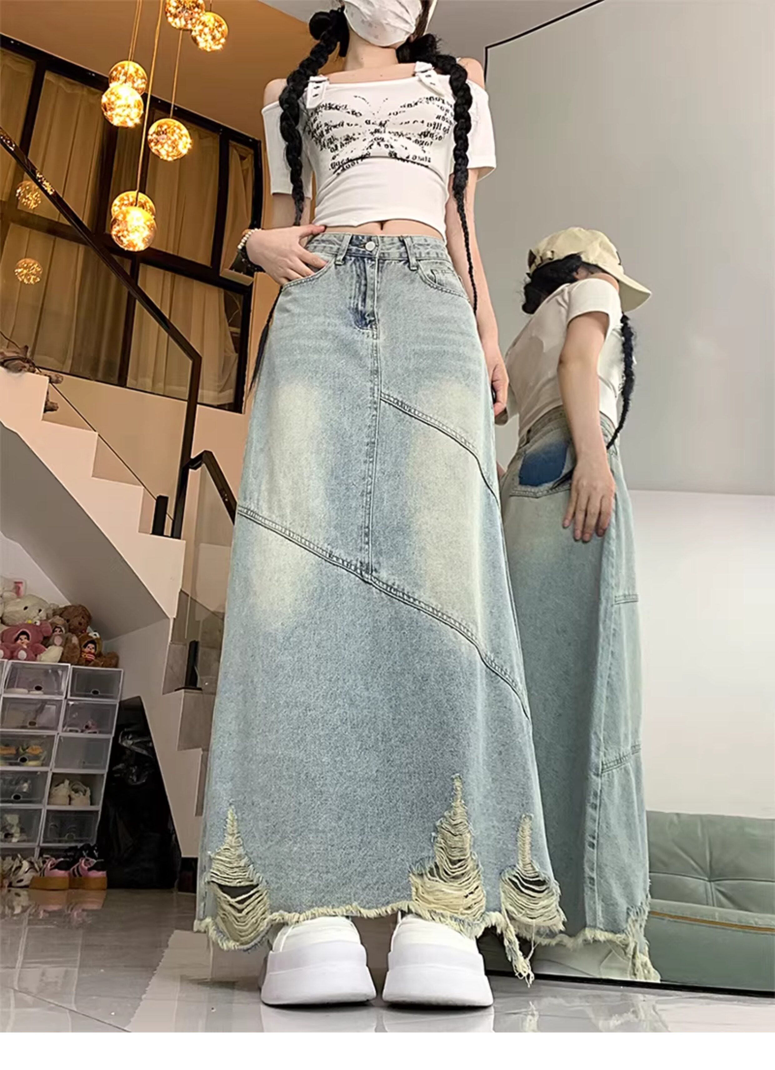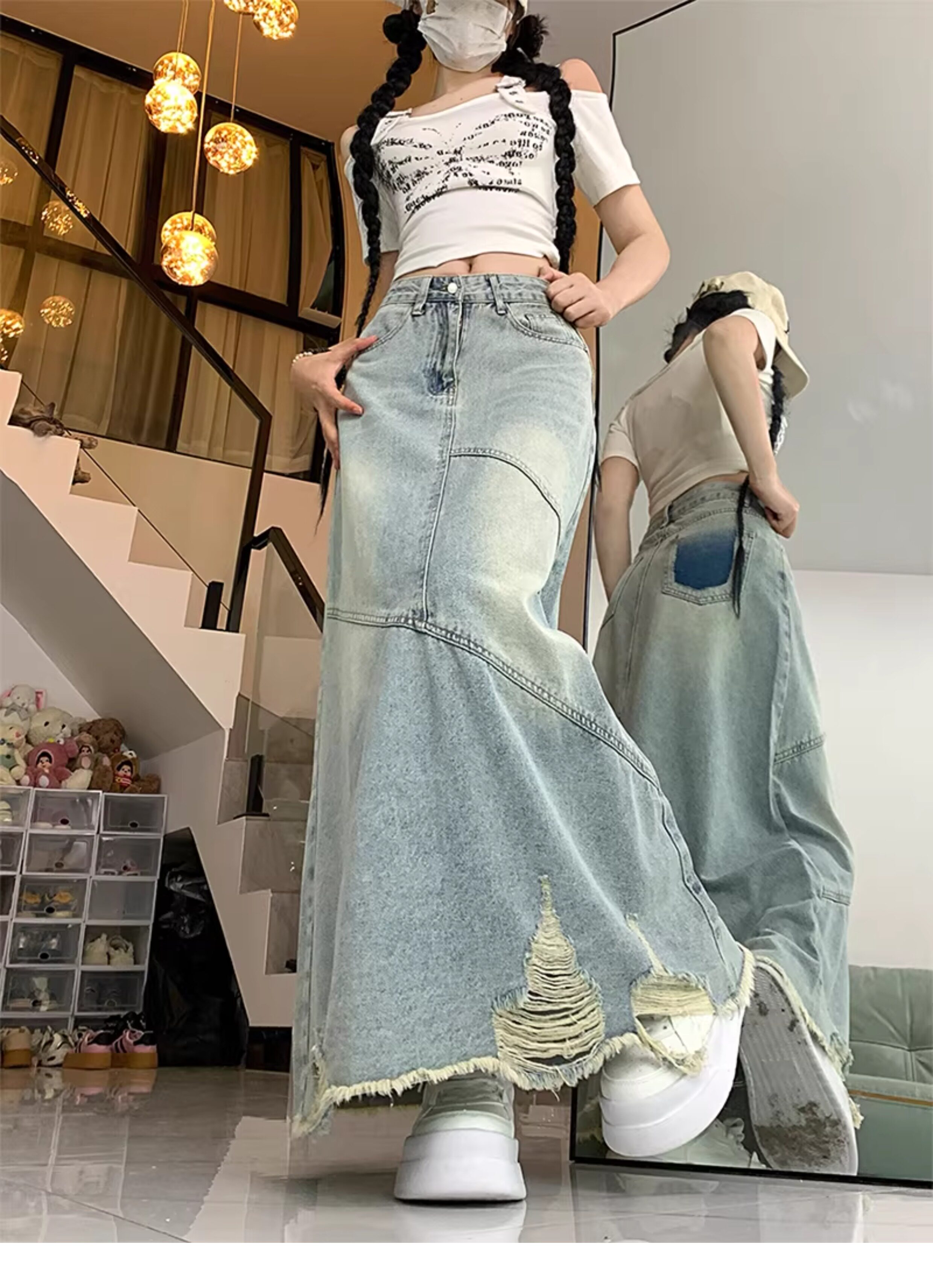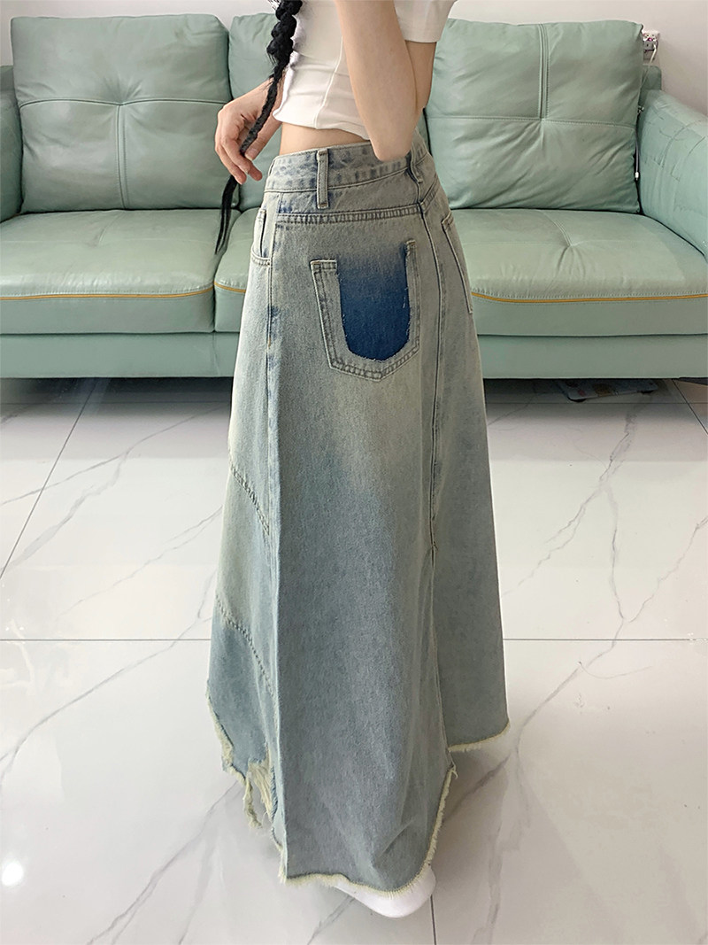 大碼復古破洞牛仔半身裙女春夏高腰寬鬆顯瘦中長款包臀a字長裙子