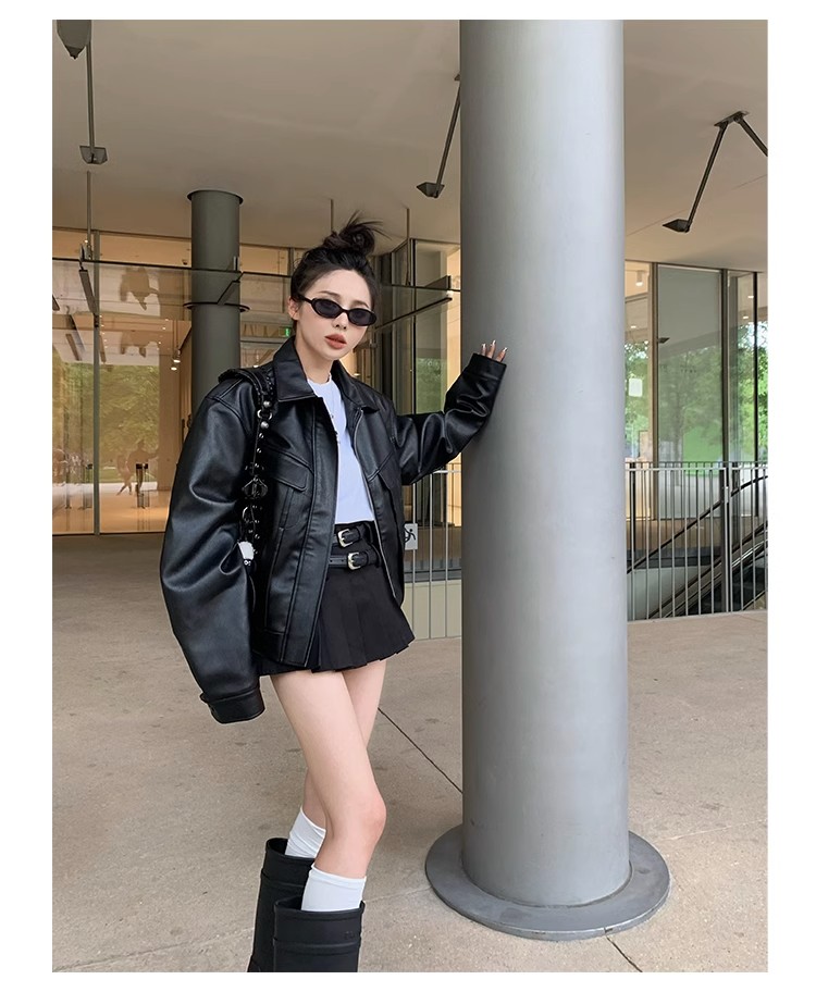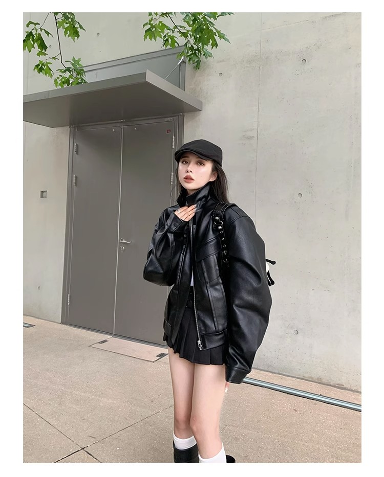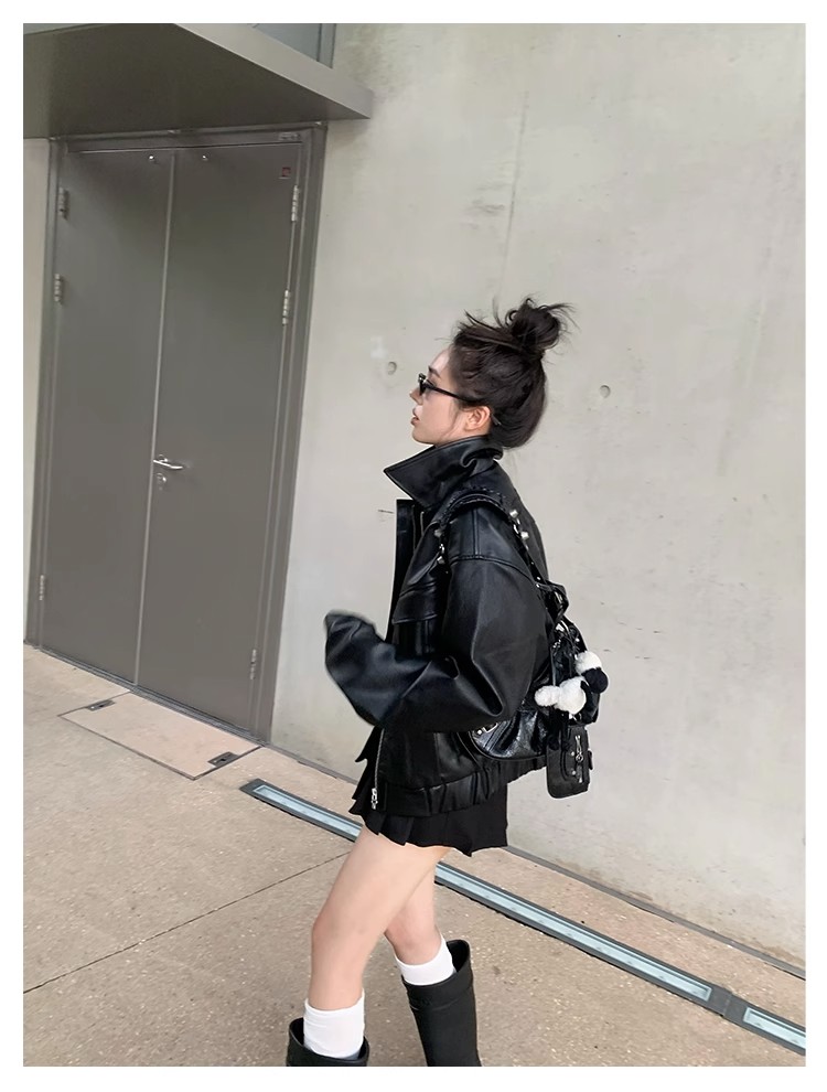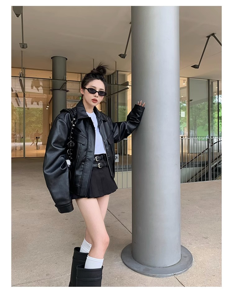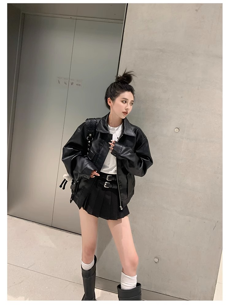 美式復古短款皮衣外套女士寬松小個子設計感機車服秋季新品皮夾克