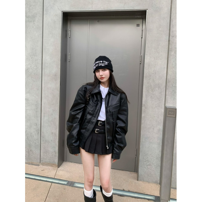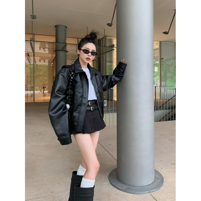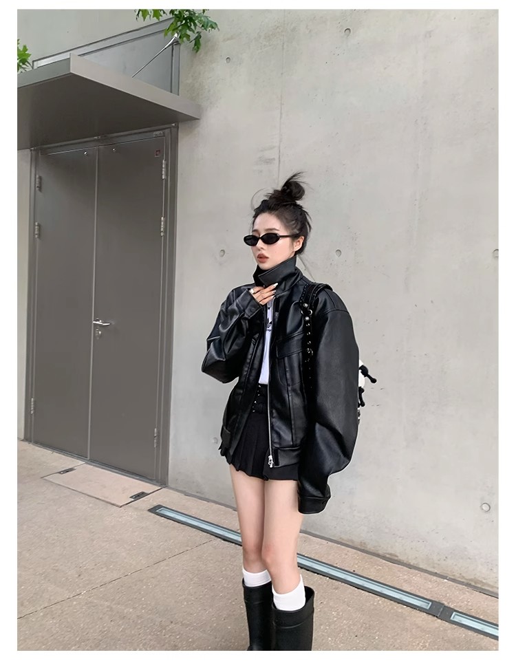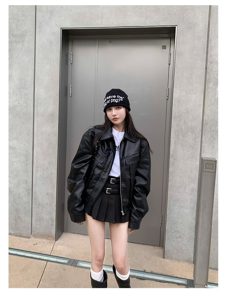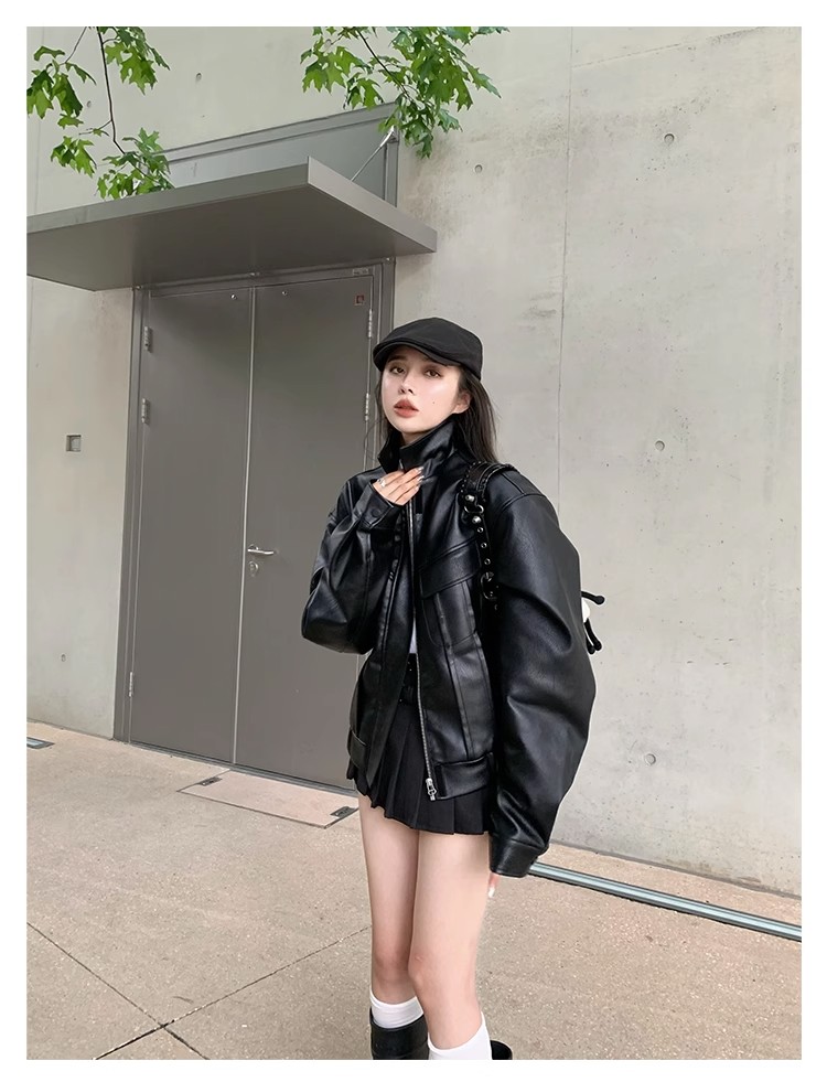 美式復古短款皮衣外套女士寬松小個子設計感機車服秋季新品皮夾克