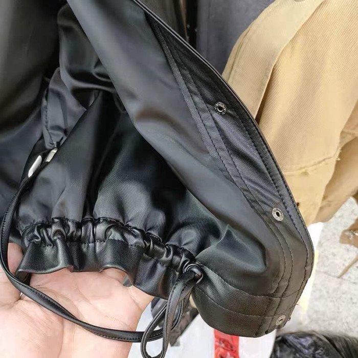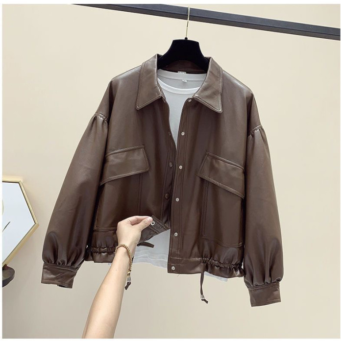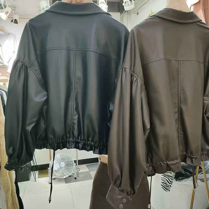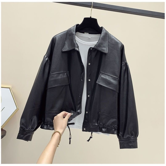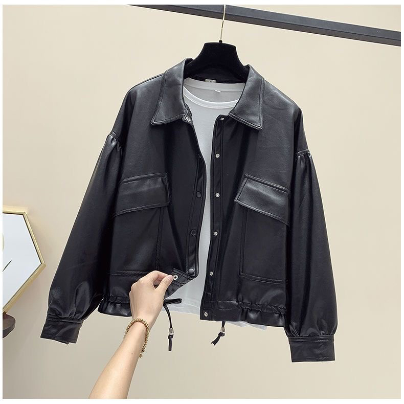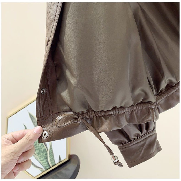 抽繩皮衣外套女短款寬松韓版bf風2025新款PU皮機車翻領大口袋夾克