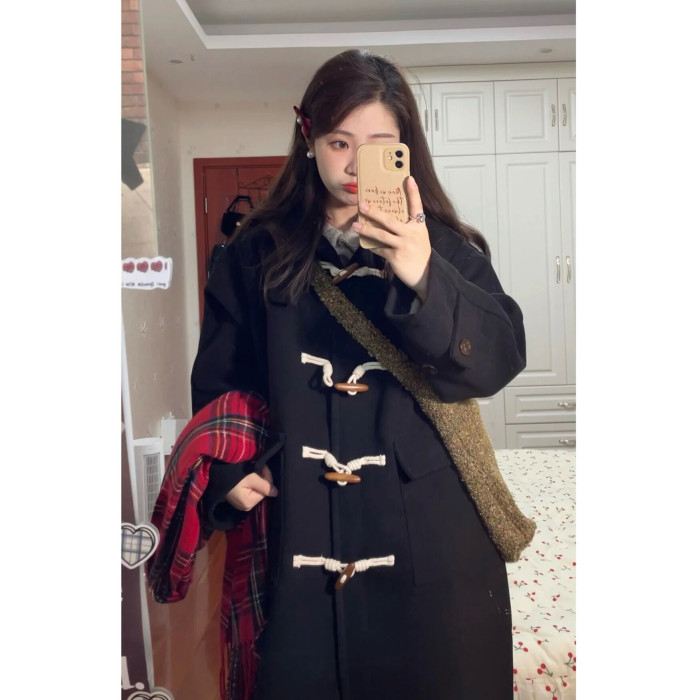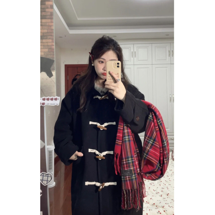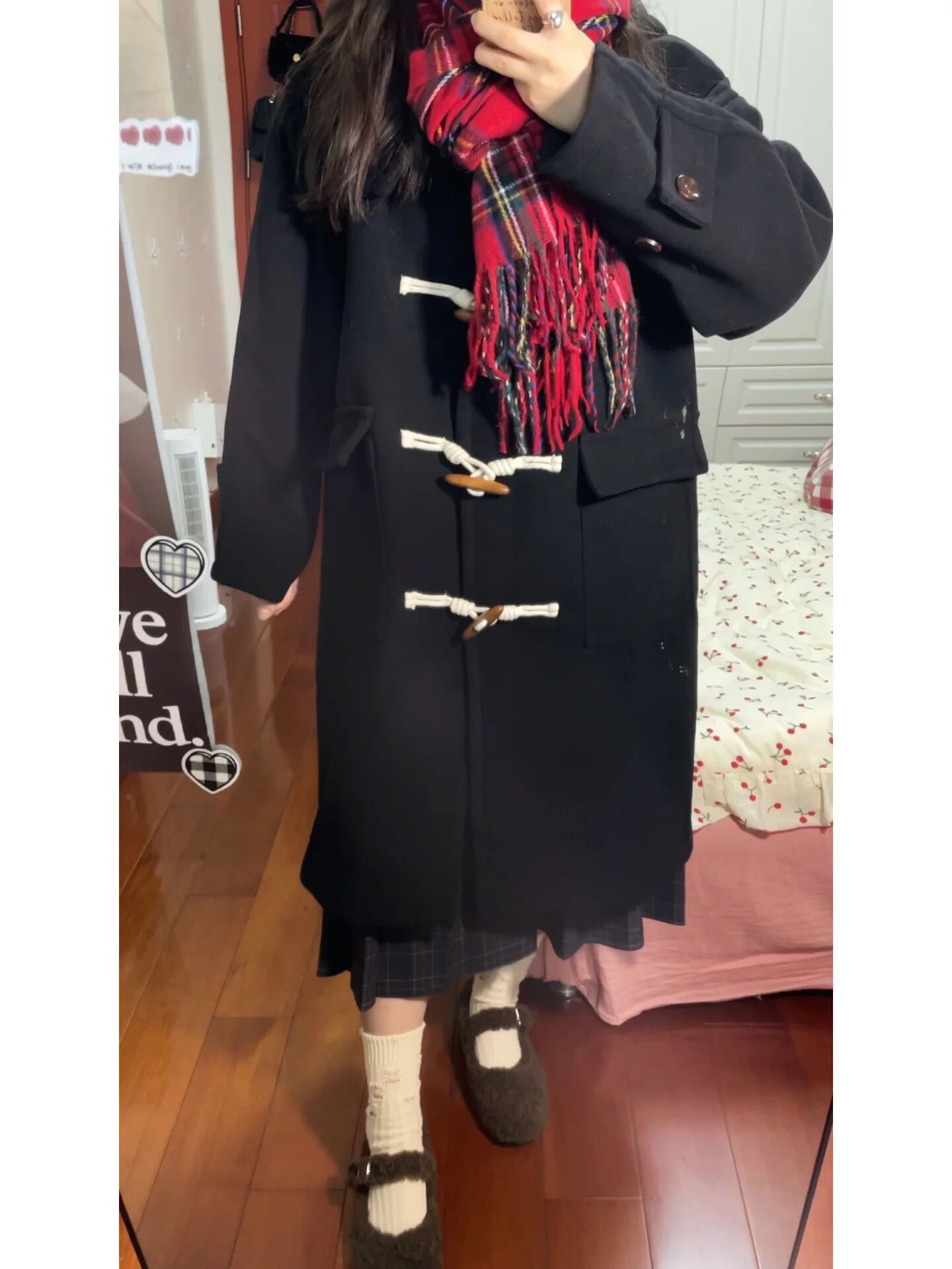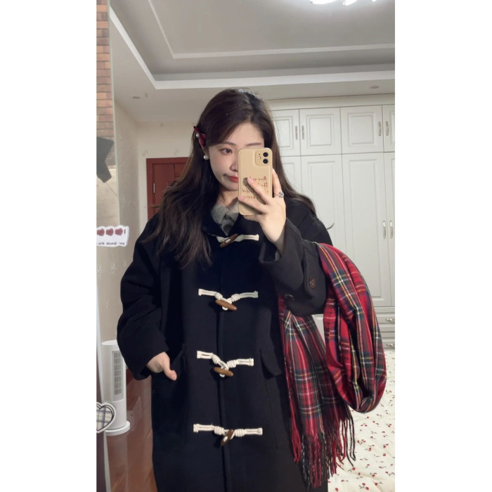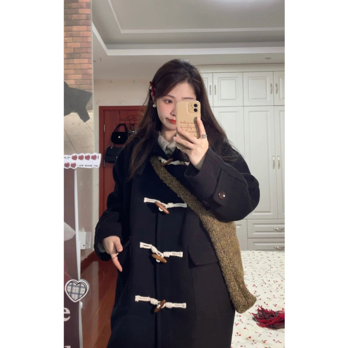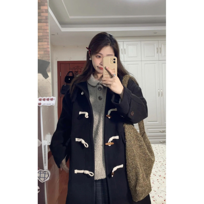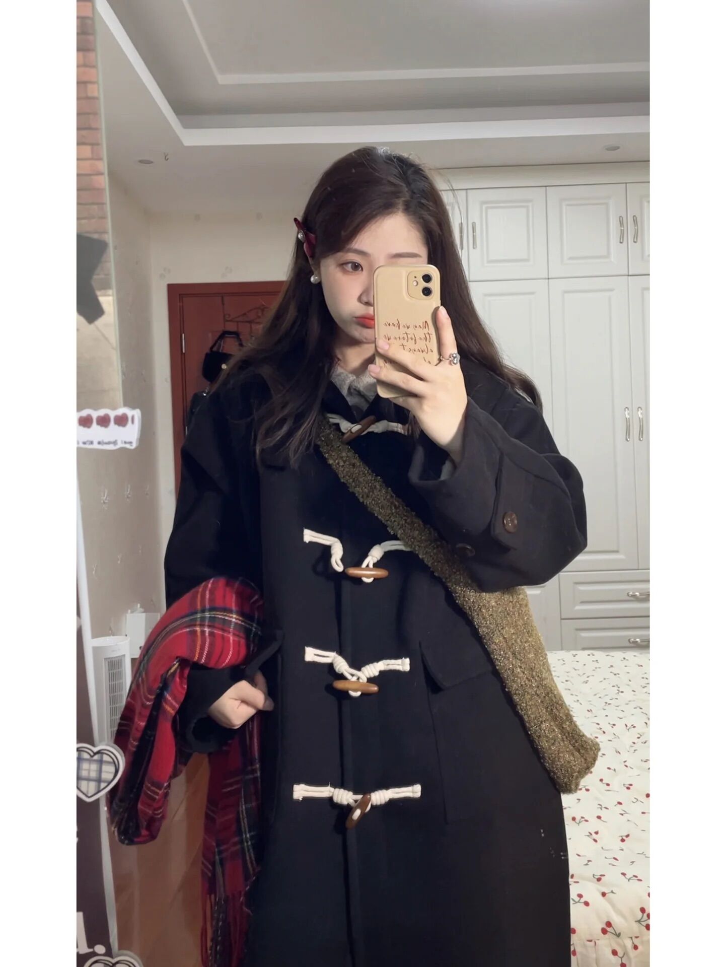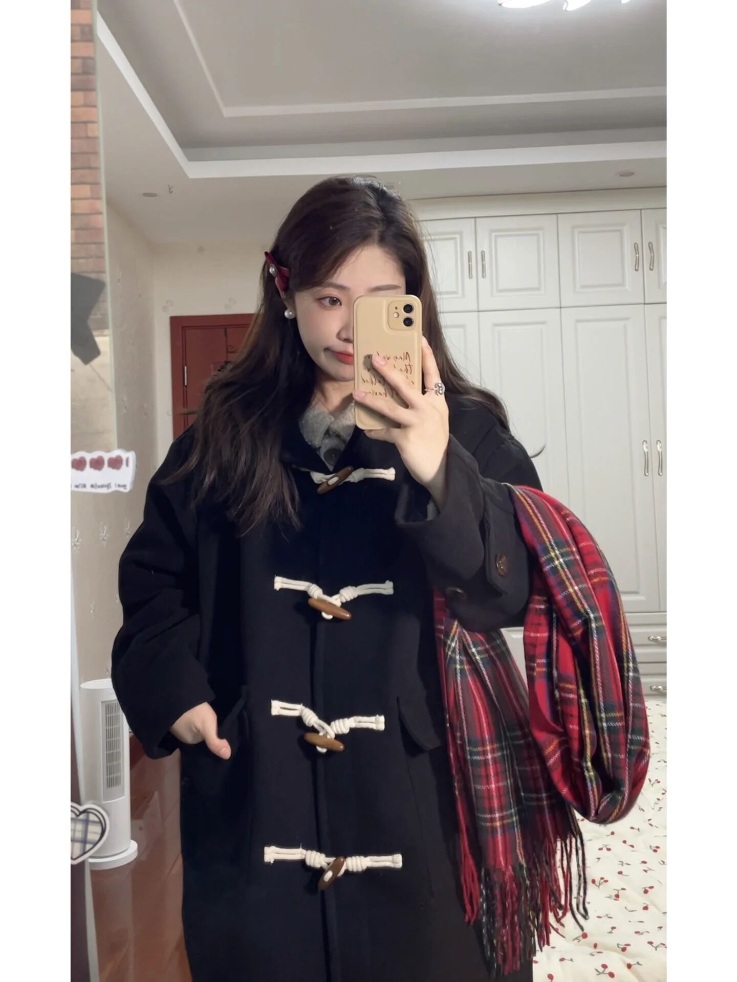 牛角釦黑色毛呢外套女秋冬2024新款韓系中長款小個子連帽呢子大衣