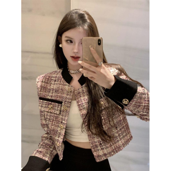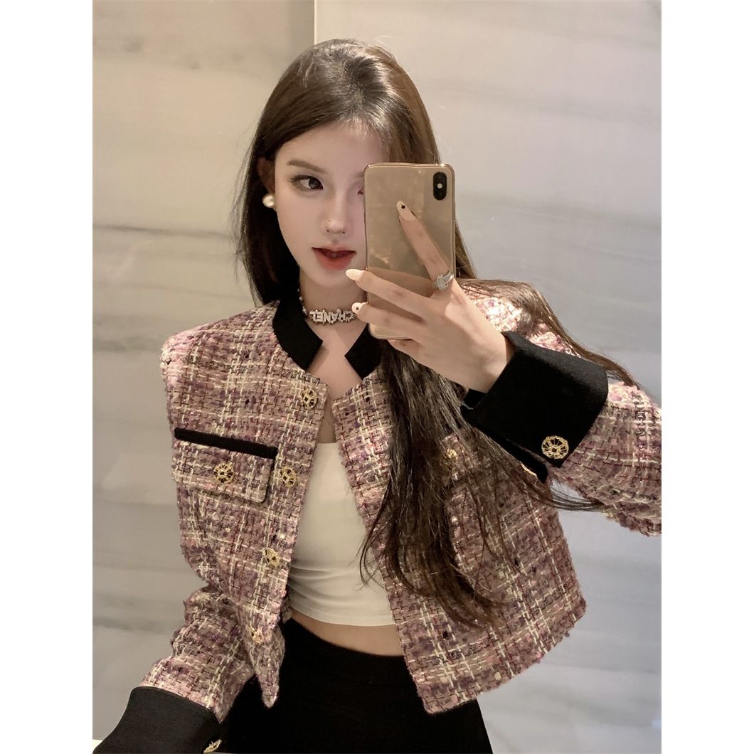 小個子小香風外套女百搭春秋冬2024新款短款粗花呢名媛立領上衣女