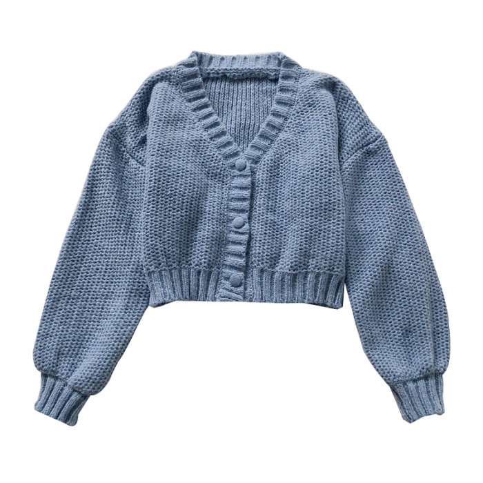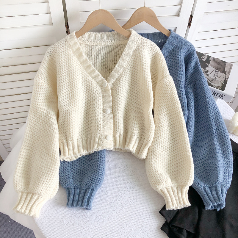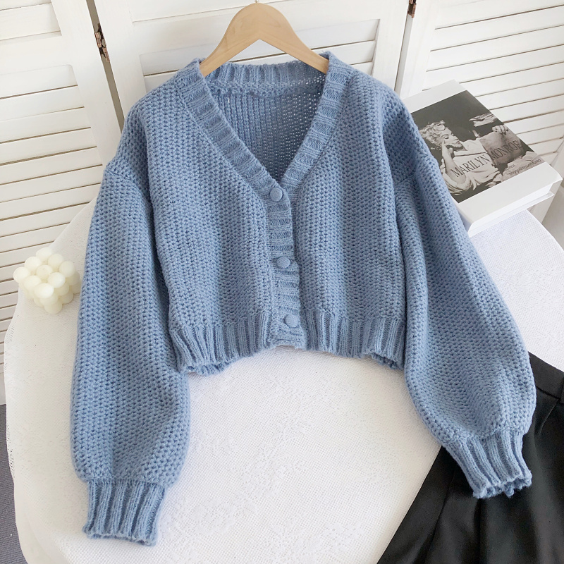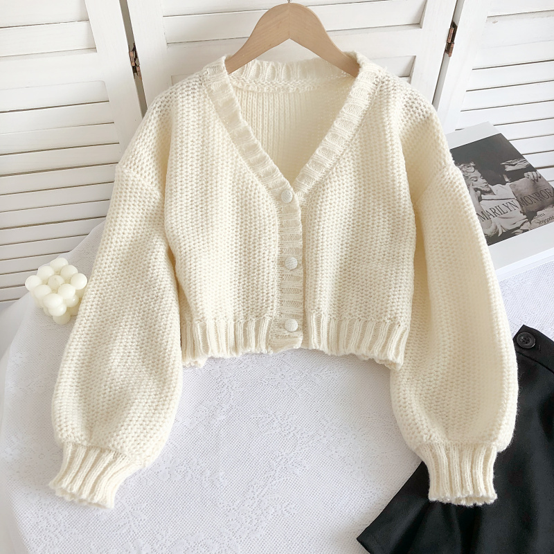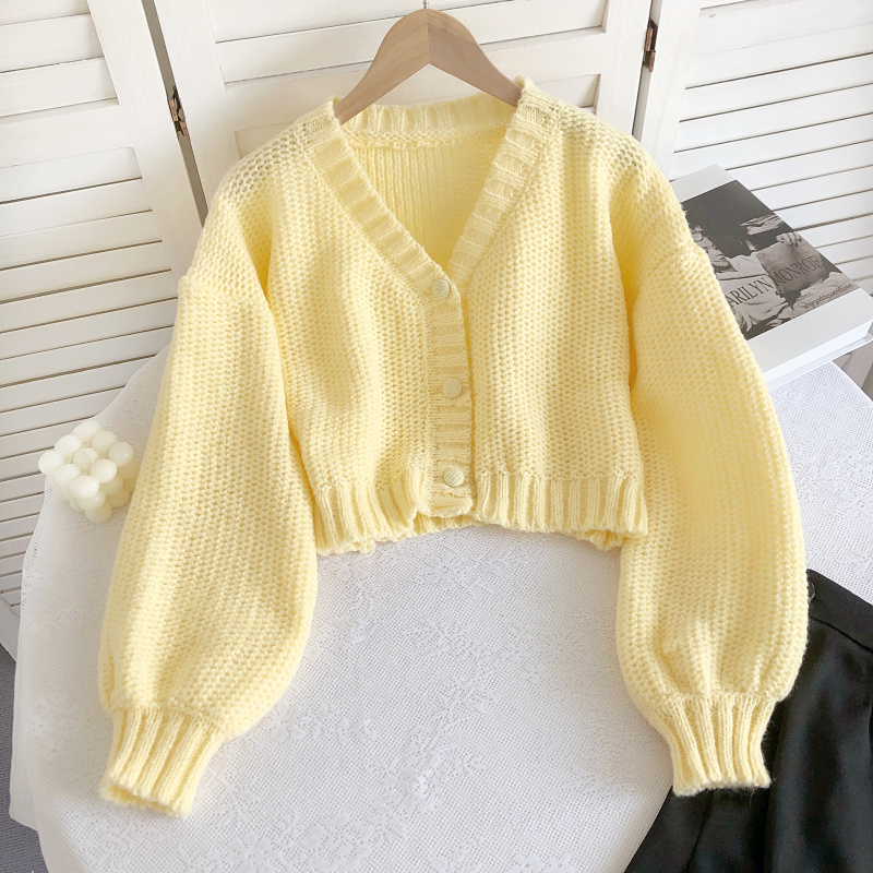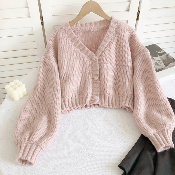 甜美溫柔慵懶風V領長袖排釦針織秋冬開衫小外套純色短款毛衣女