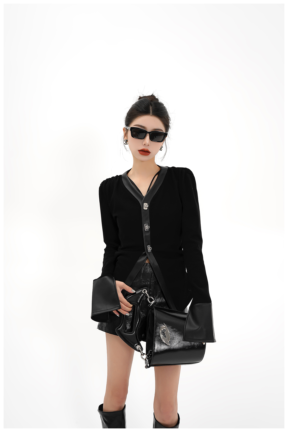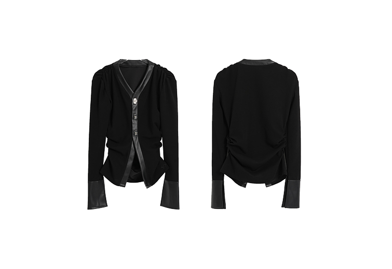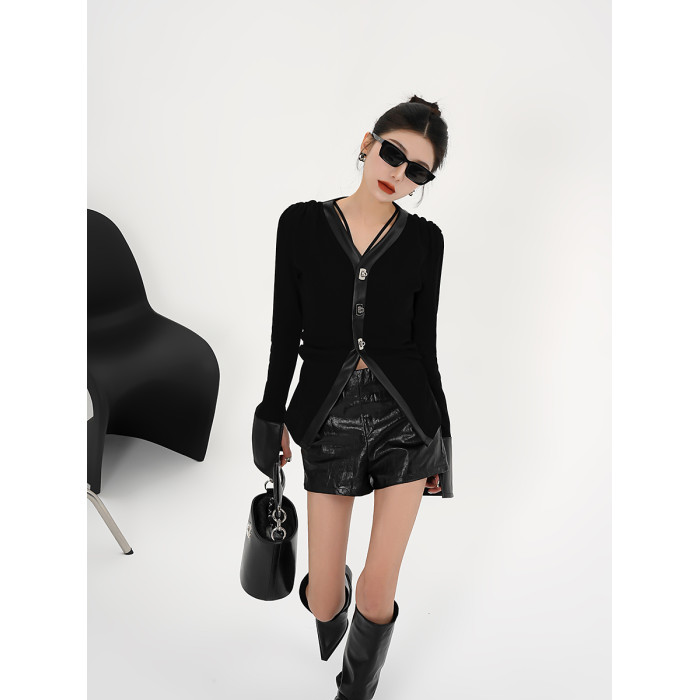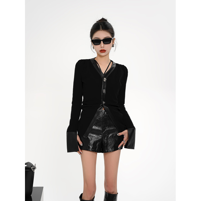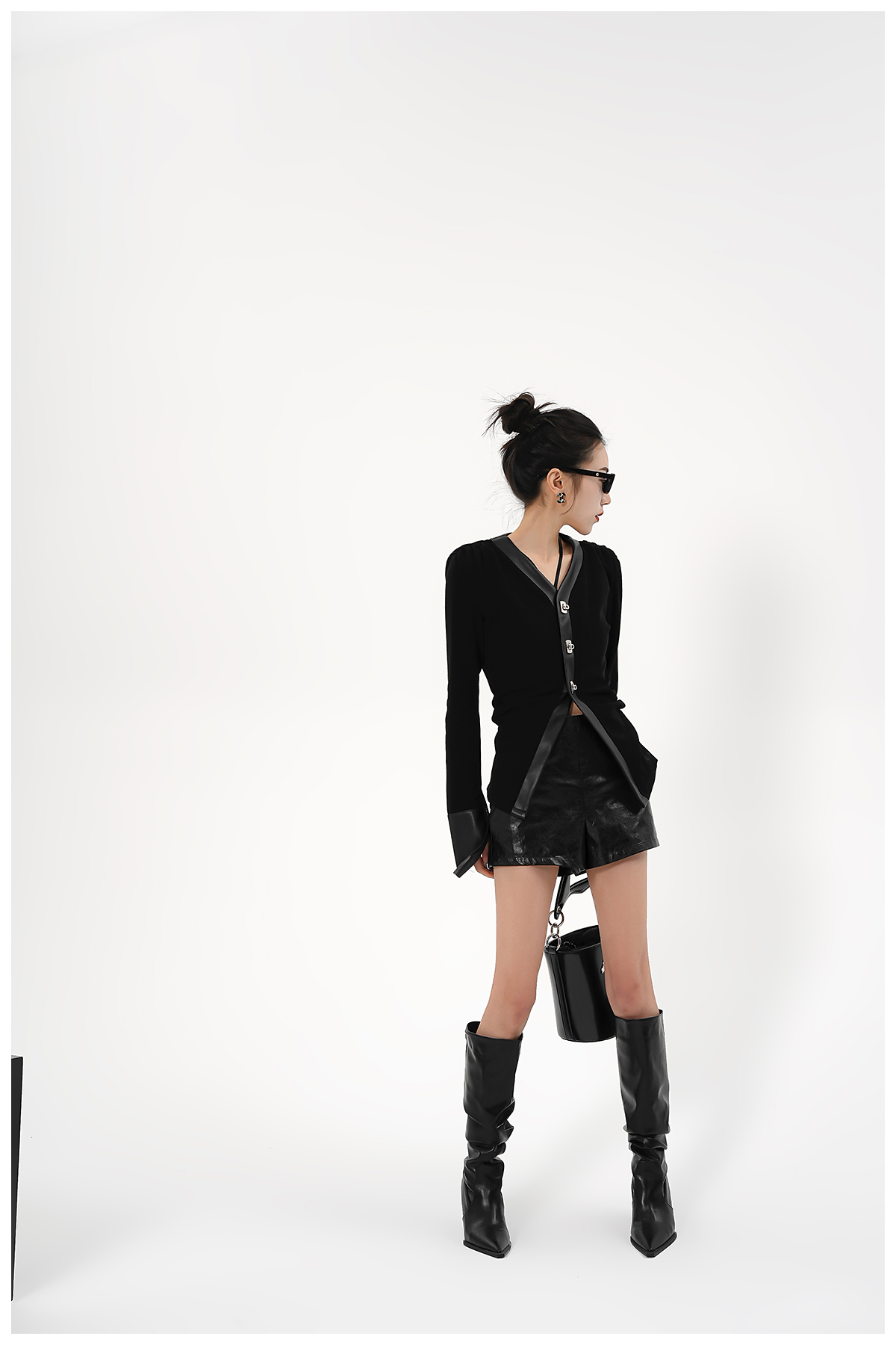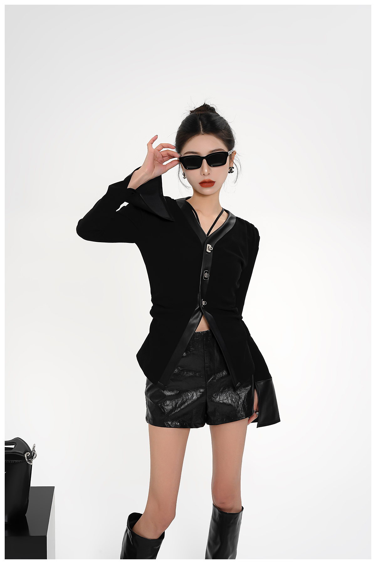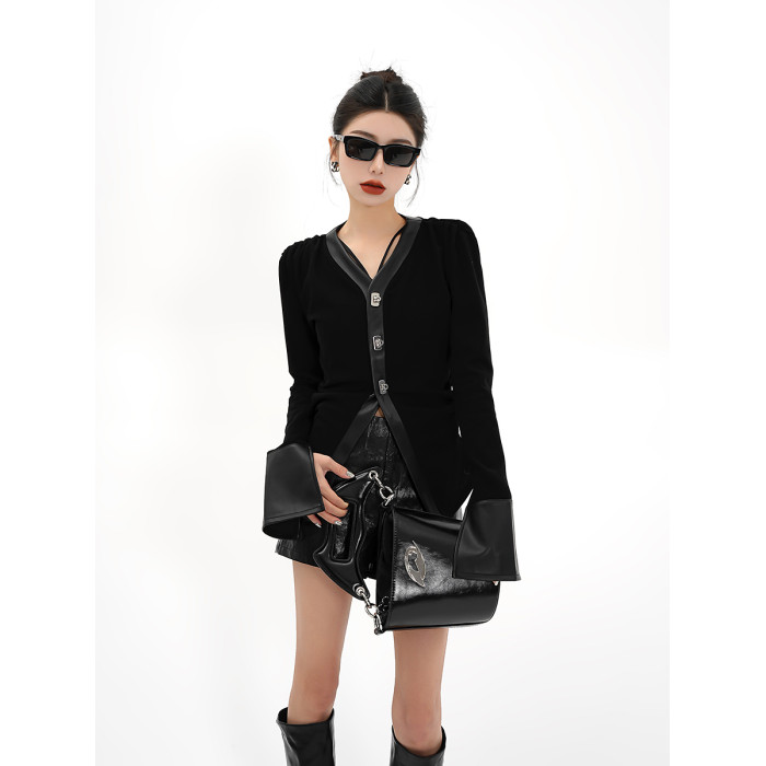 SRYS拼皮收腰顯瘦高腰長袖開衫黑色V領短外套襯衫上衣新款春裝女