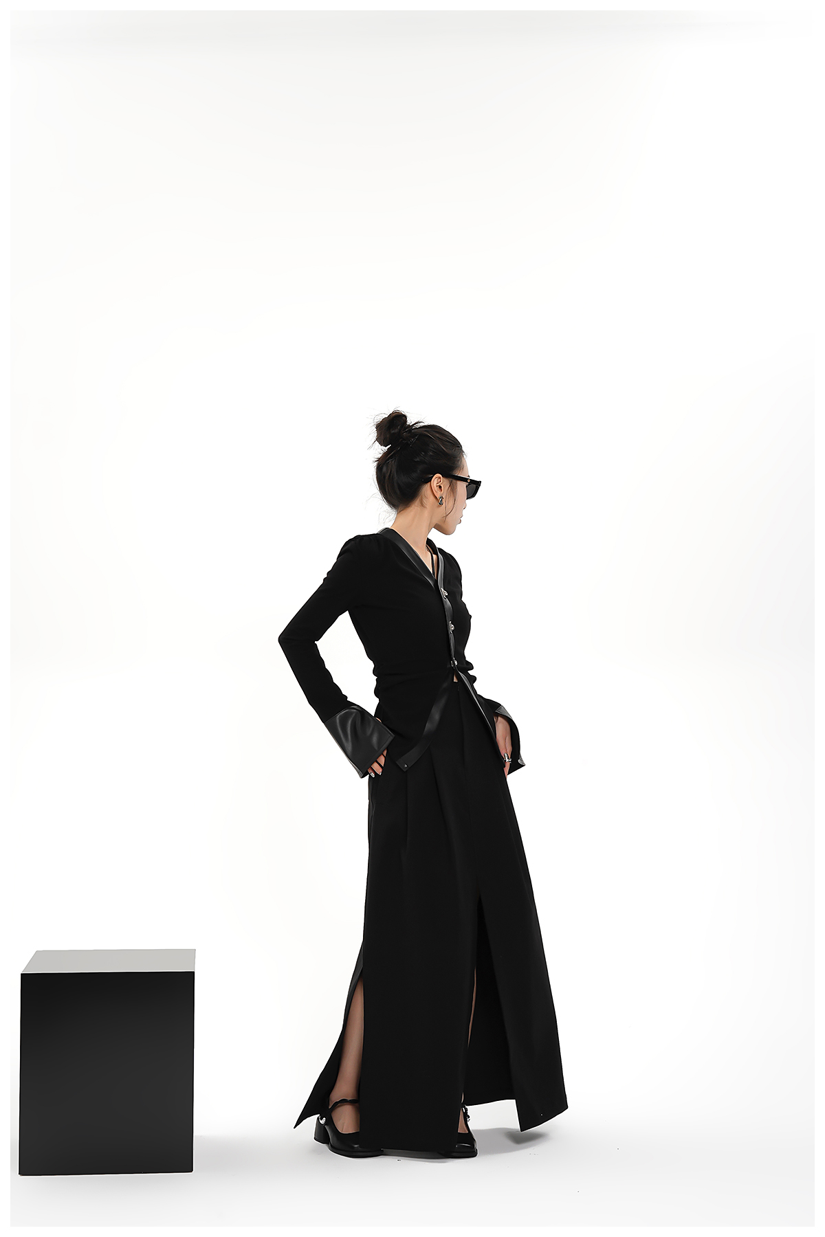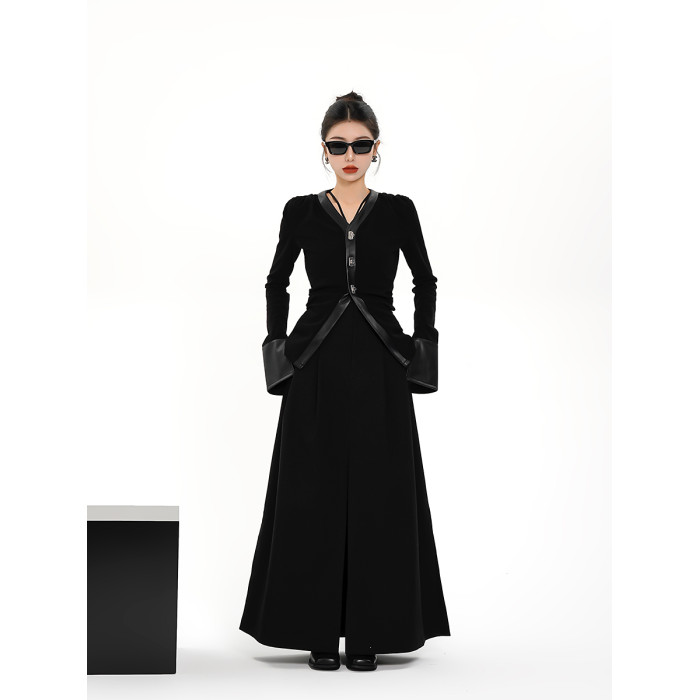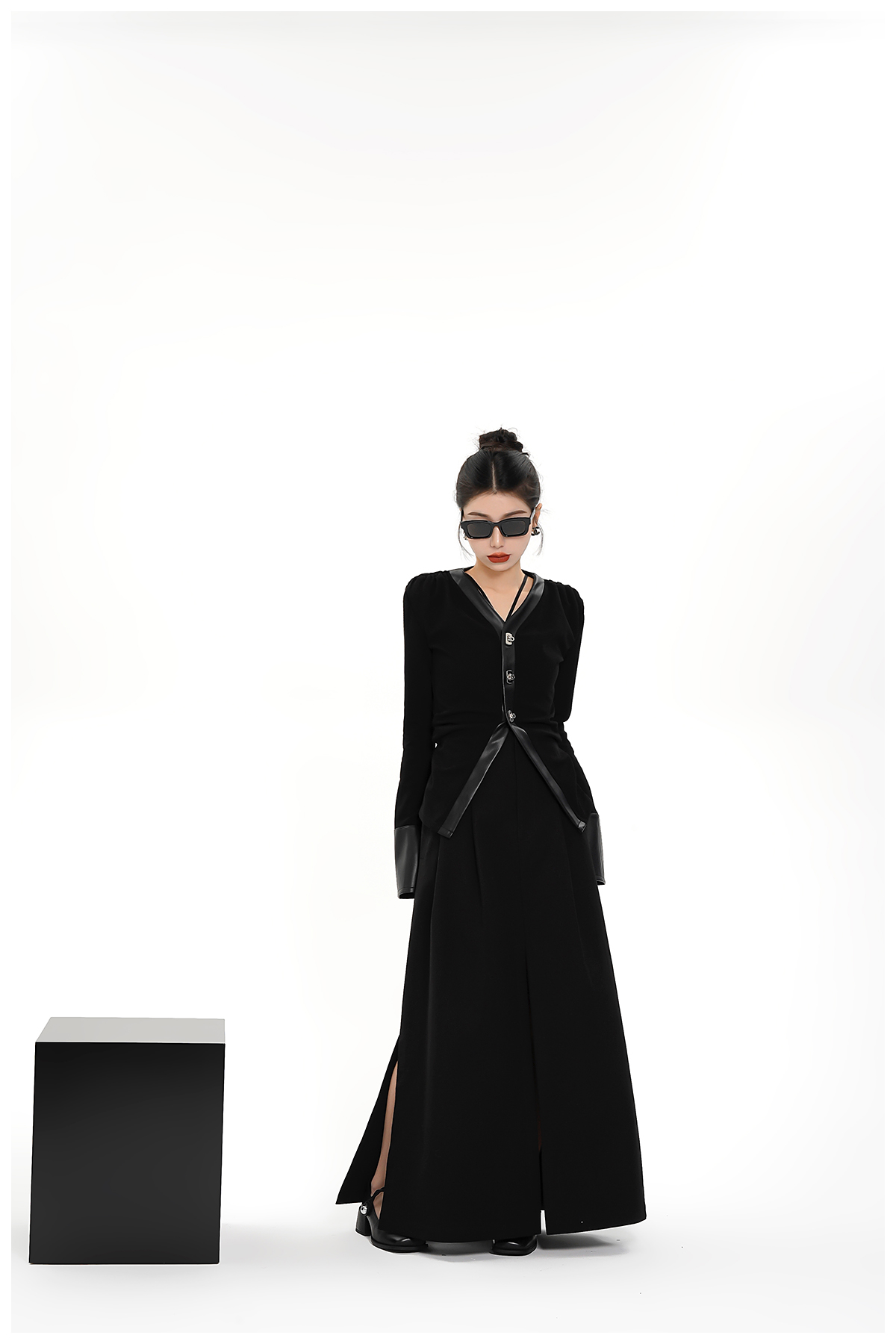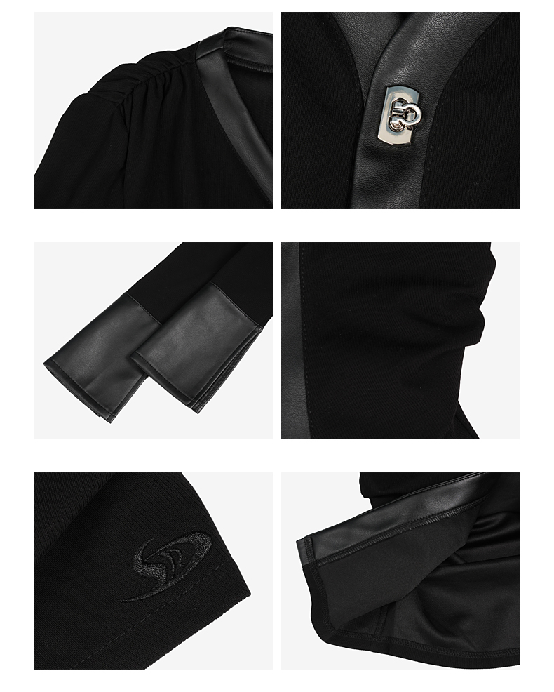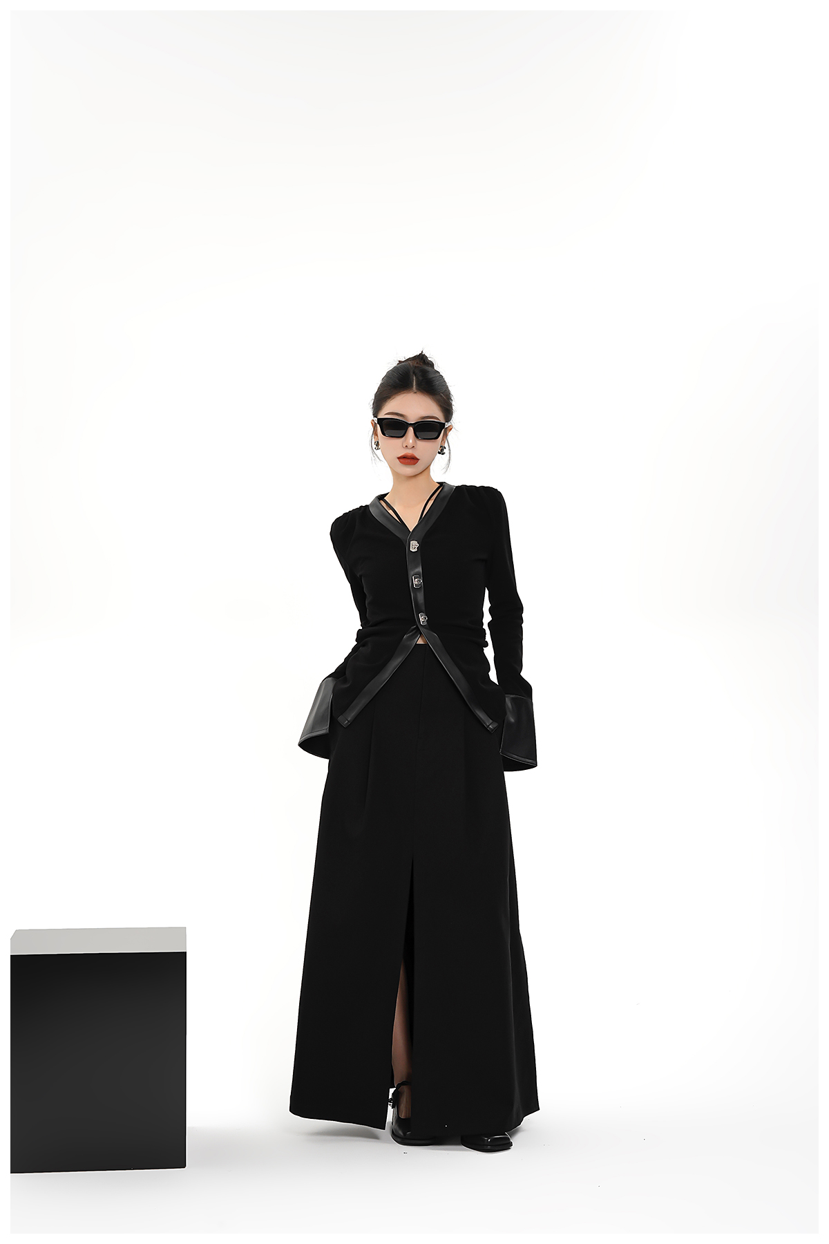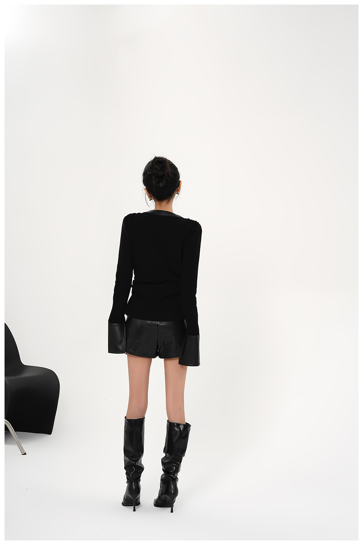 SRYS拼皮收腰顯瘦高腰長袖開衫黑色V領短外套襯衫上衣新款春裝女