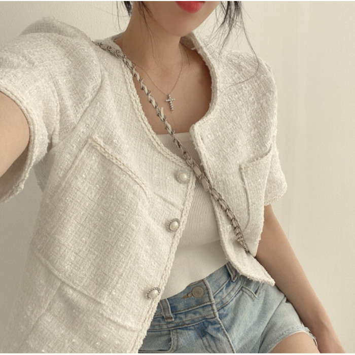 小香風韓系短袖開衫外套女裝夏季高級感小衆粗花呢絕美短款上衣潮