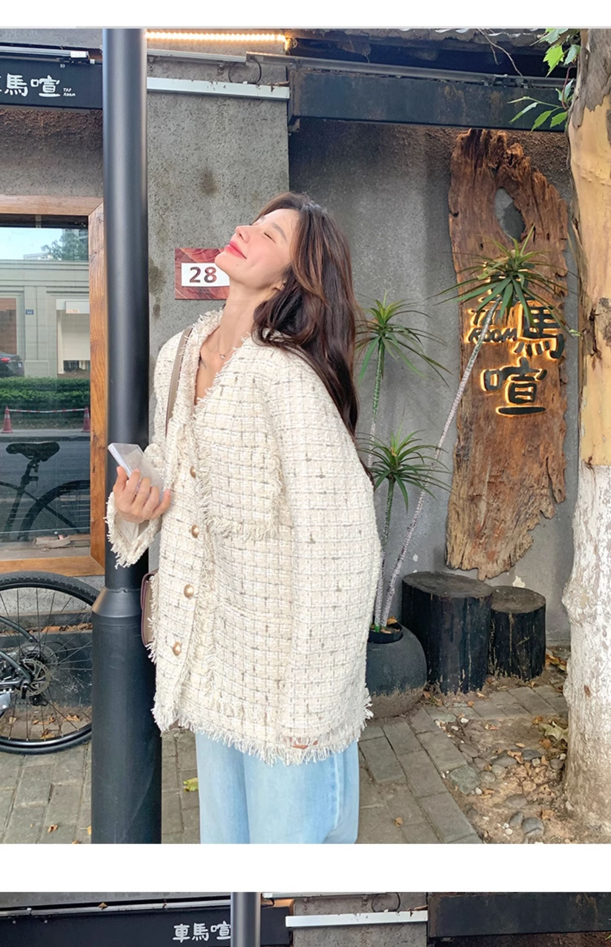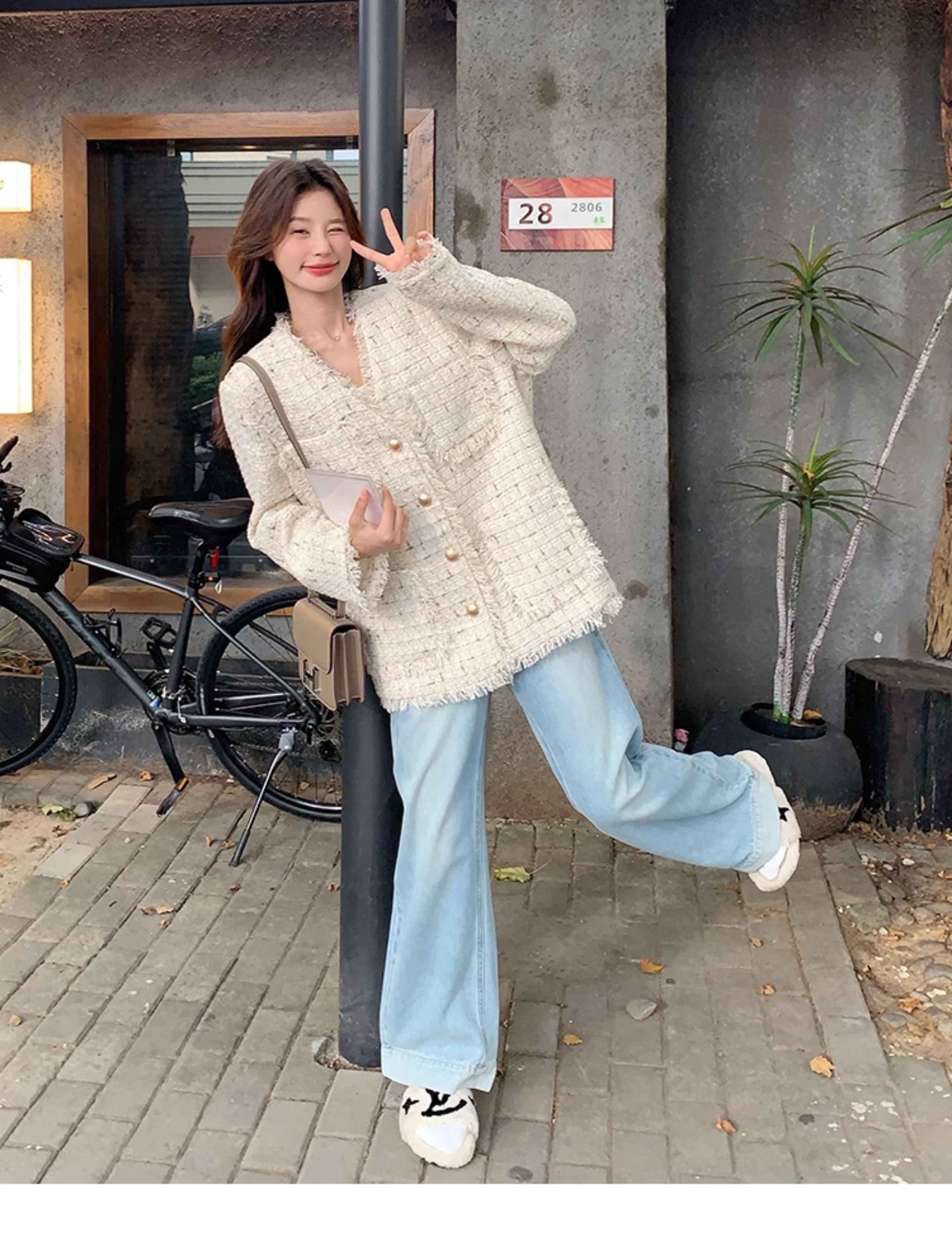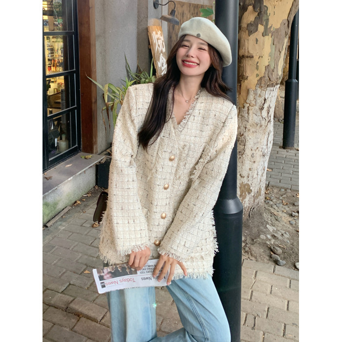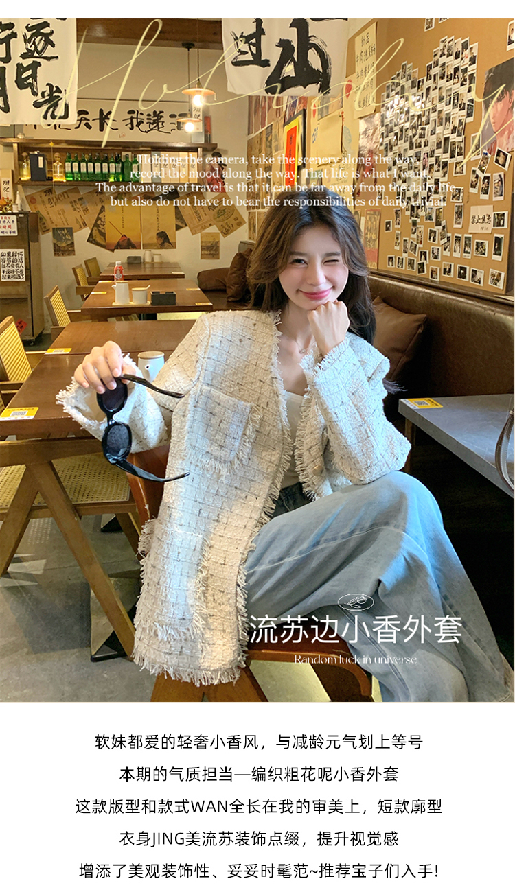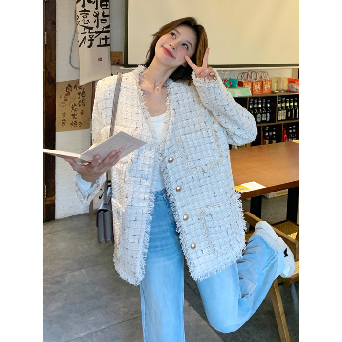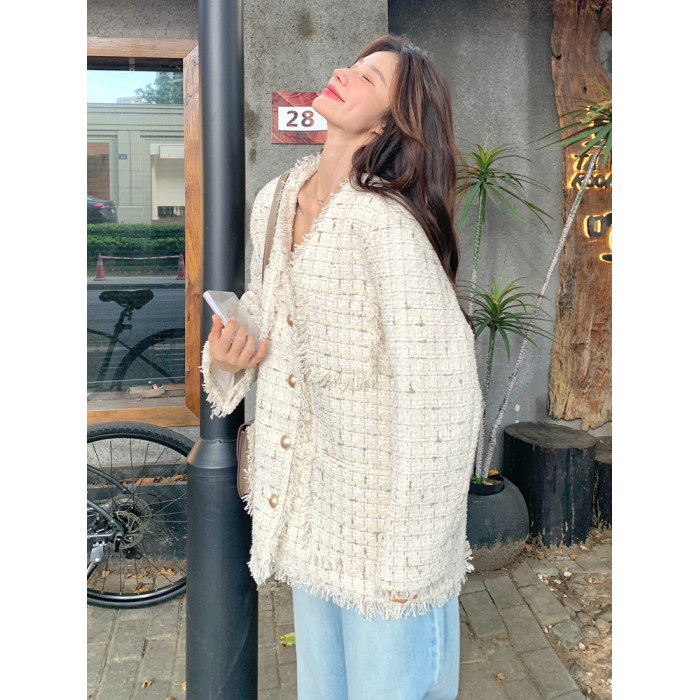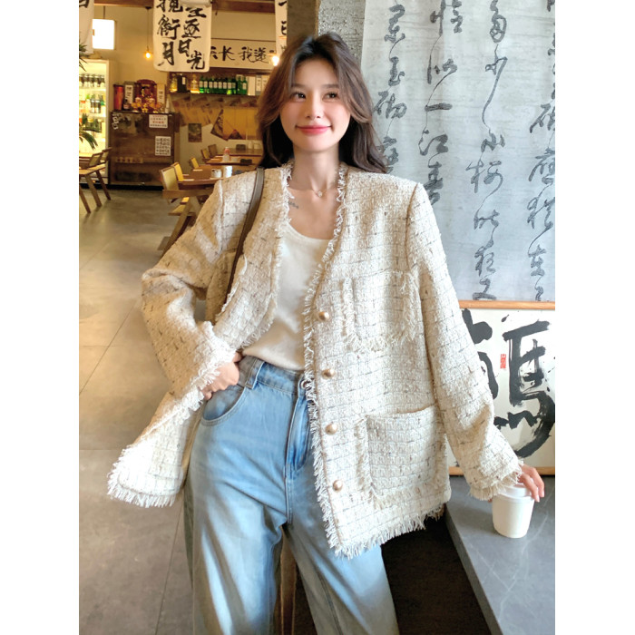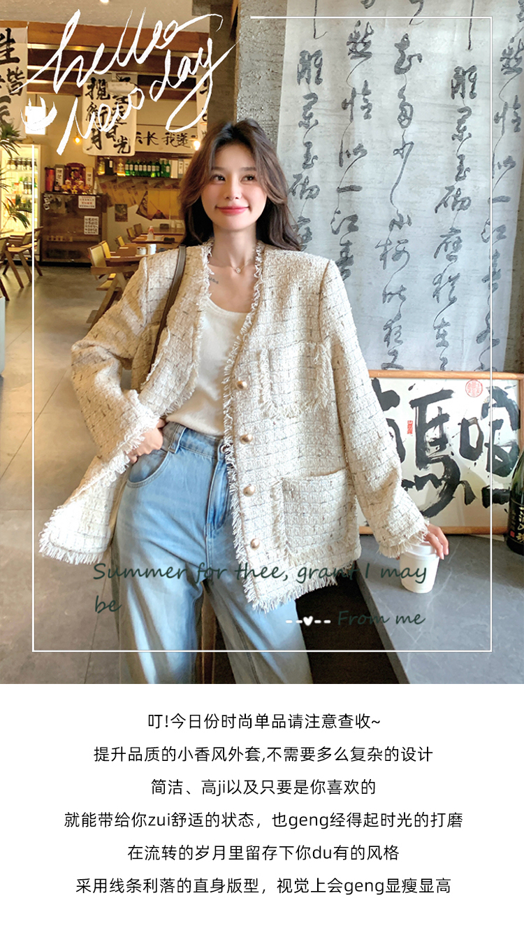小香風米白色V領外套女2025年秋季新款高級感名媛氣質粗花呢上衣