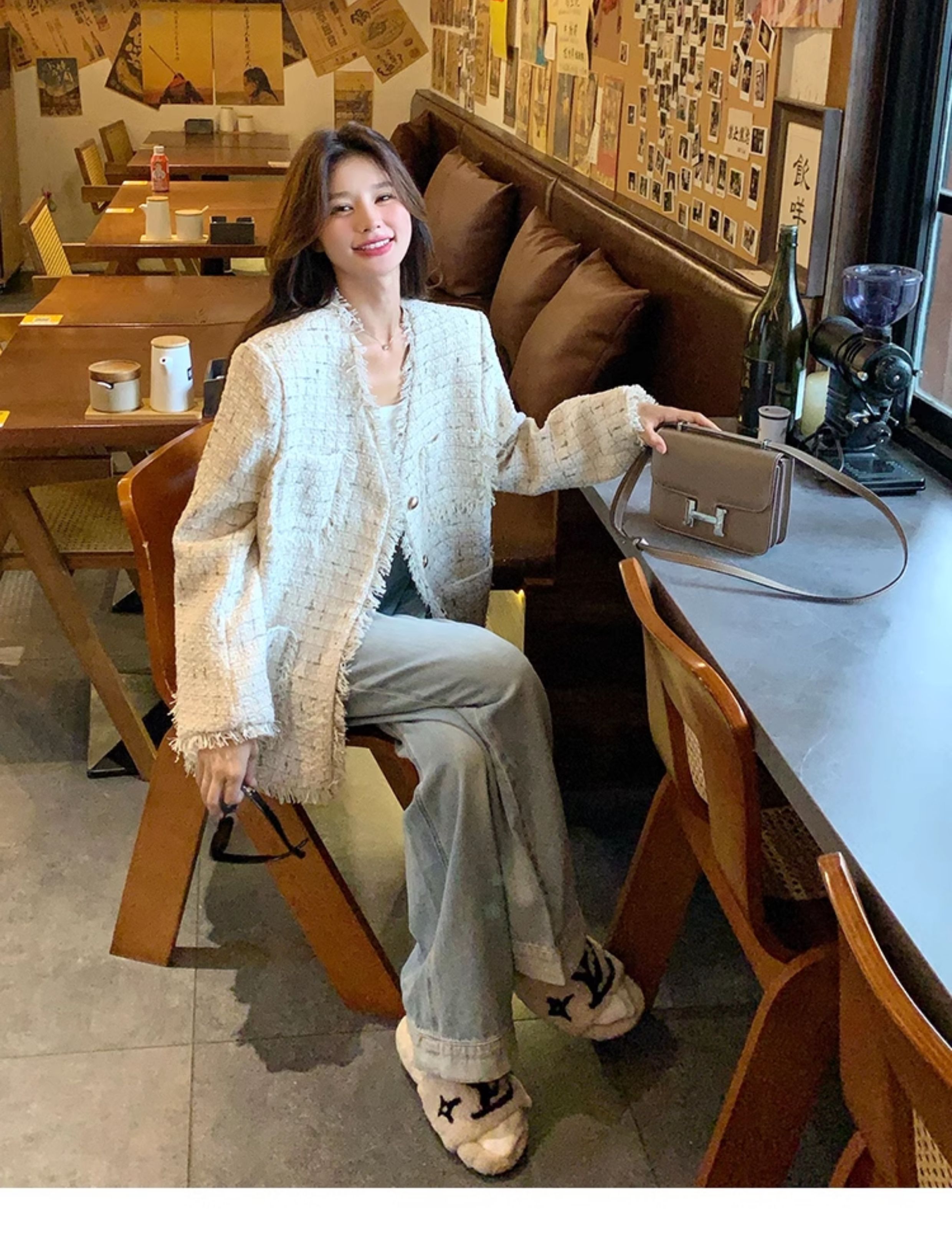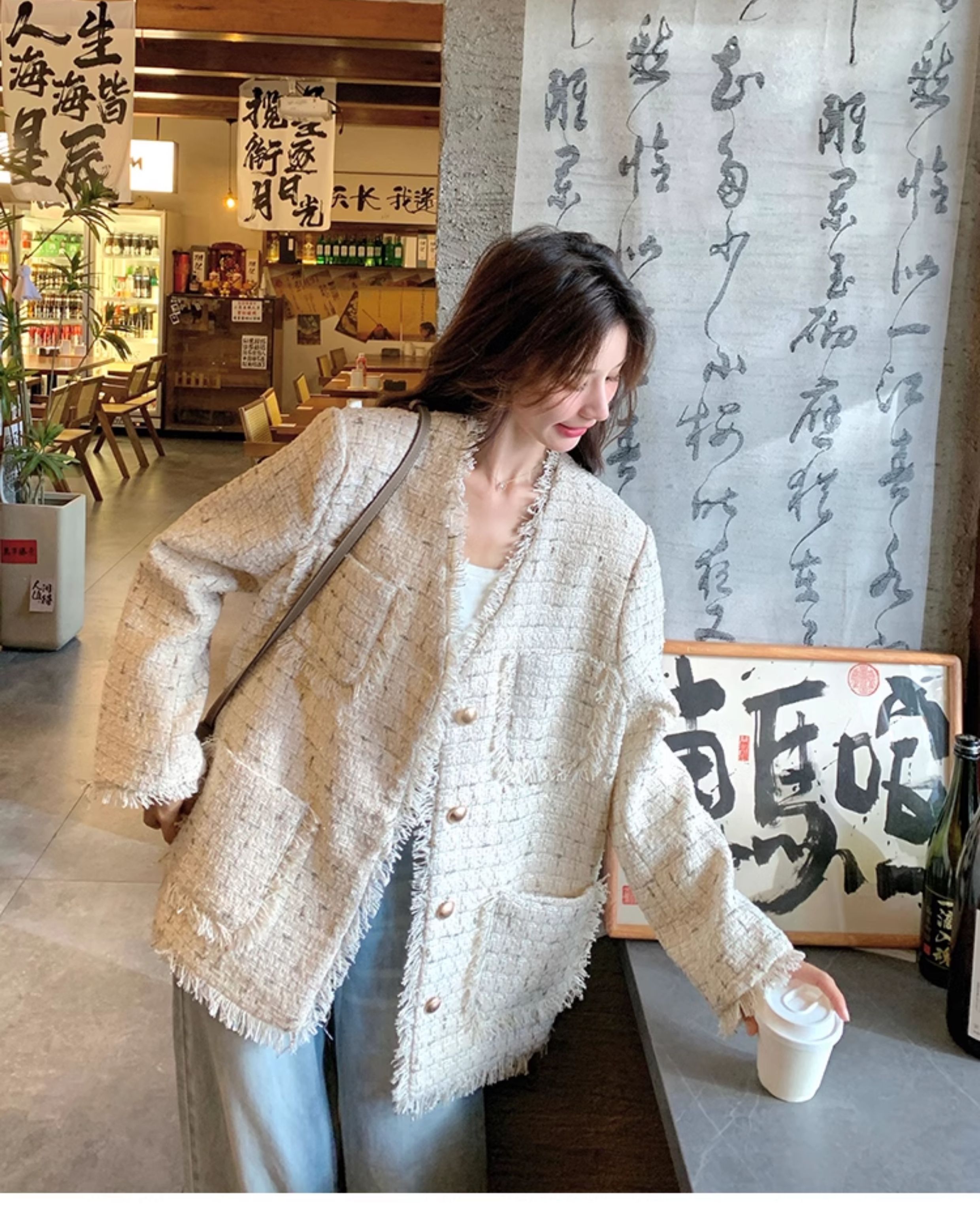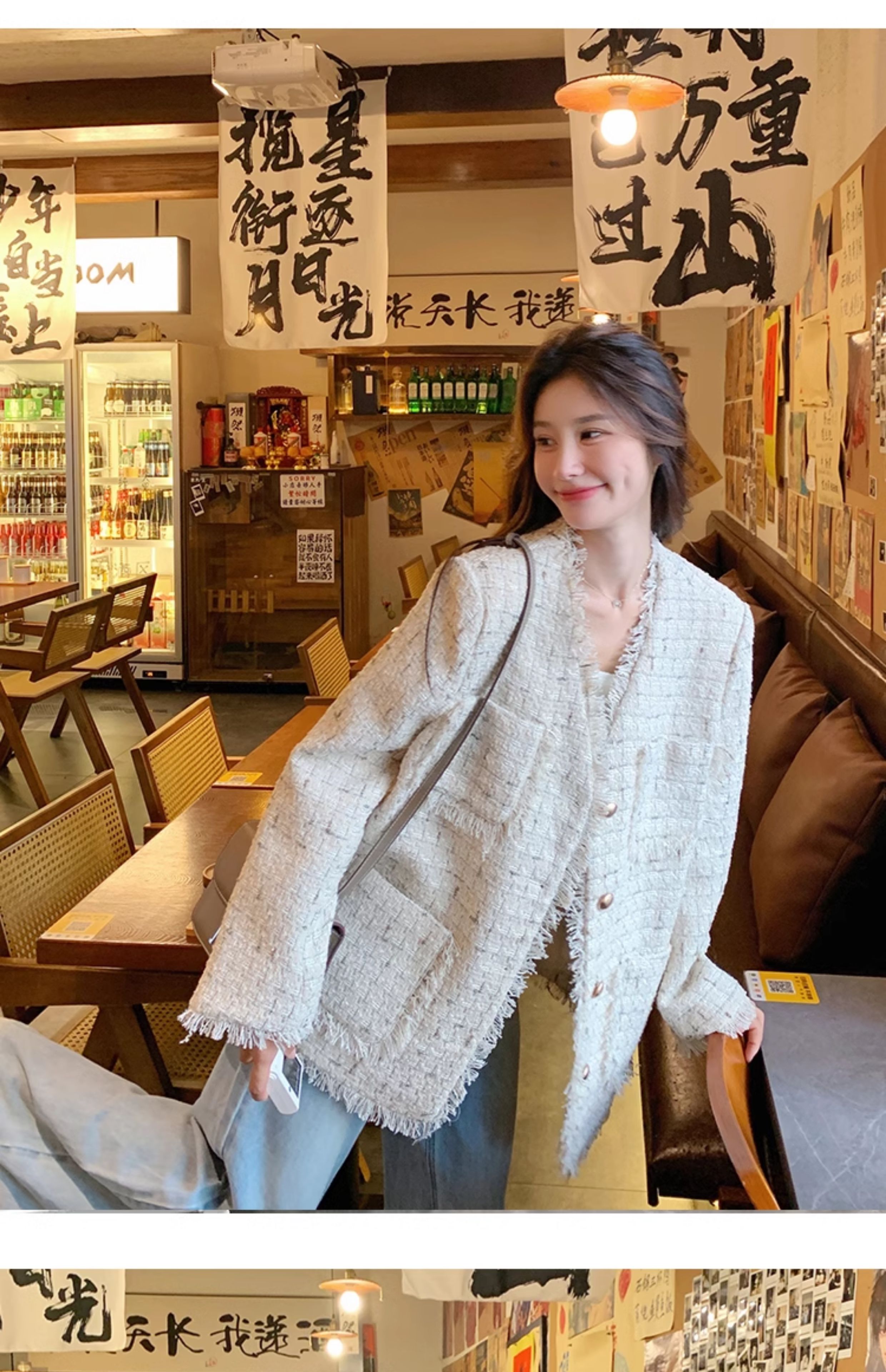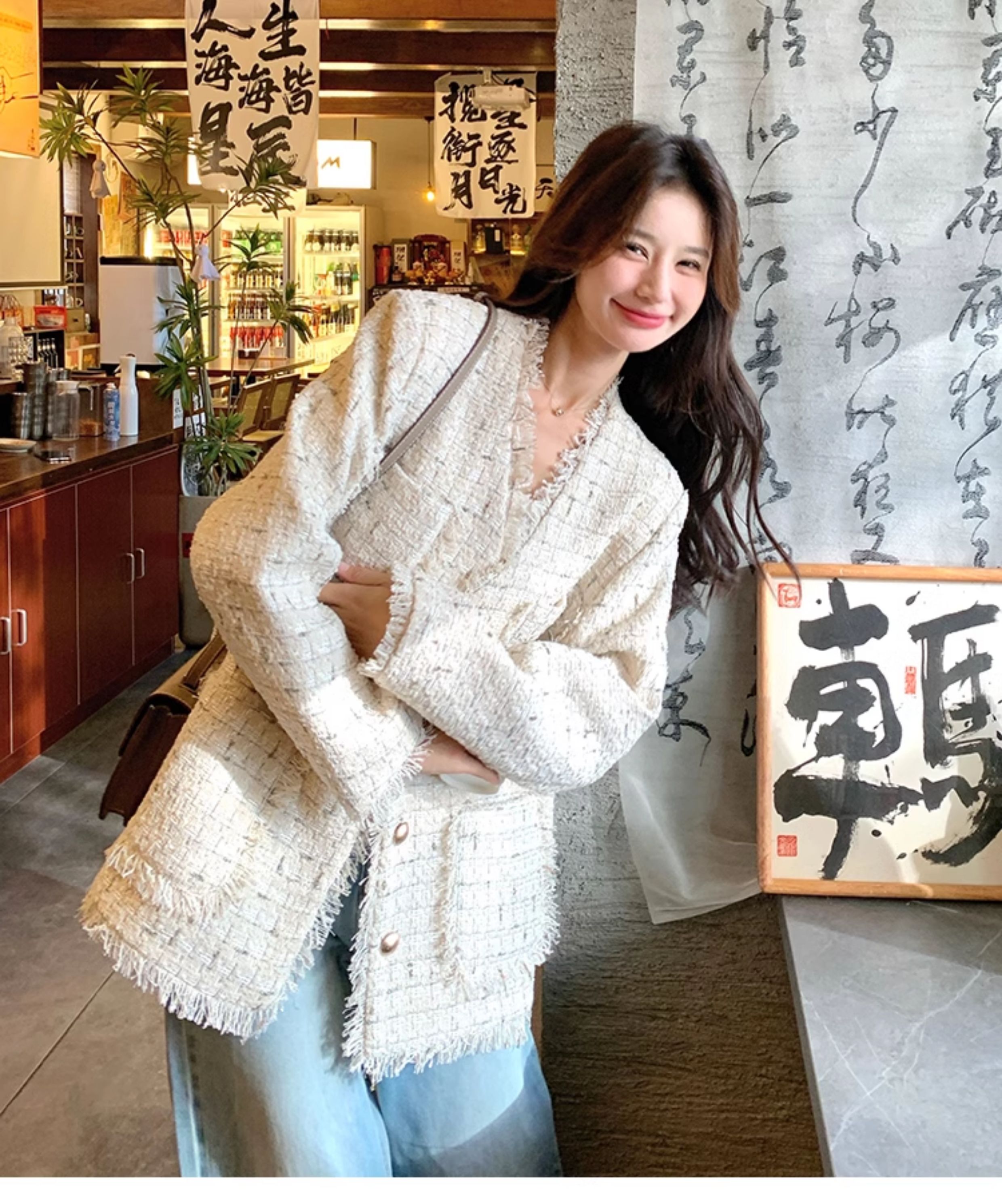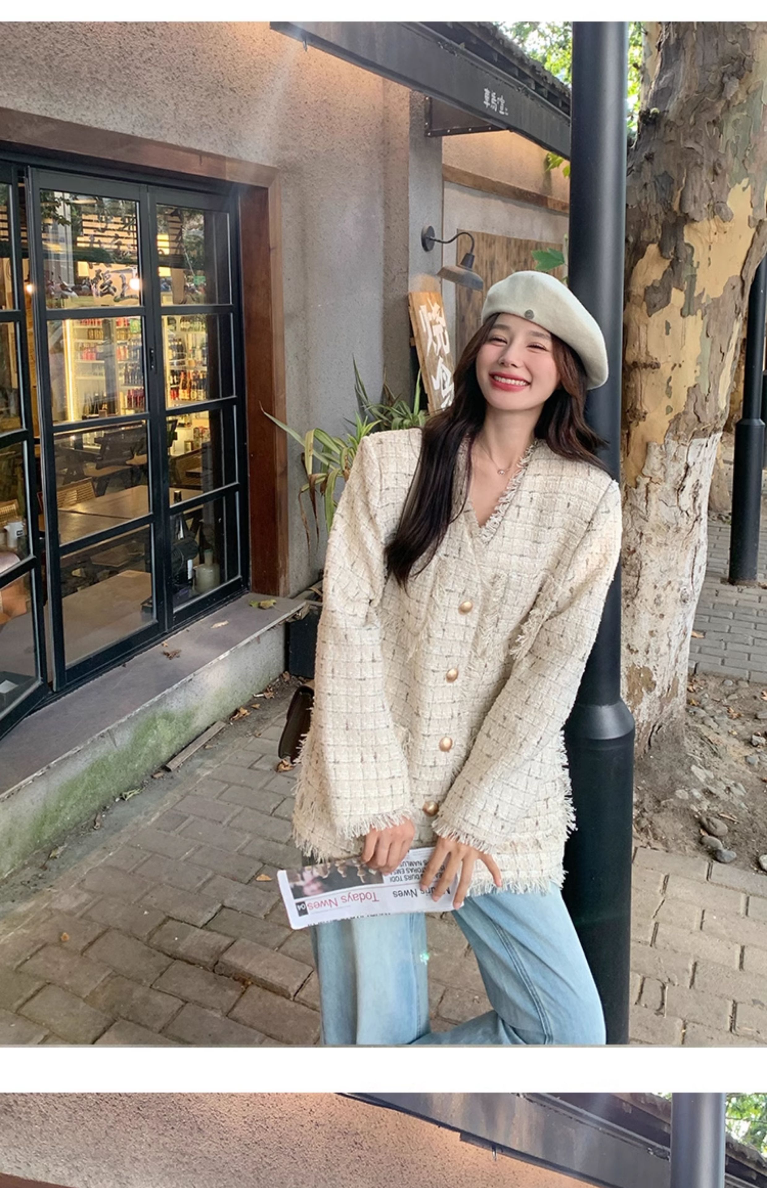 小香風米白色V領外套女2025年秋季新款高級感名媛氣質粗花呢上衣