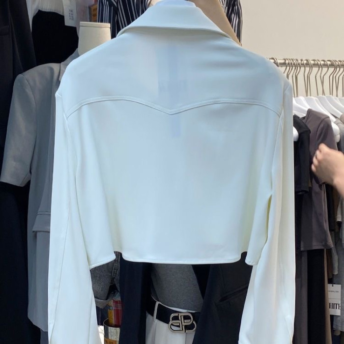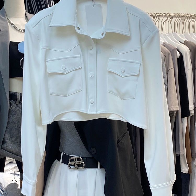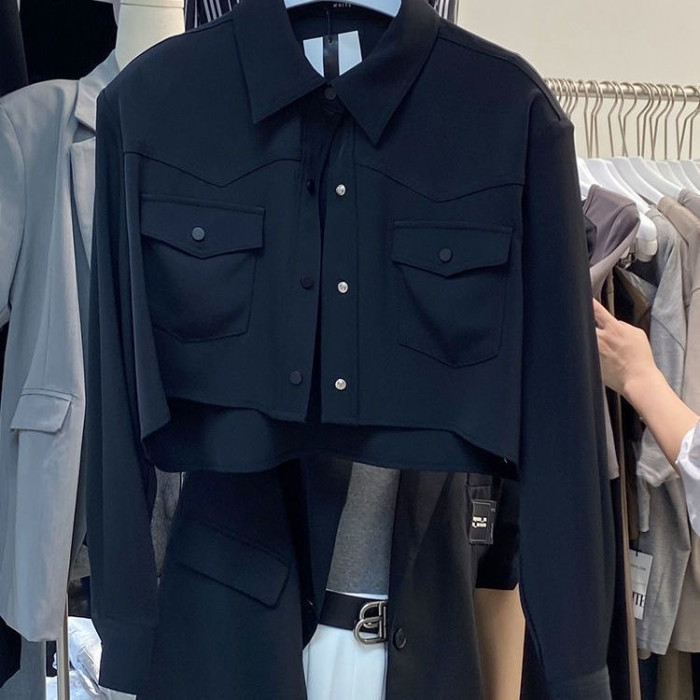 美式街頭風短款工裝夾克外套女高腰露臍長袖翻領口袋小西裝ins潮
