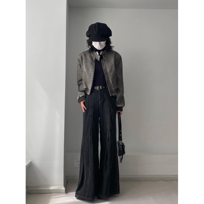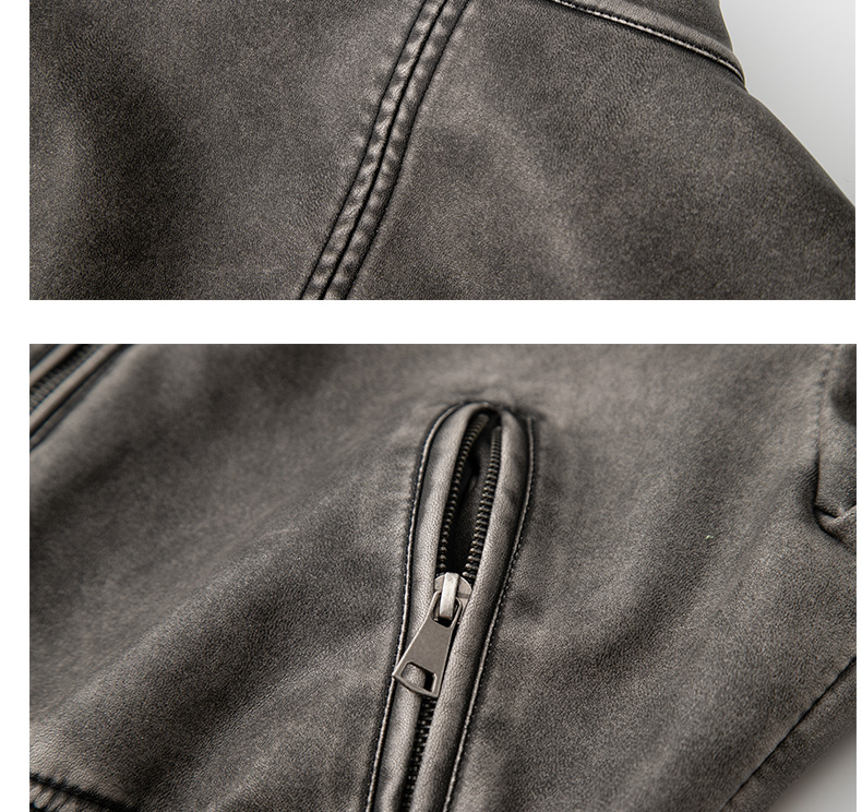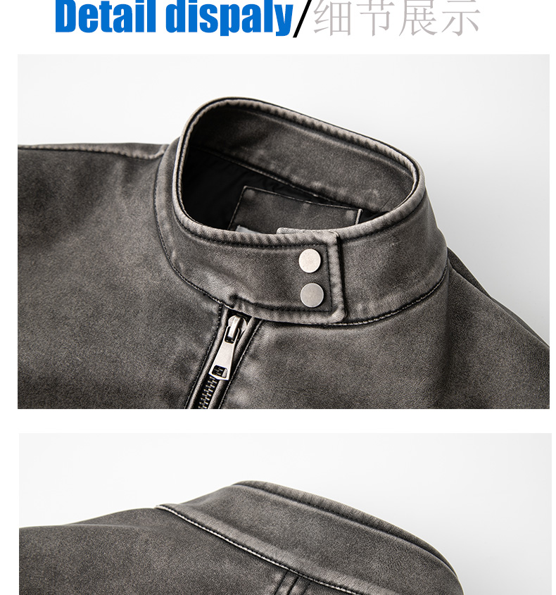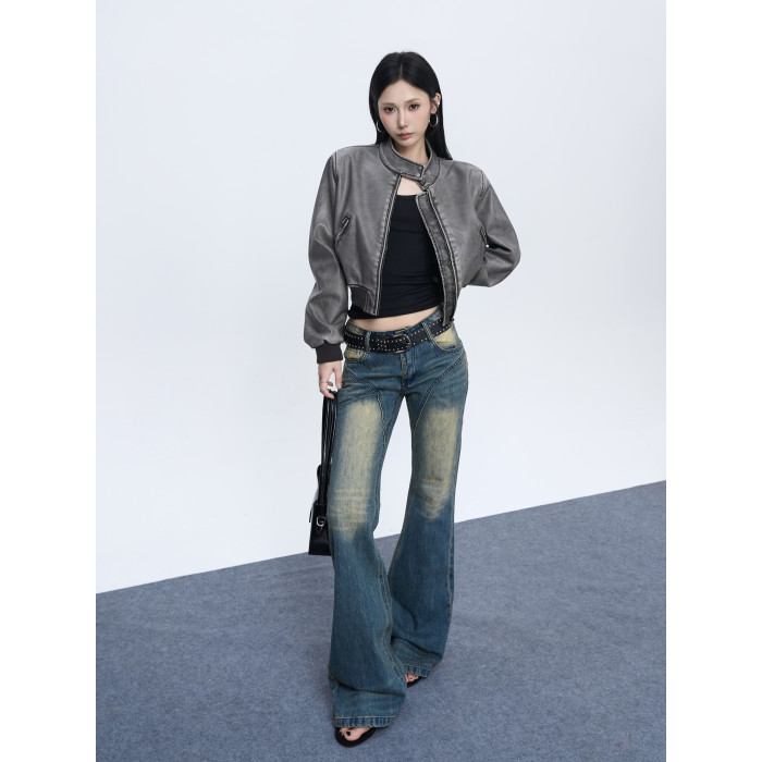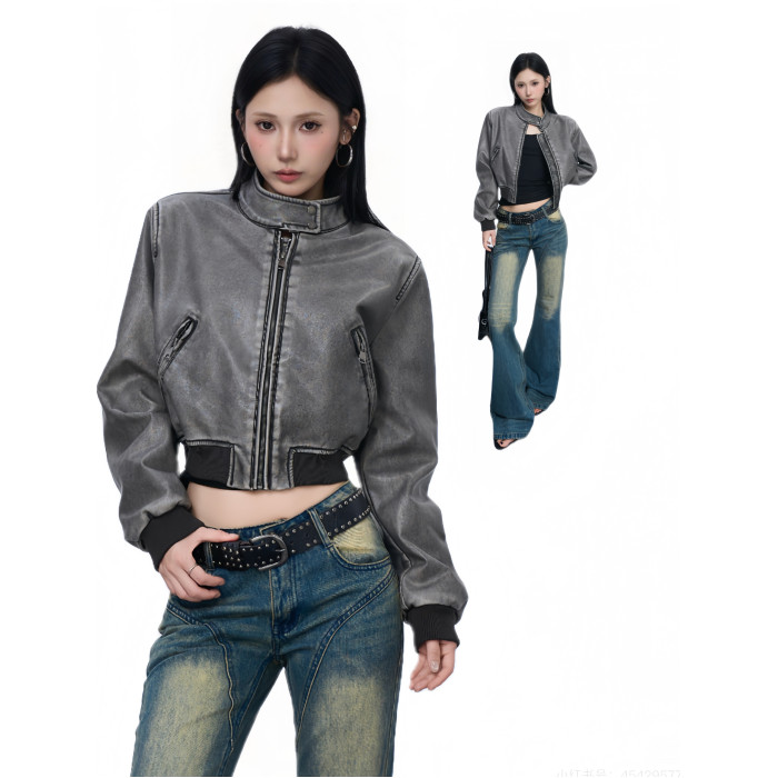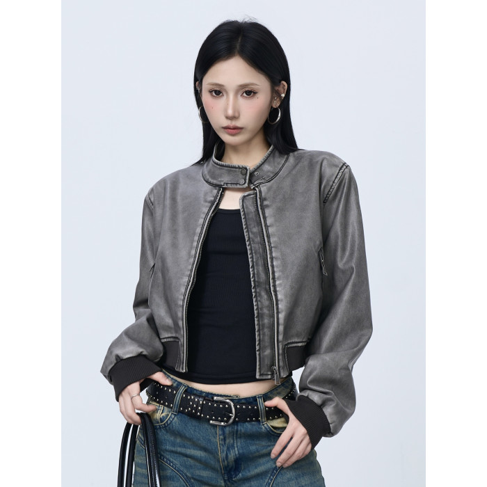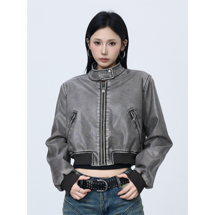 NOAYTOK 淺咖褪色水洗短款復古做舊辣妹修身拼接皮夾克女