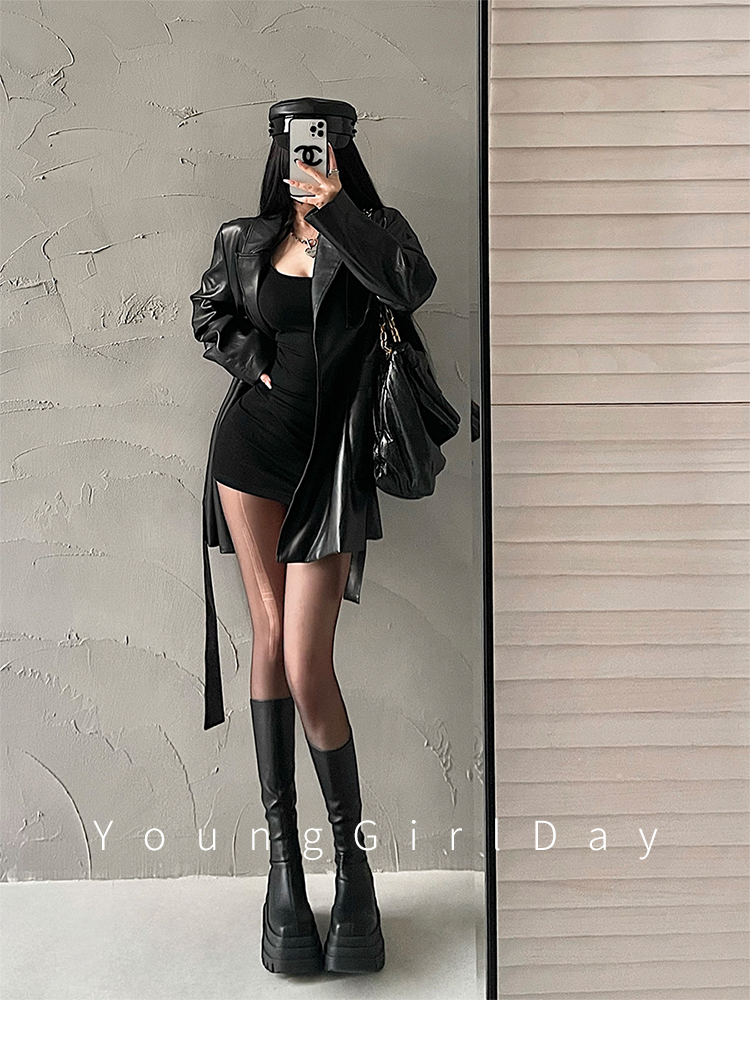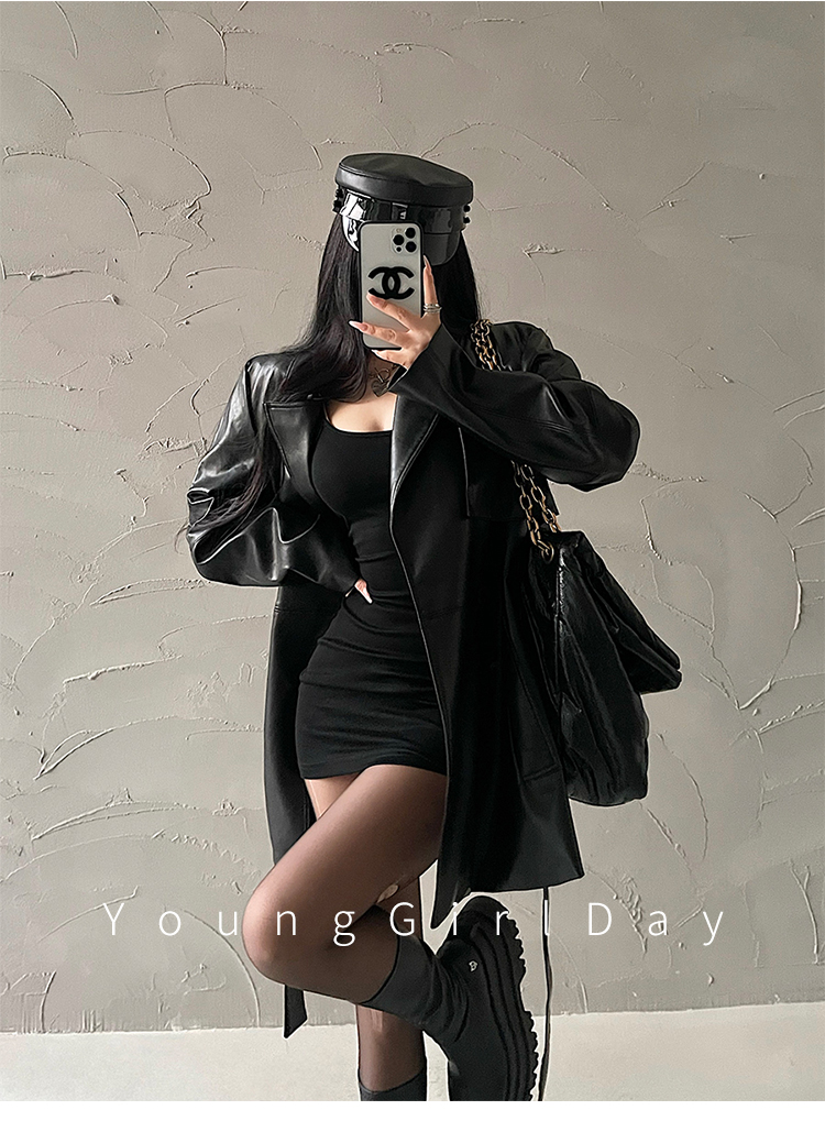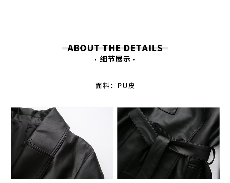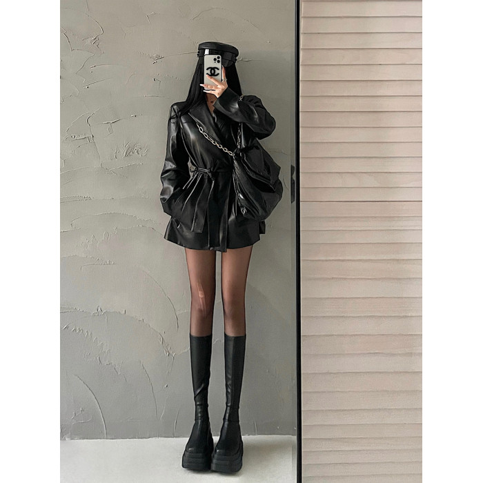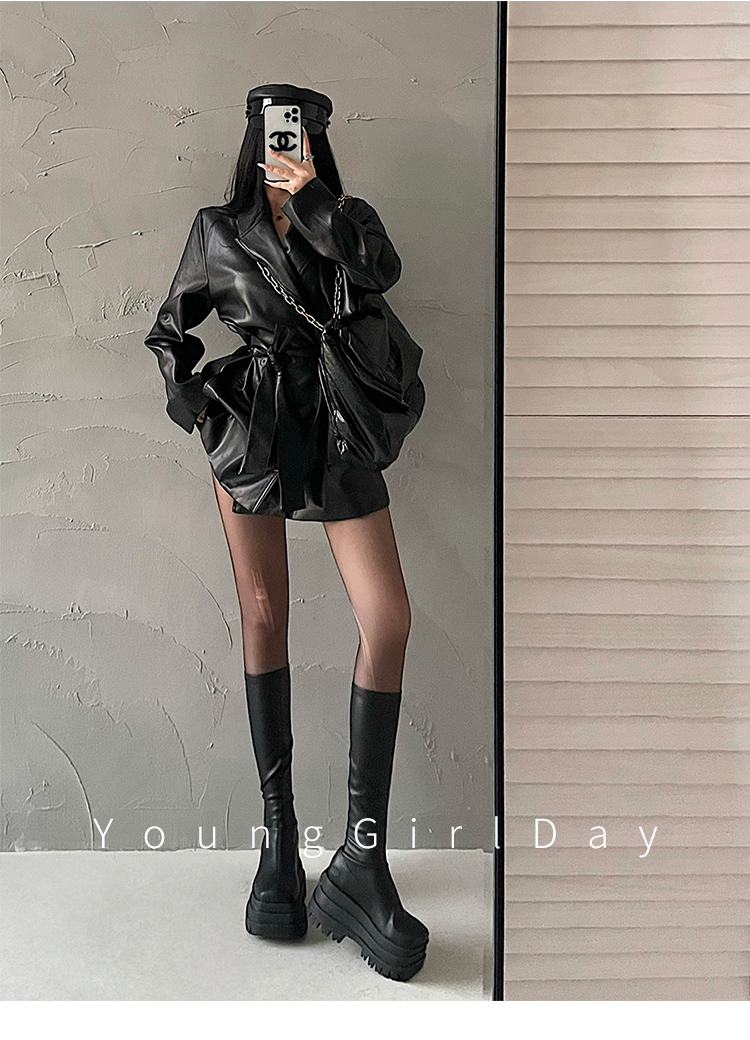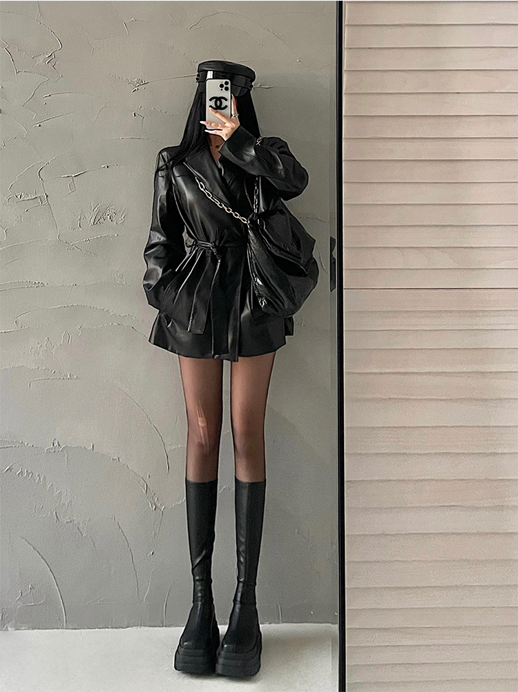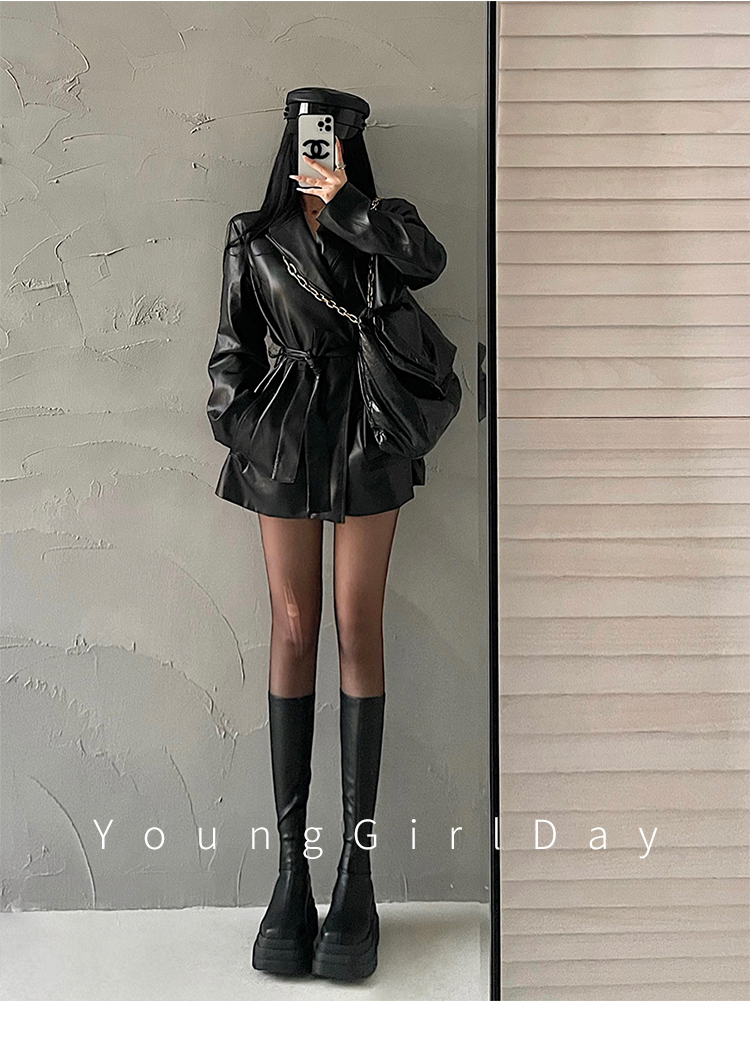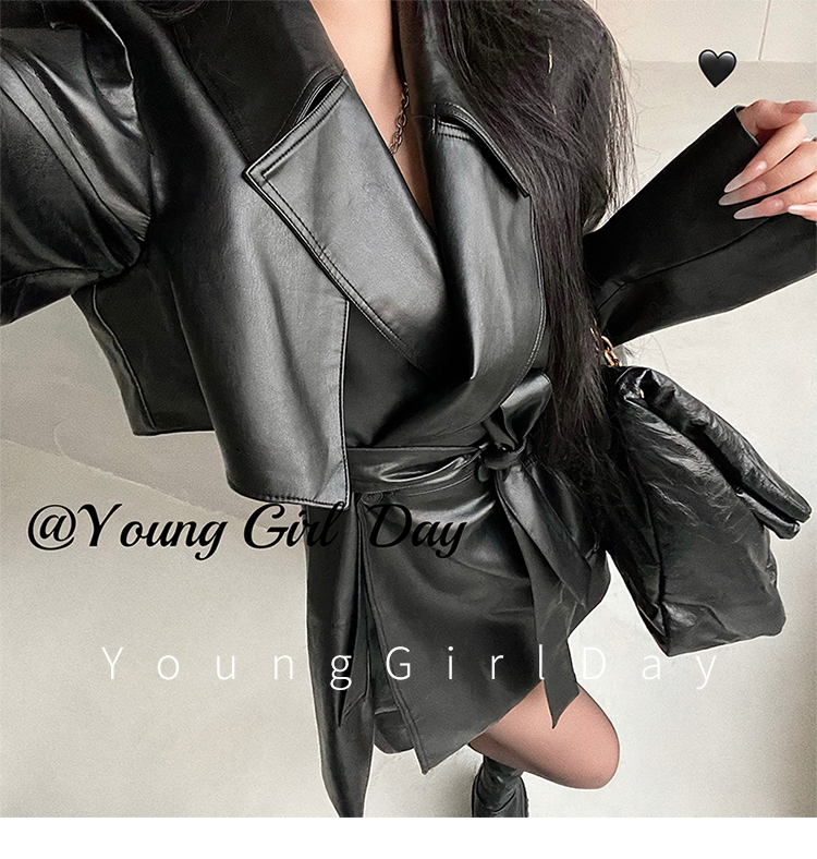 YoungGirlDay歐美時髦翻領寬松系帶收腰中長款pu皮衣機車服外套女