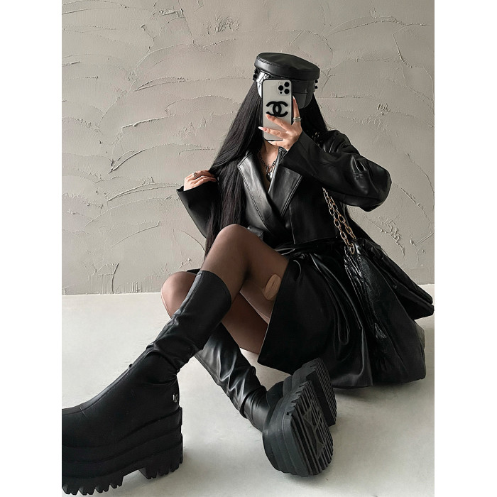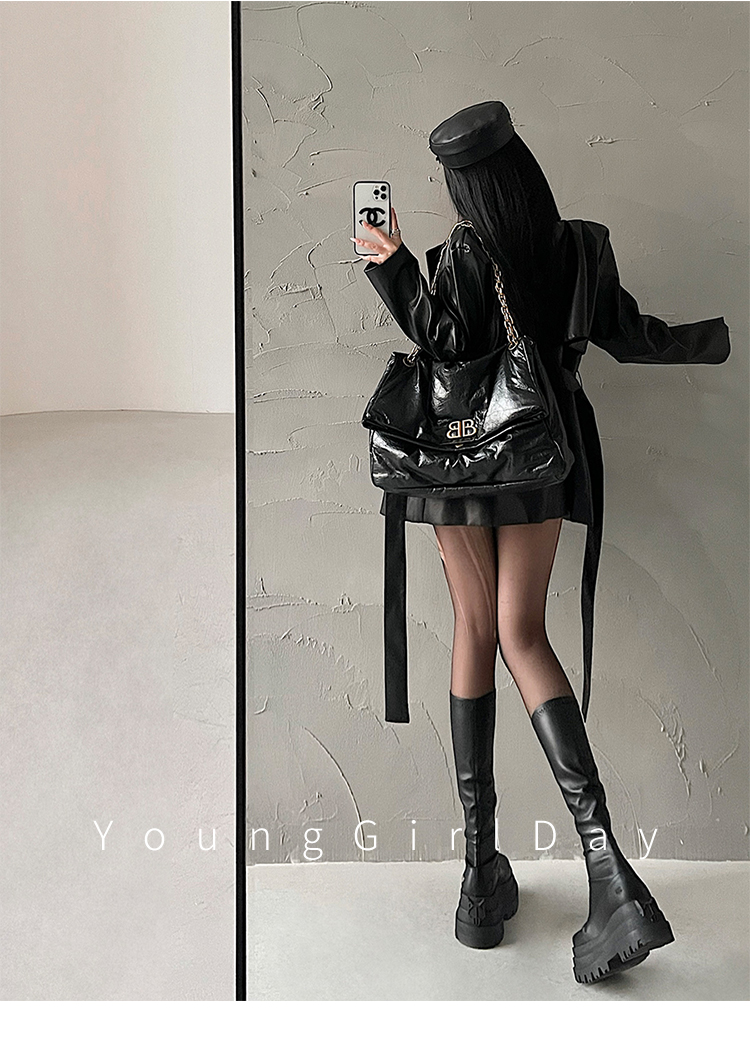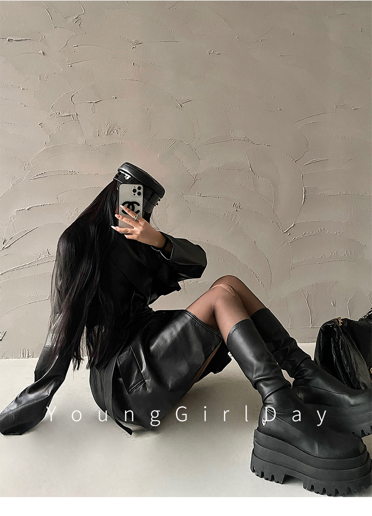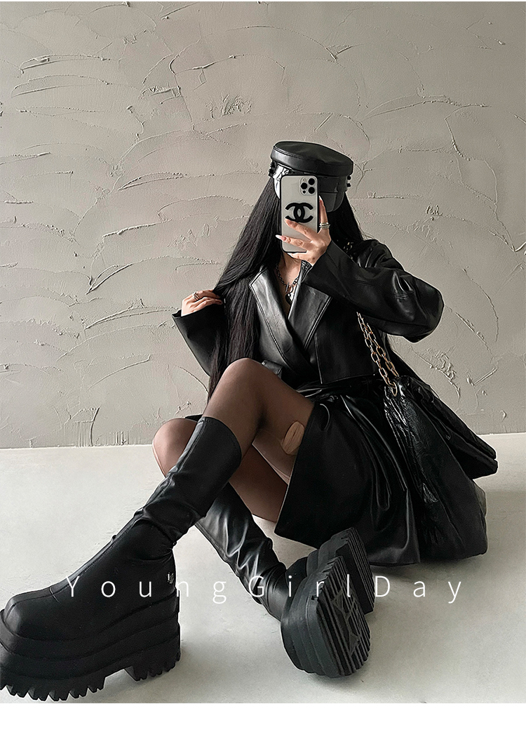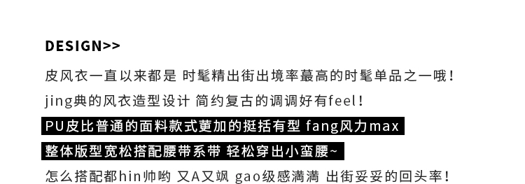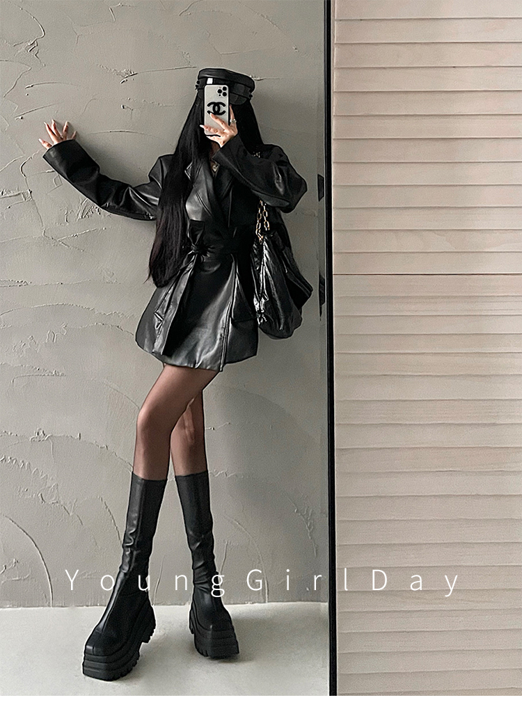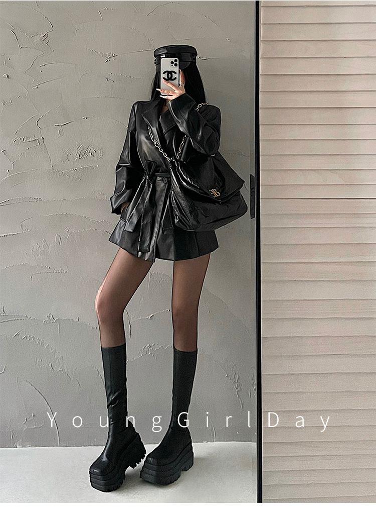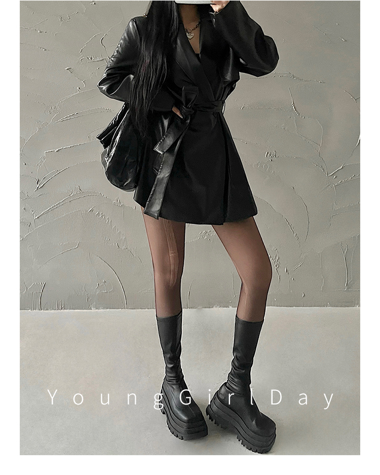 YoungGirlDay歐美時髦翻領寬松系帶收腰中長款pu皮衣機車服外套女