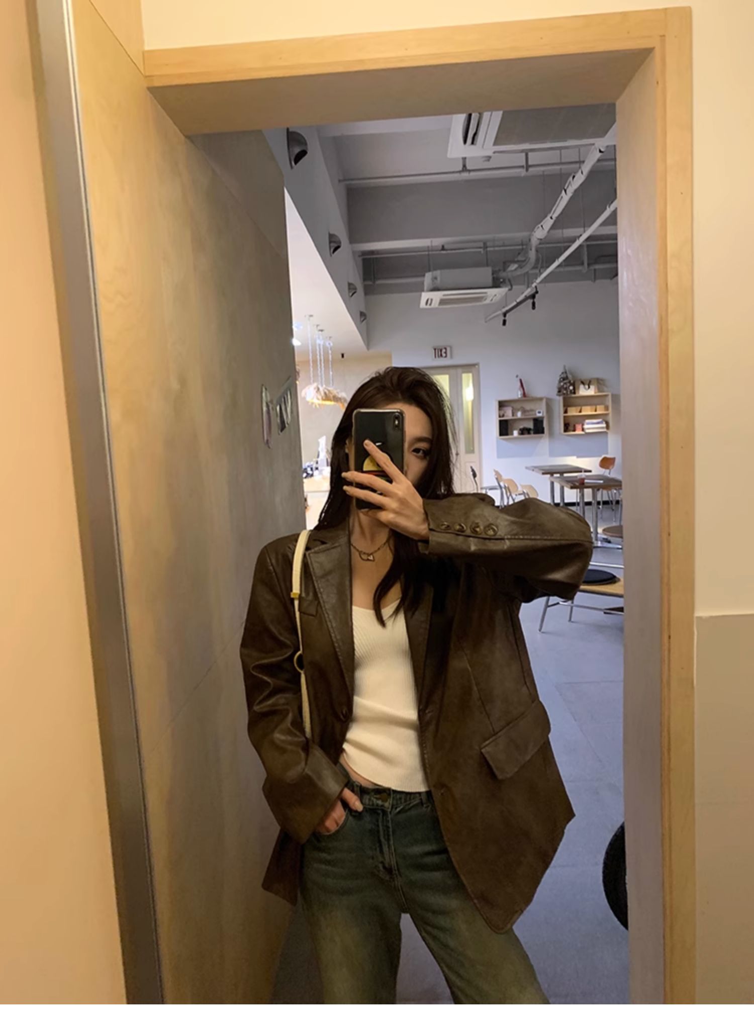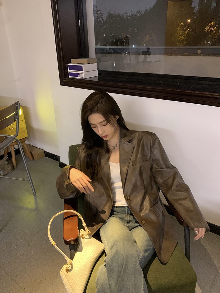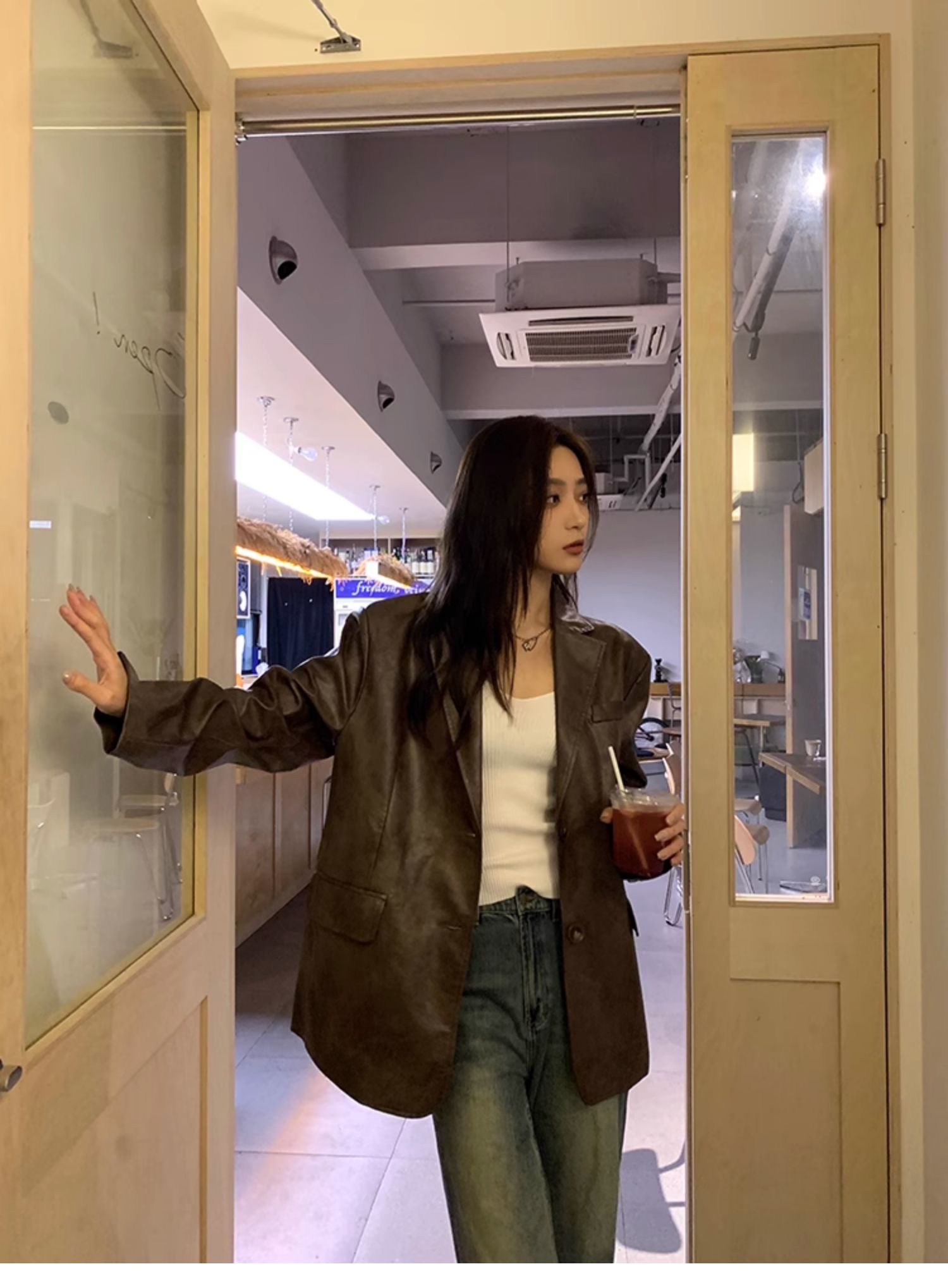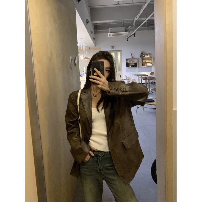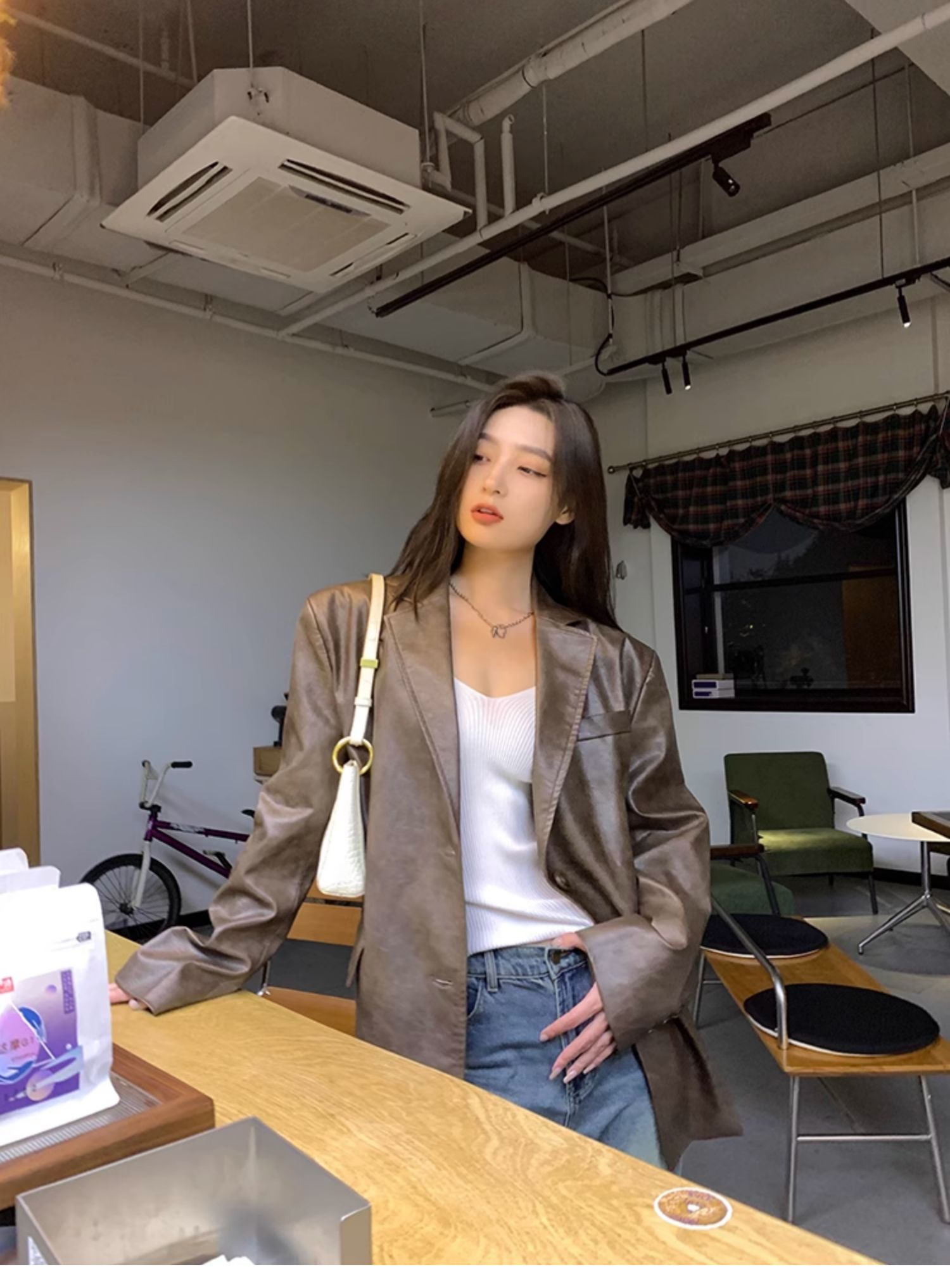美拉德皮衣穿搭2025早春秋季新款棕色美式復古氣質西裝pu皮外套女