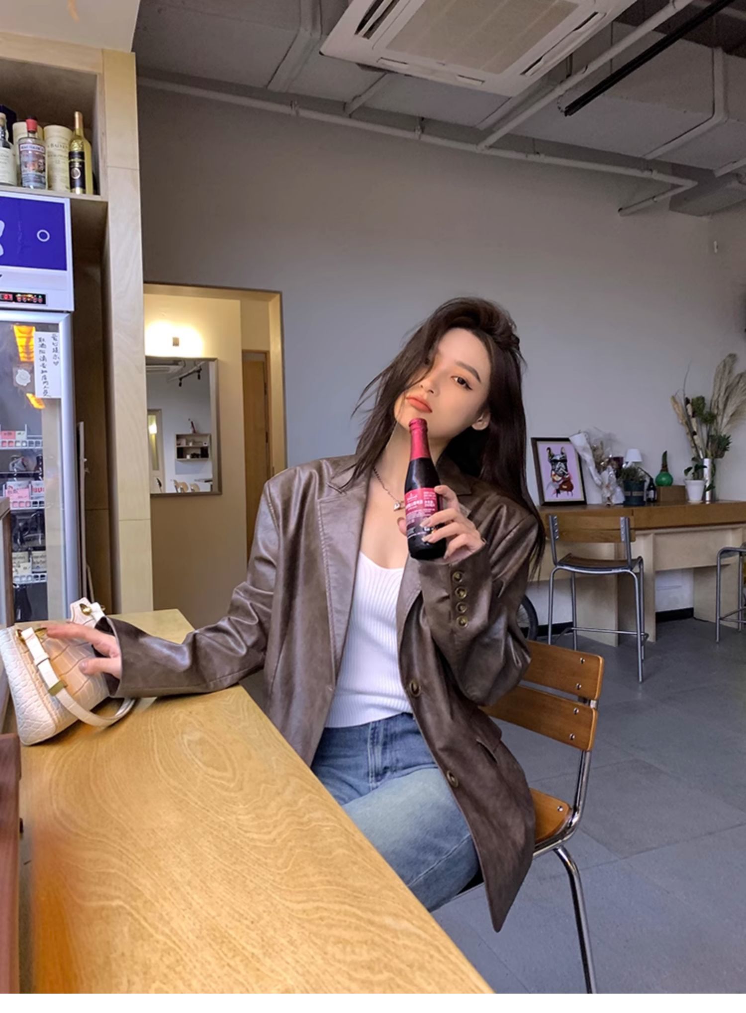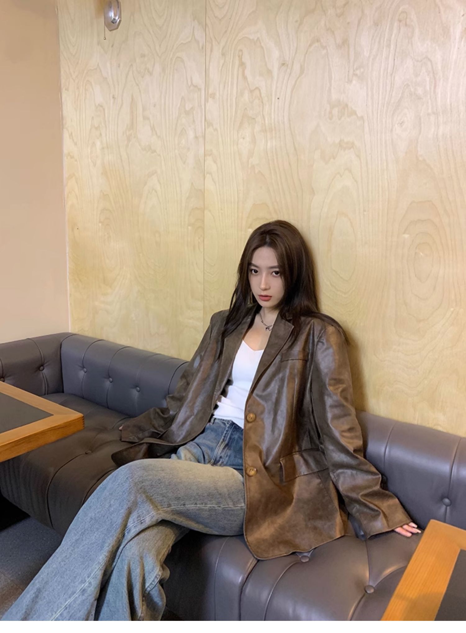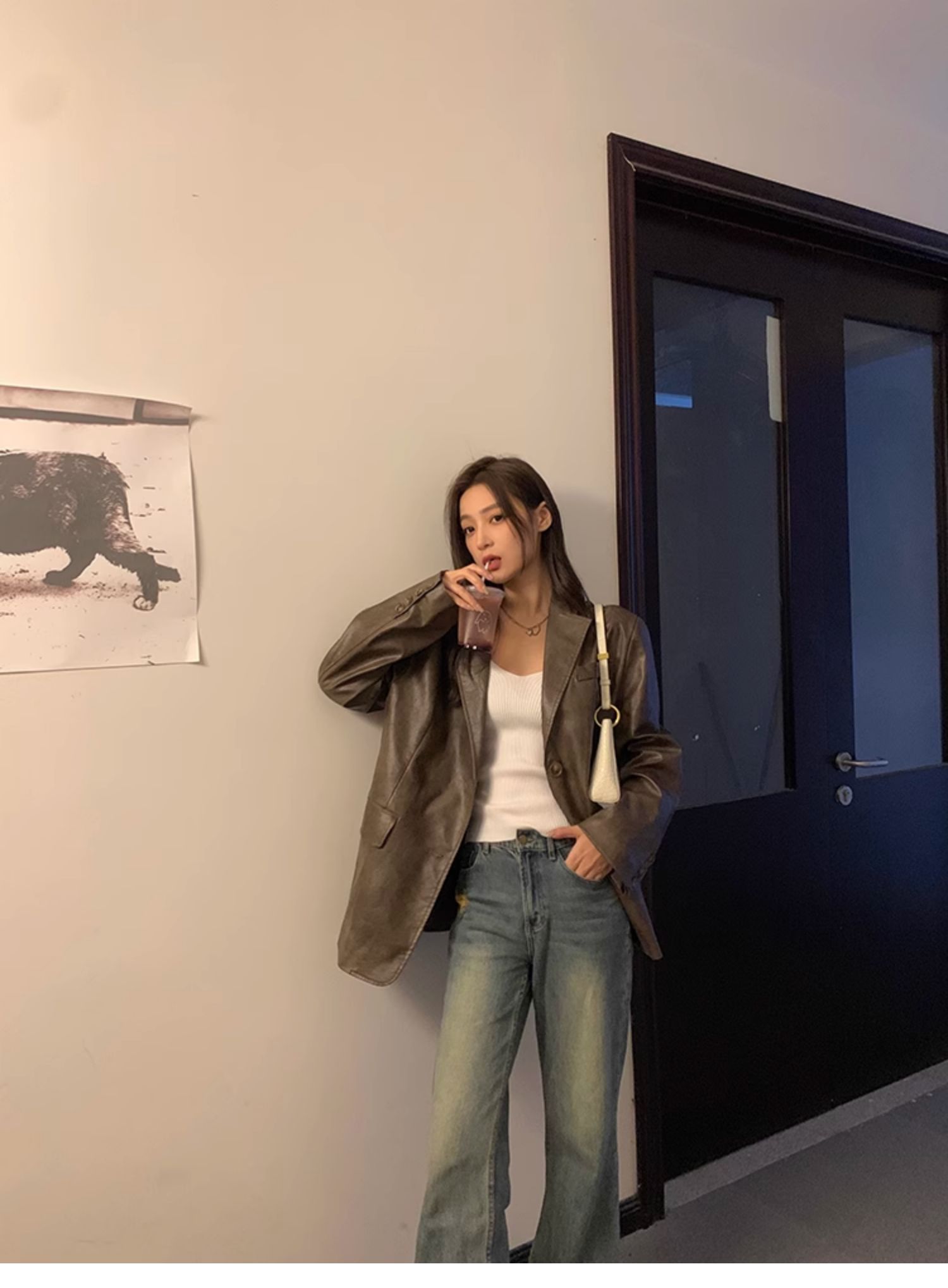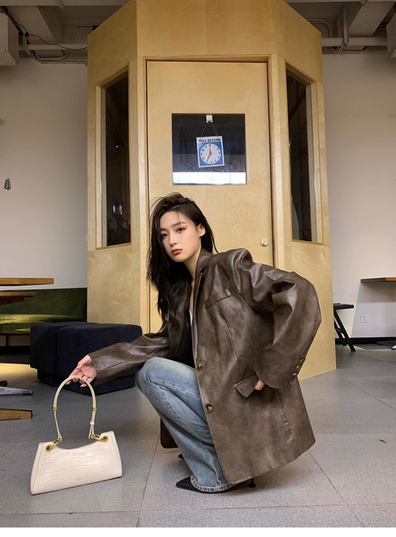 美拉德皮衣穿搭2025早春秋季新款棕色美式復古氣質西裝pu皮外套女