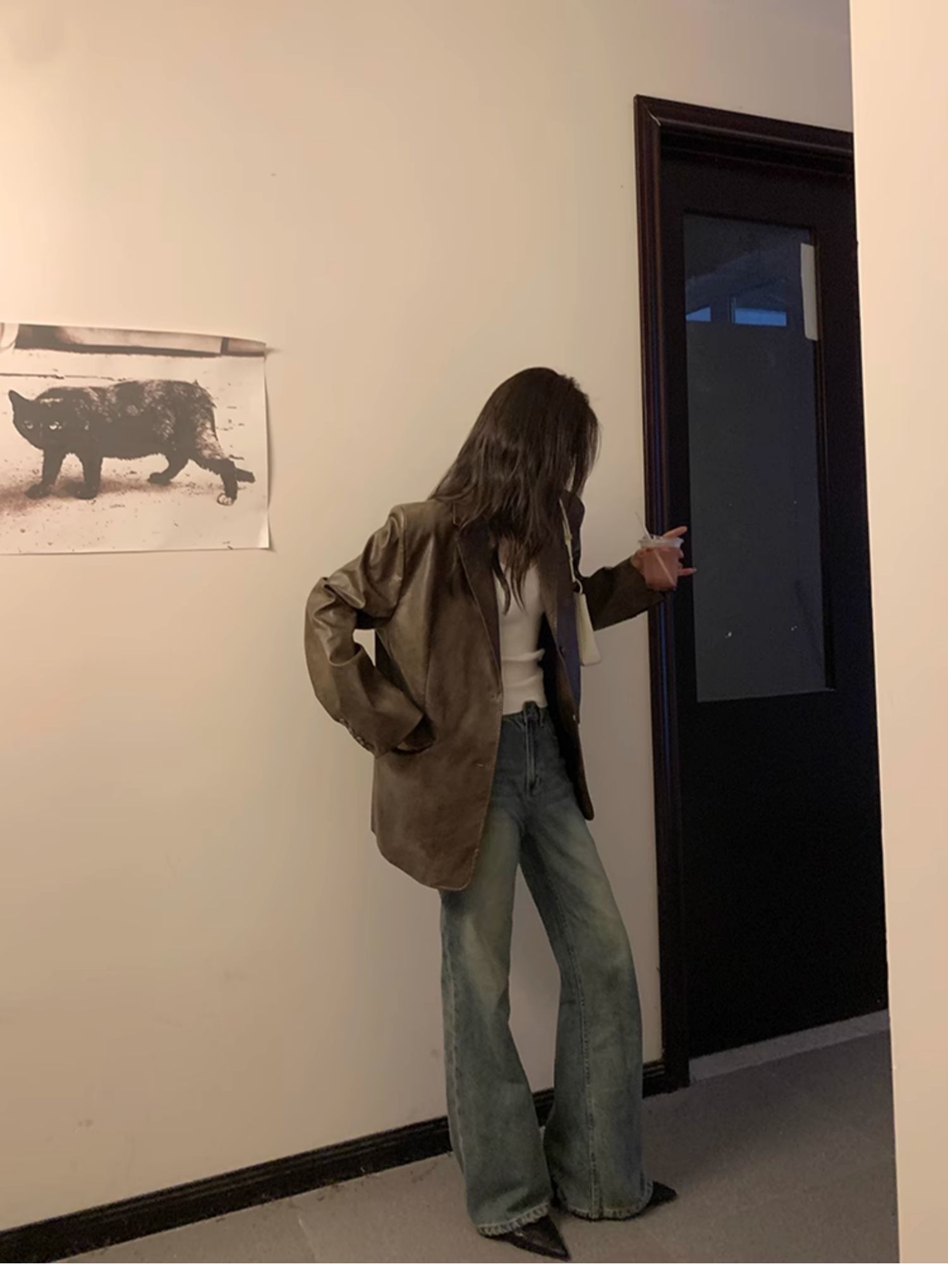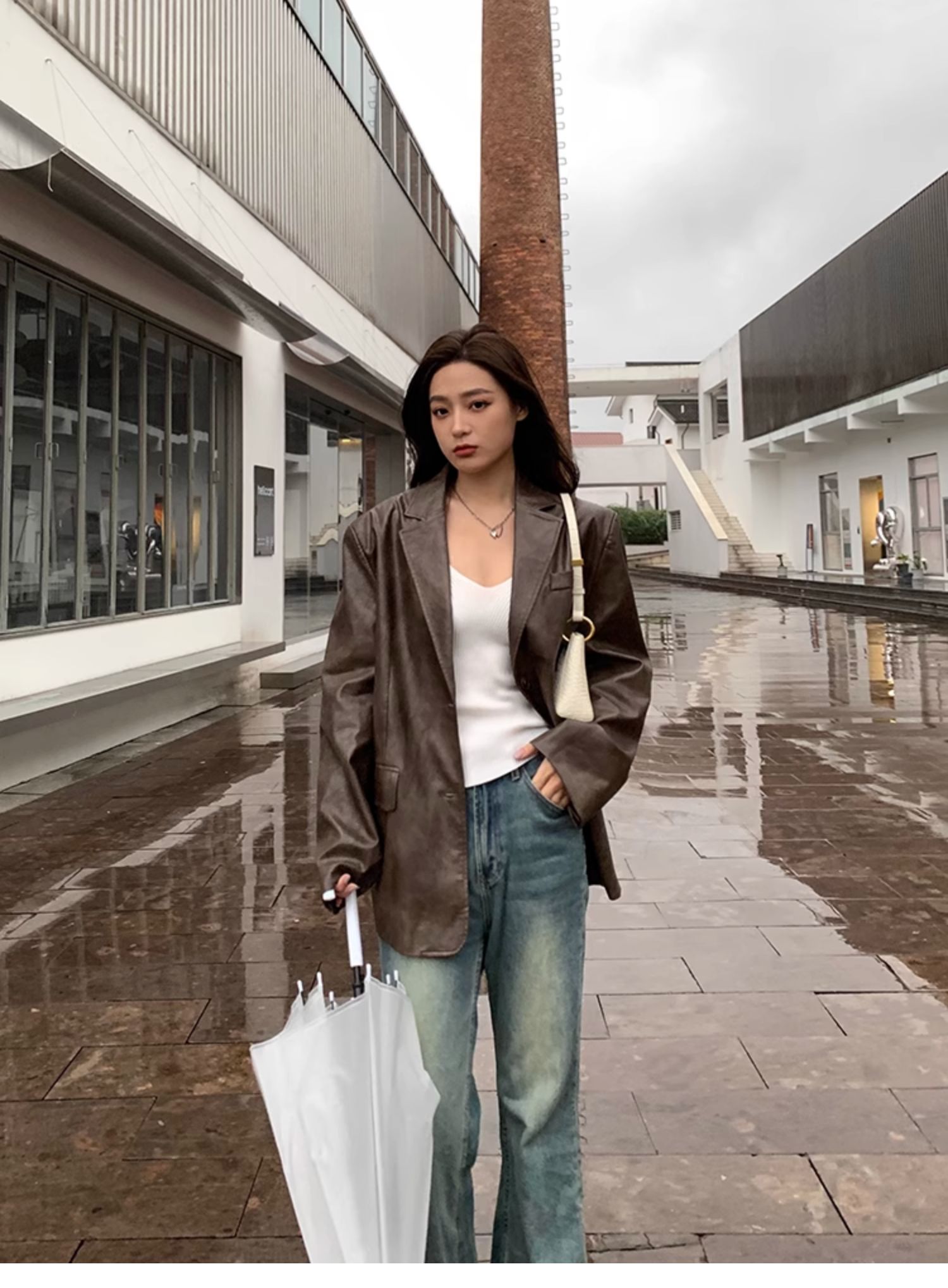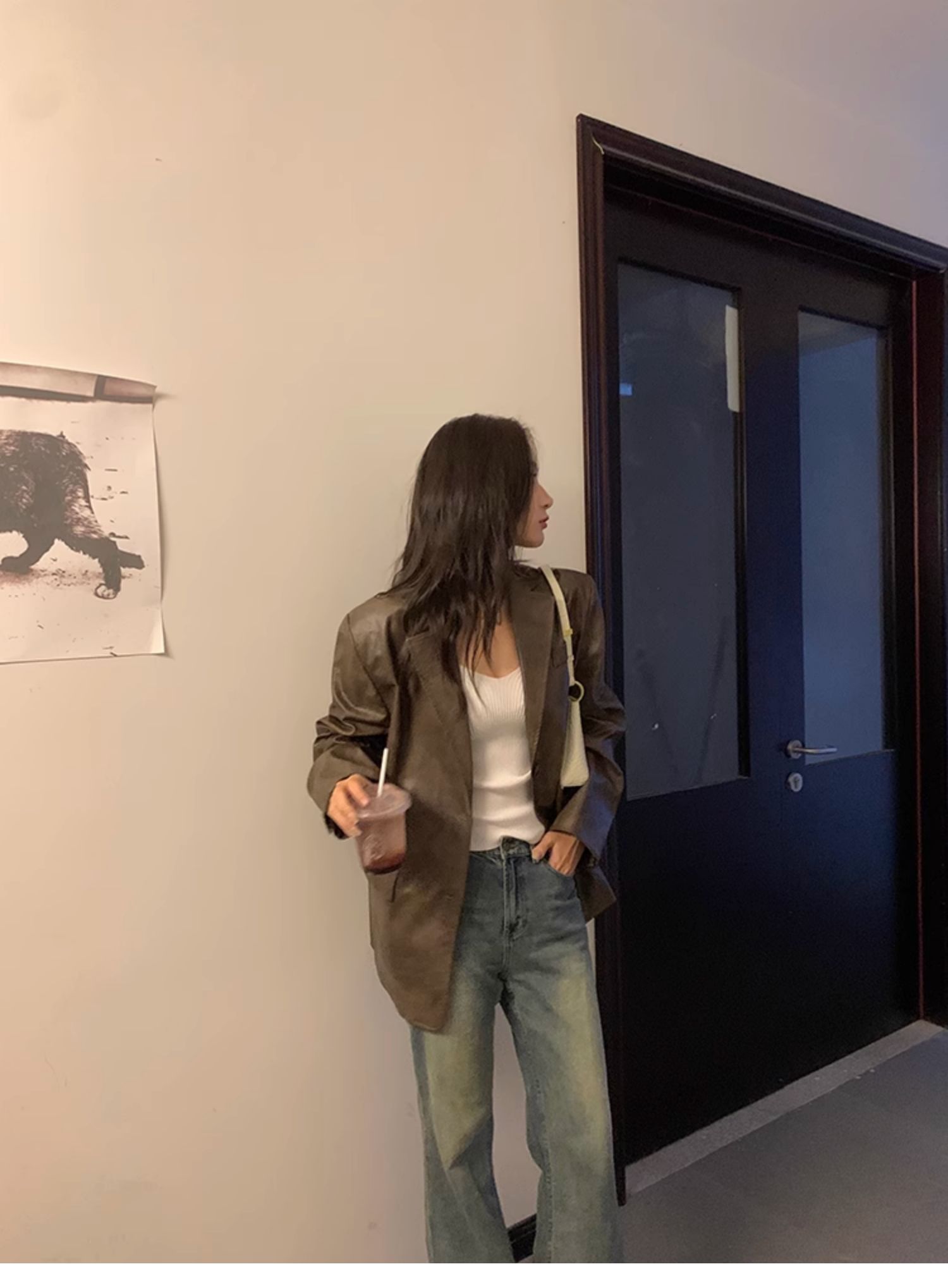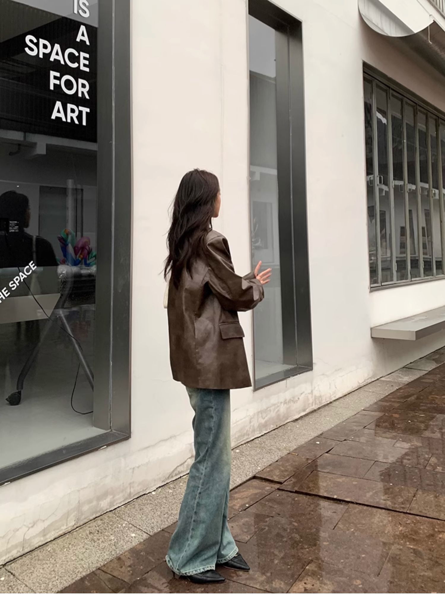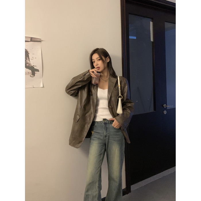 美拉德皮衣穿搭2025早春秋季新款棕色美式復古氣質西裝pu皮外套女