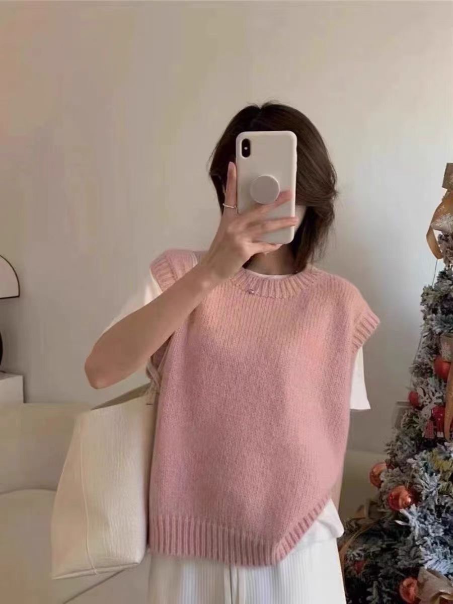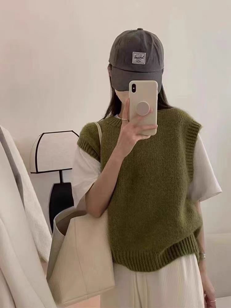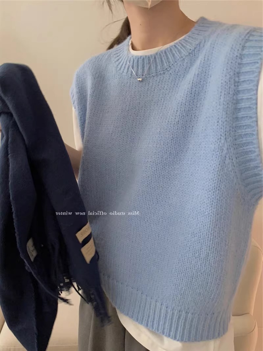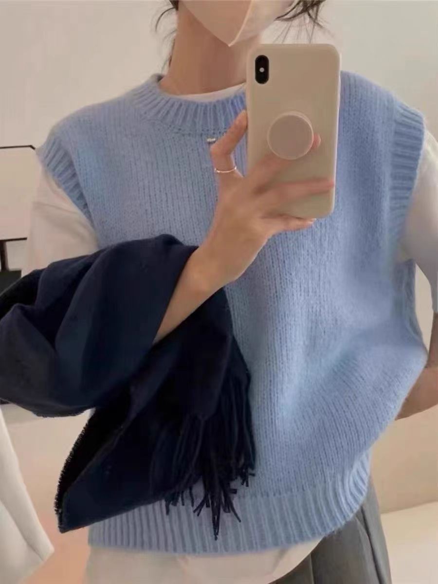 軟糯藍色圓領羊絨馬甲背心女春秋冬寬松短款針織曡穿大碼羊毛坎肩