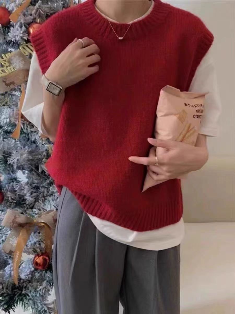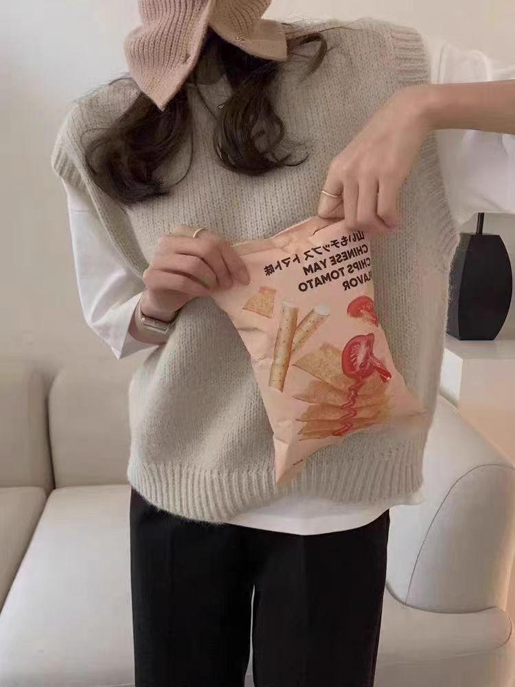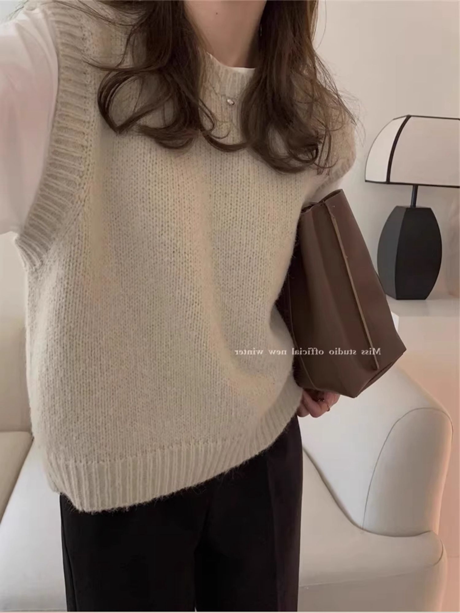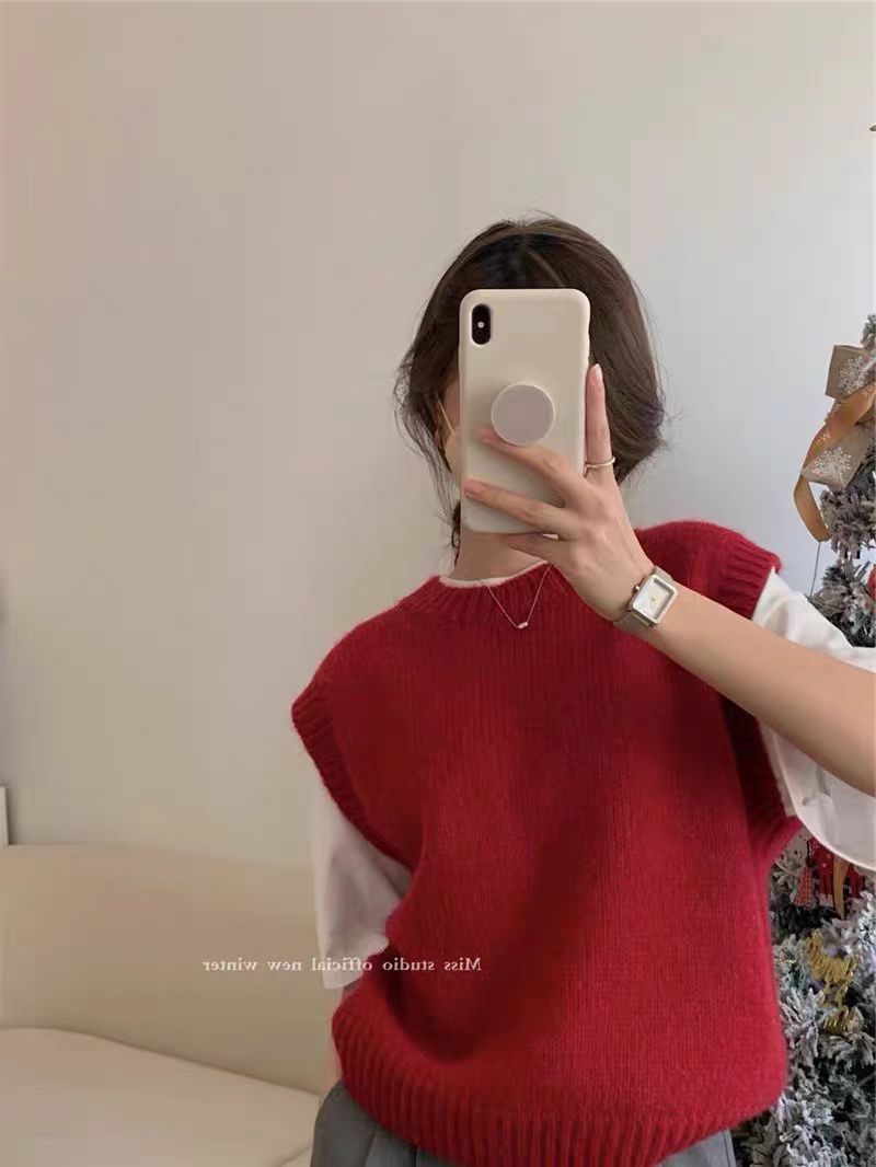 軟糯藍色圓領羊絨馬甲背心女春秋冬寬松短款針織曡穿大碼羊毛坎肩