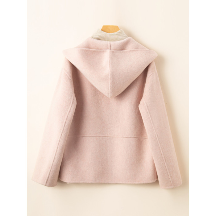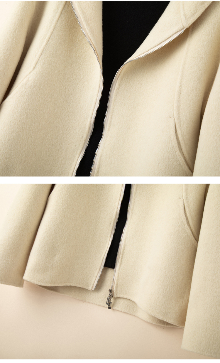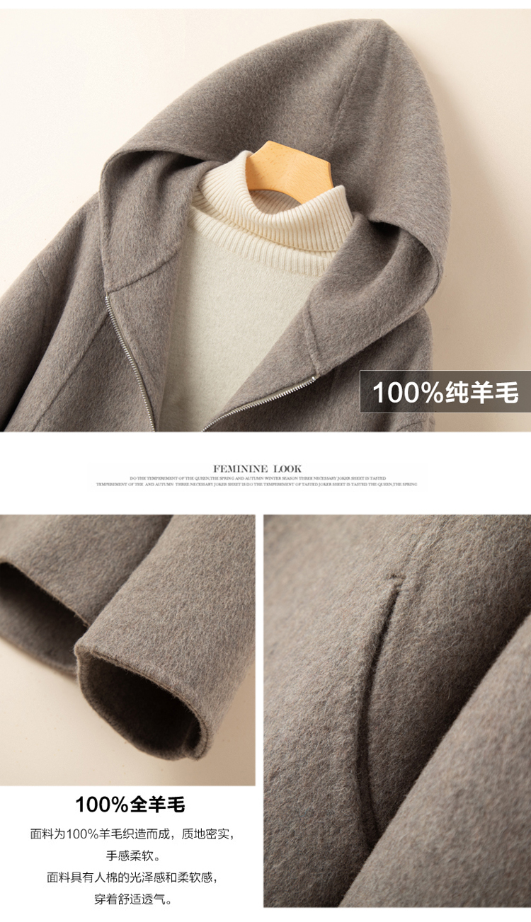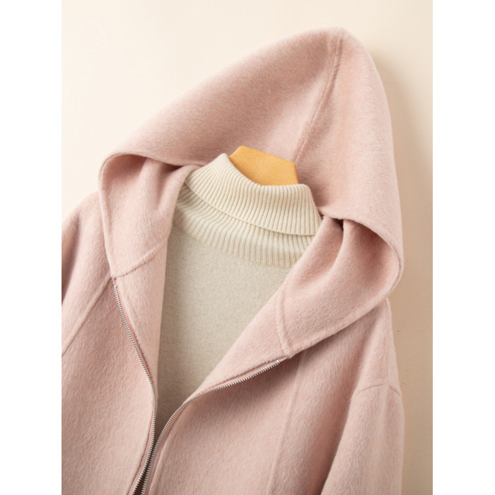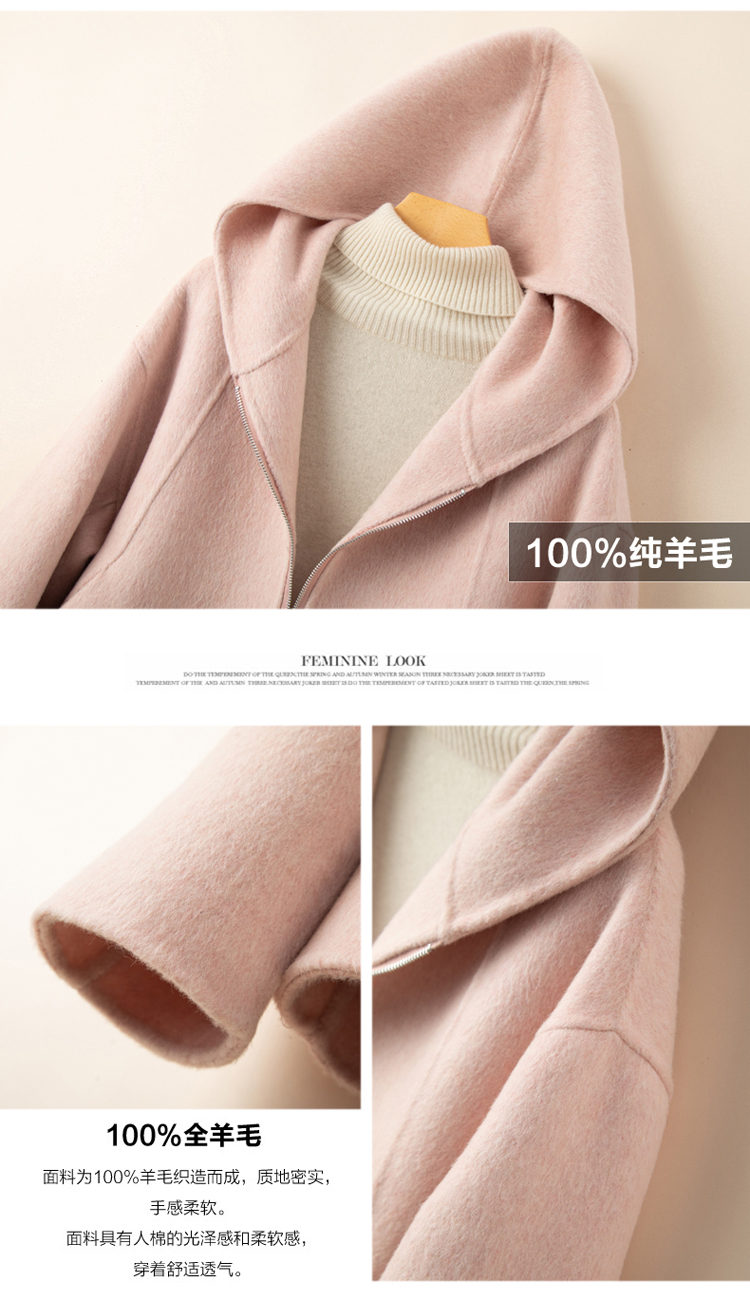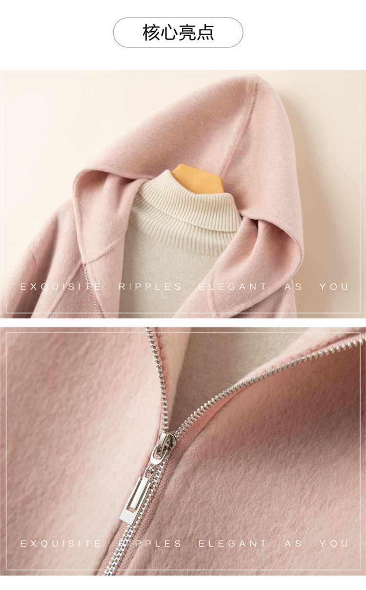 小個子毛呢外套女2024冬季新款粉色連帽短款拉鍊式雙面呢子大衣女