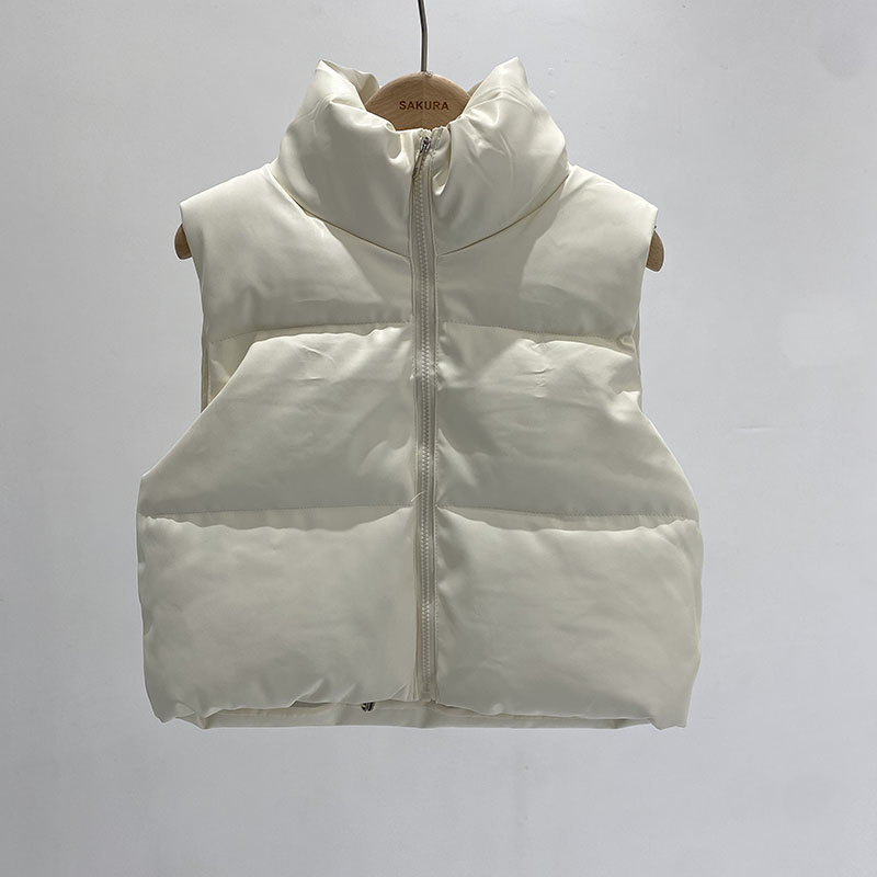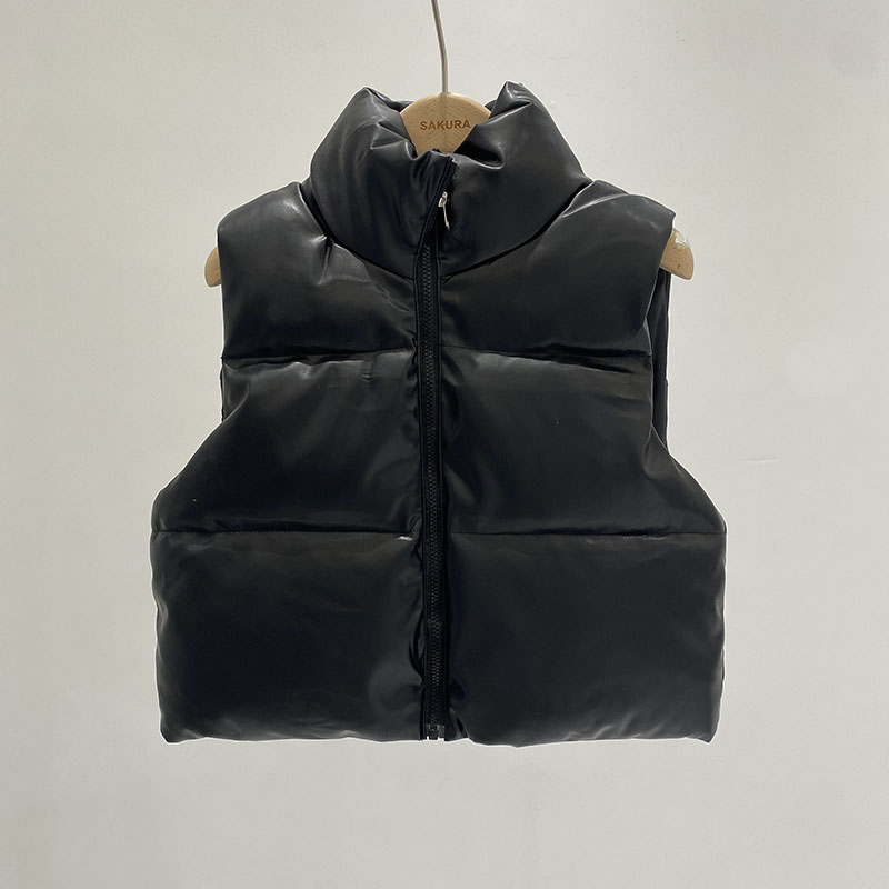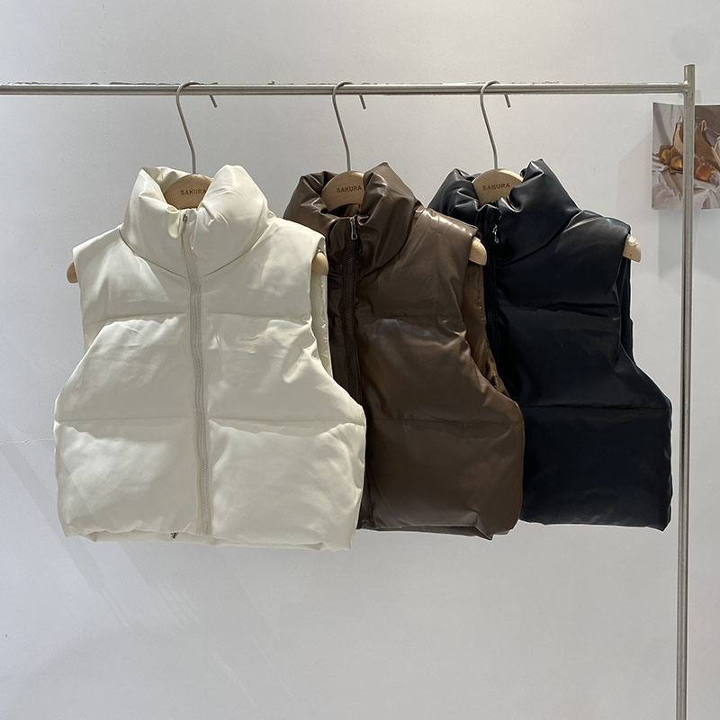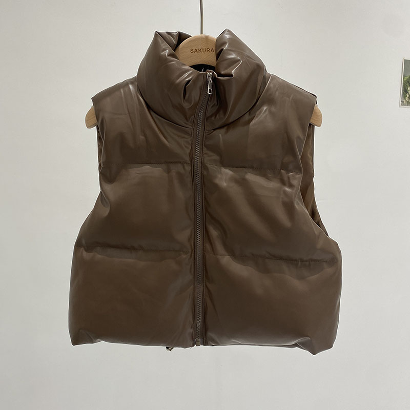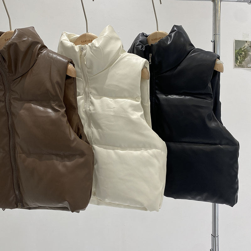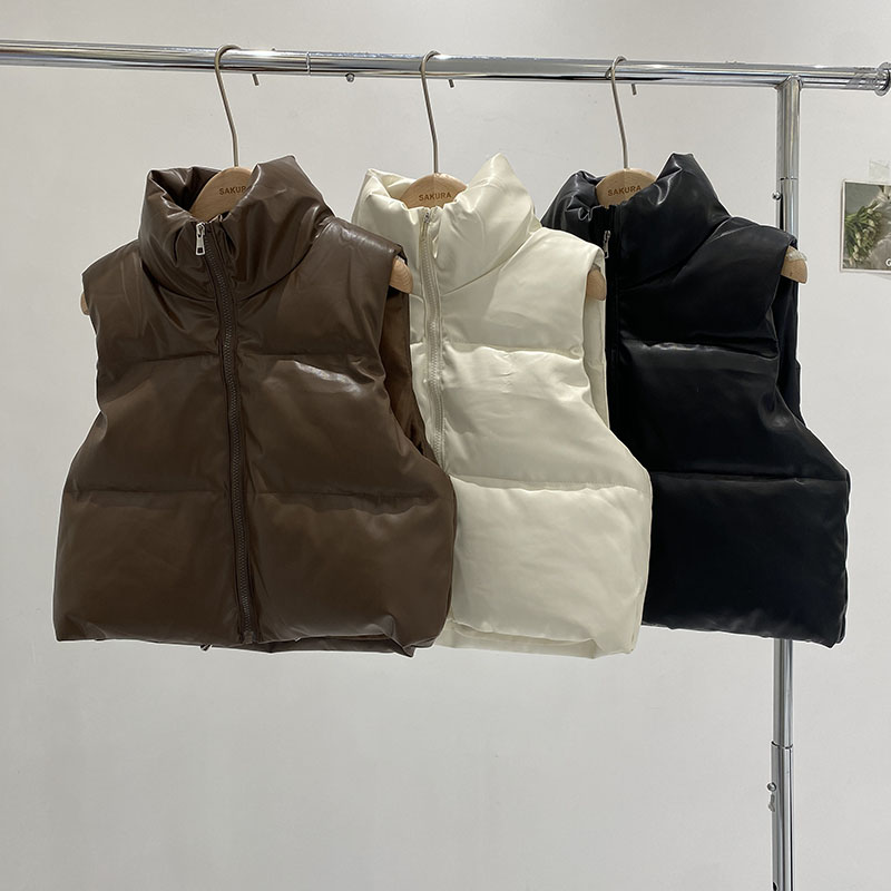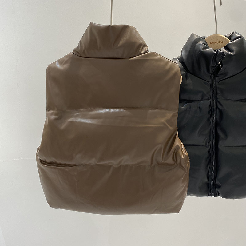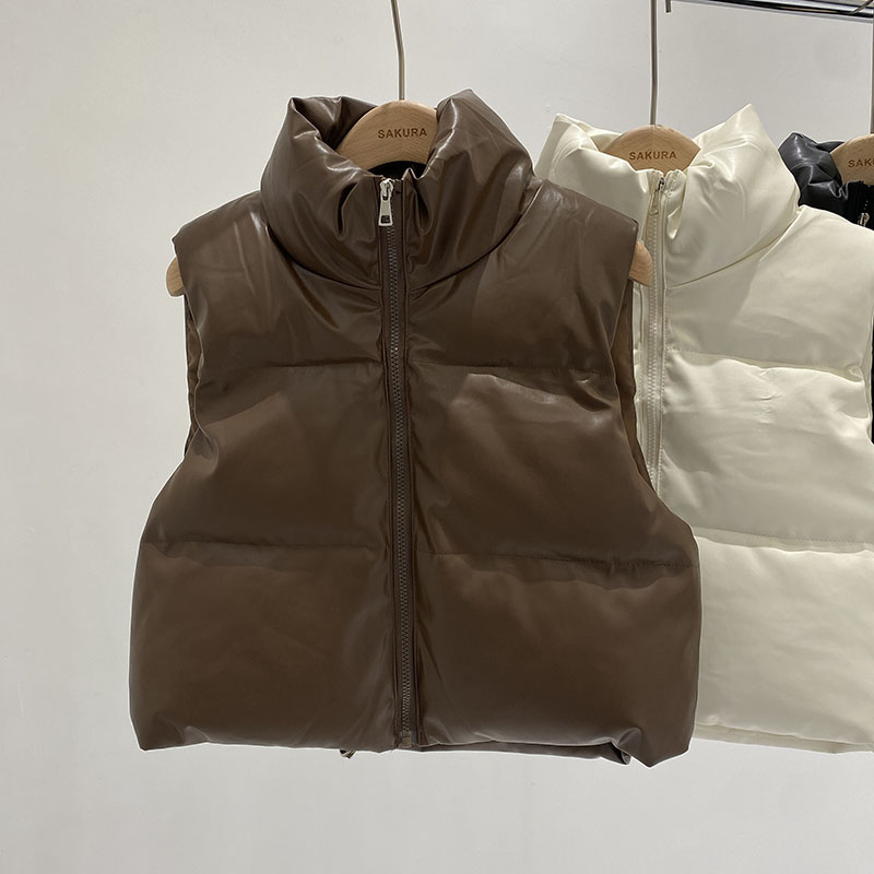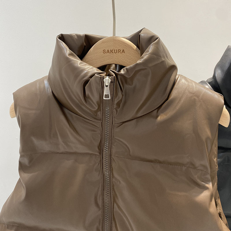 PU皮高領棉服馬甲外套女冬季2024新款韓版保暖立領背心馬夾棉衣潮