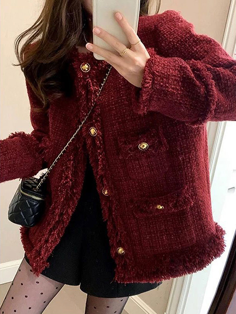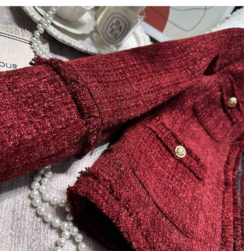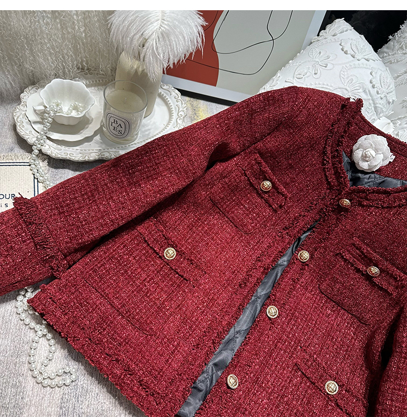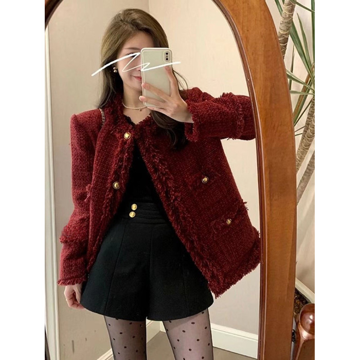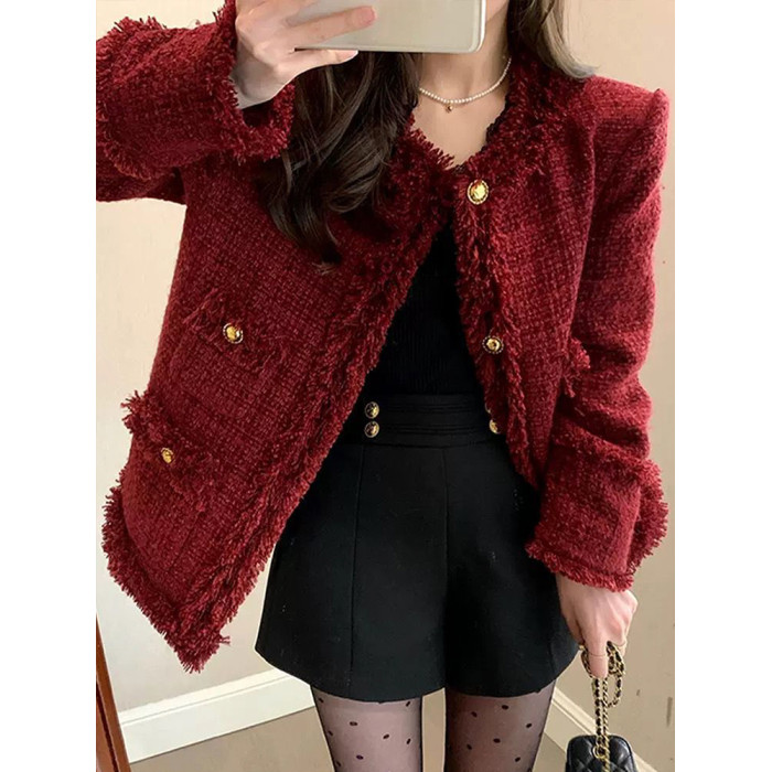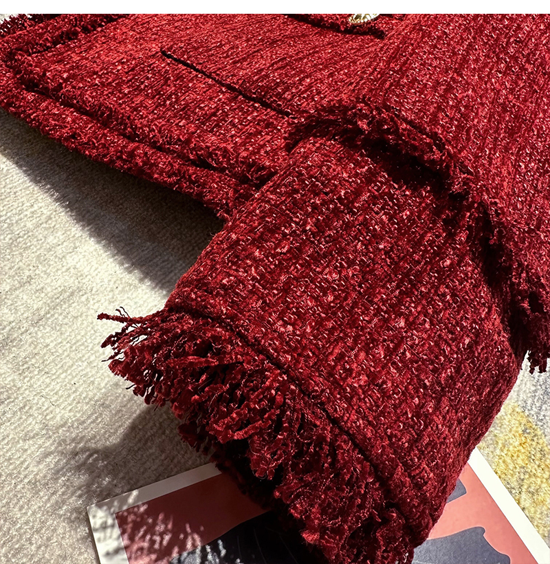 FFmiss◆小香風紅色編織毛毛寬松短外套女羊毛呢流蘇洋氣西裝開衫