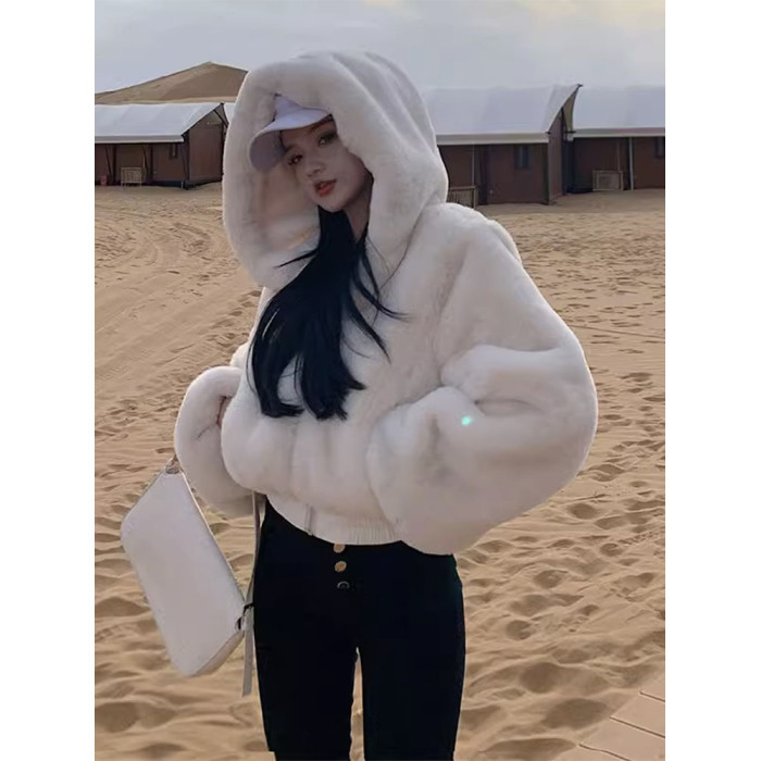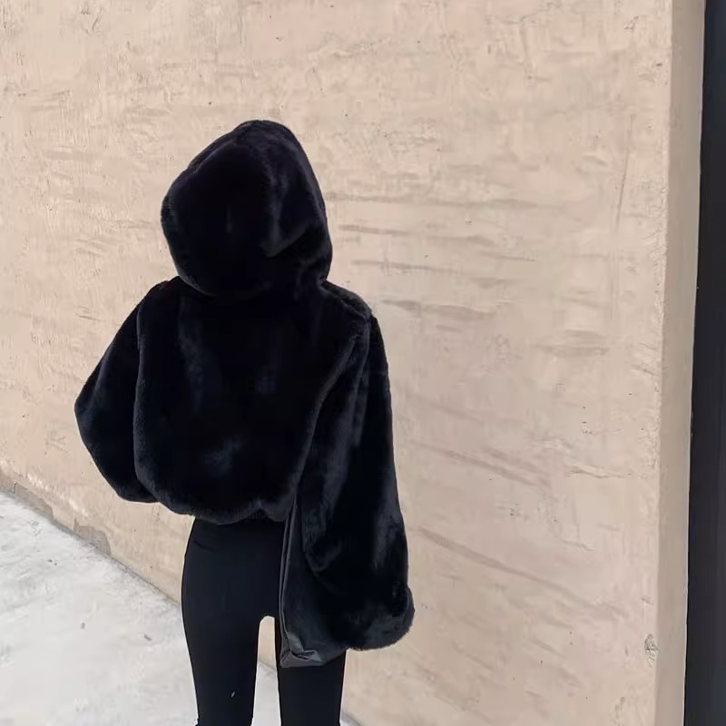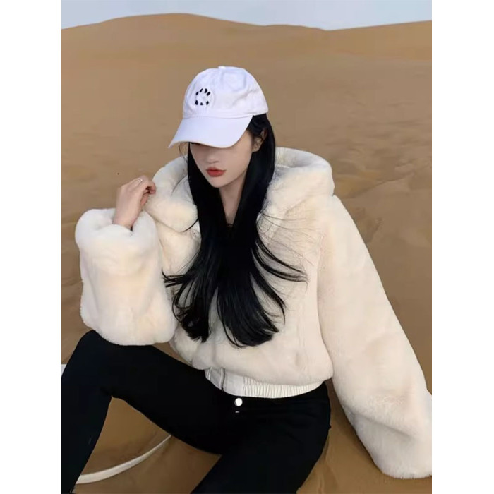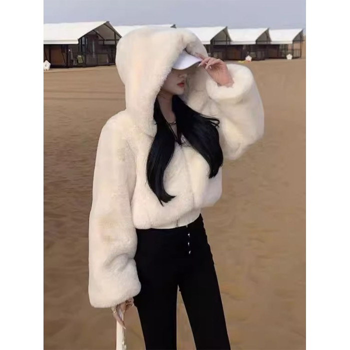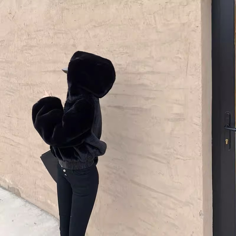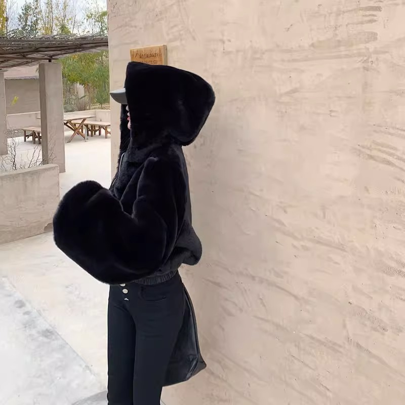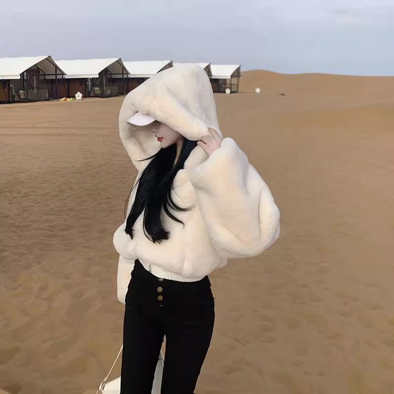 仿兔毛絨短款拉鍊外套女秋冬新款設計感小衆百搭加厚連帽衛衣夾克