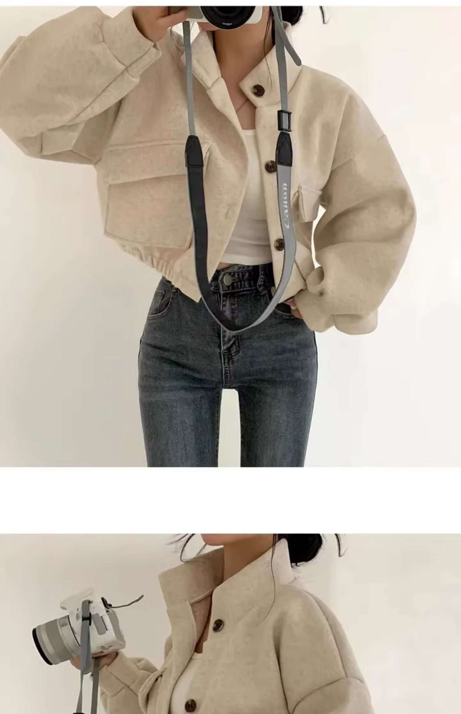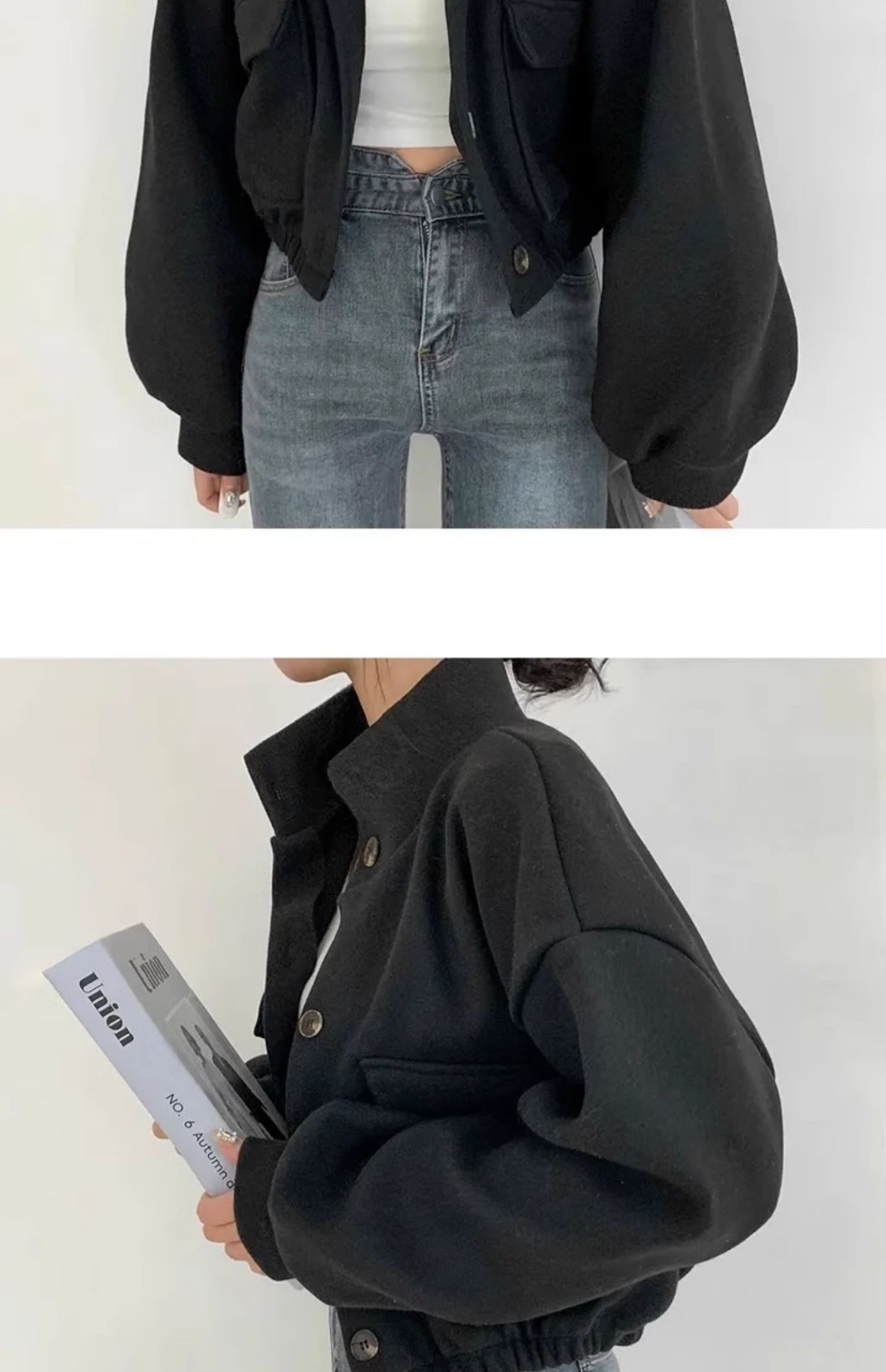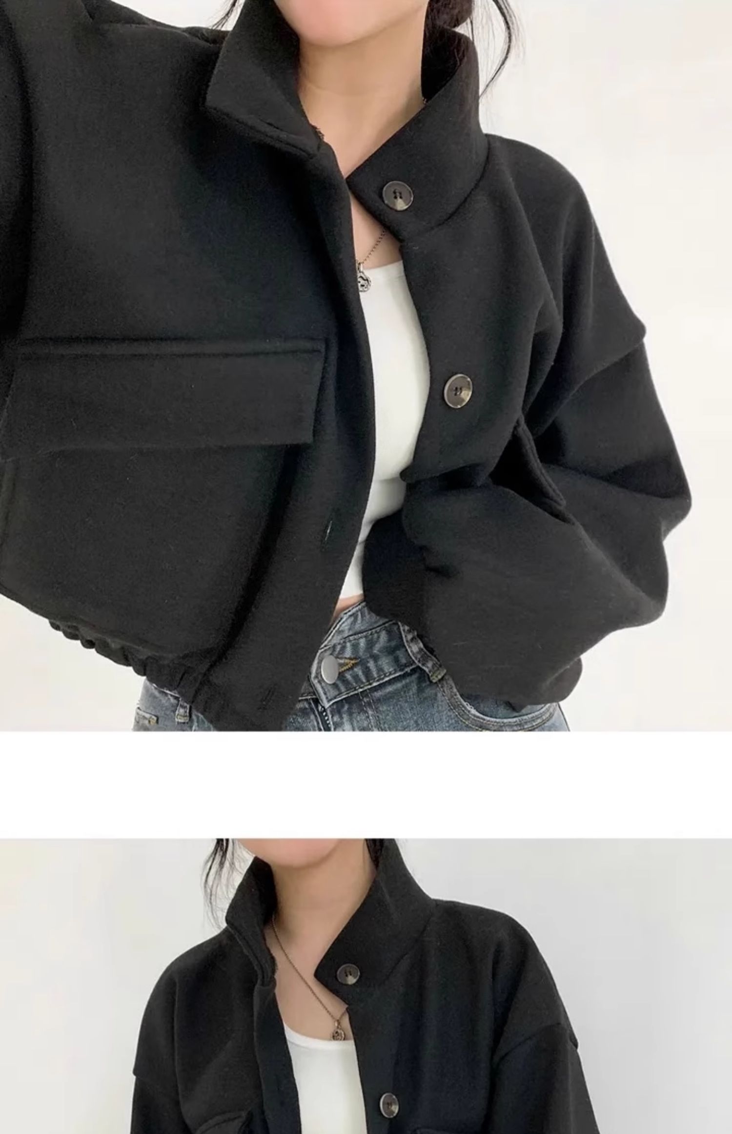 韓國chic復古小衆短款外套女秋冬立領單排釦寬松休閒百搭毛呢上衣