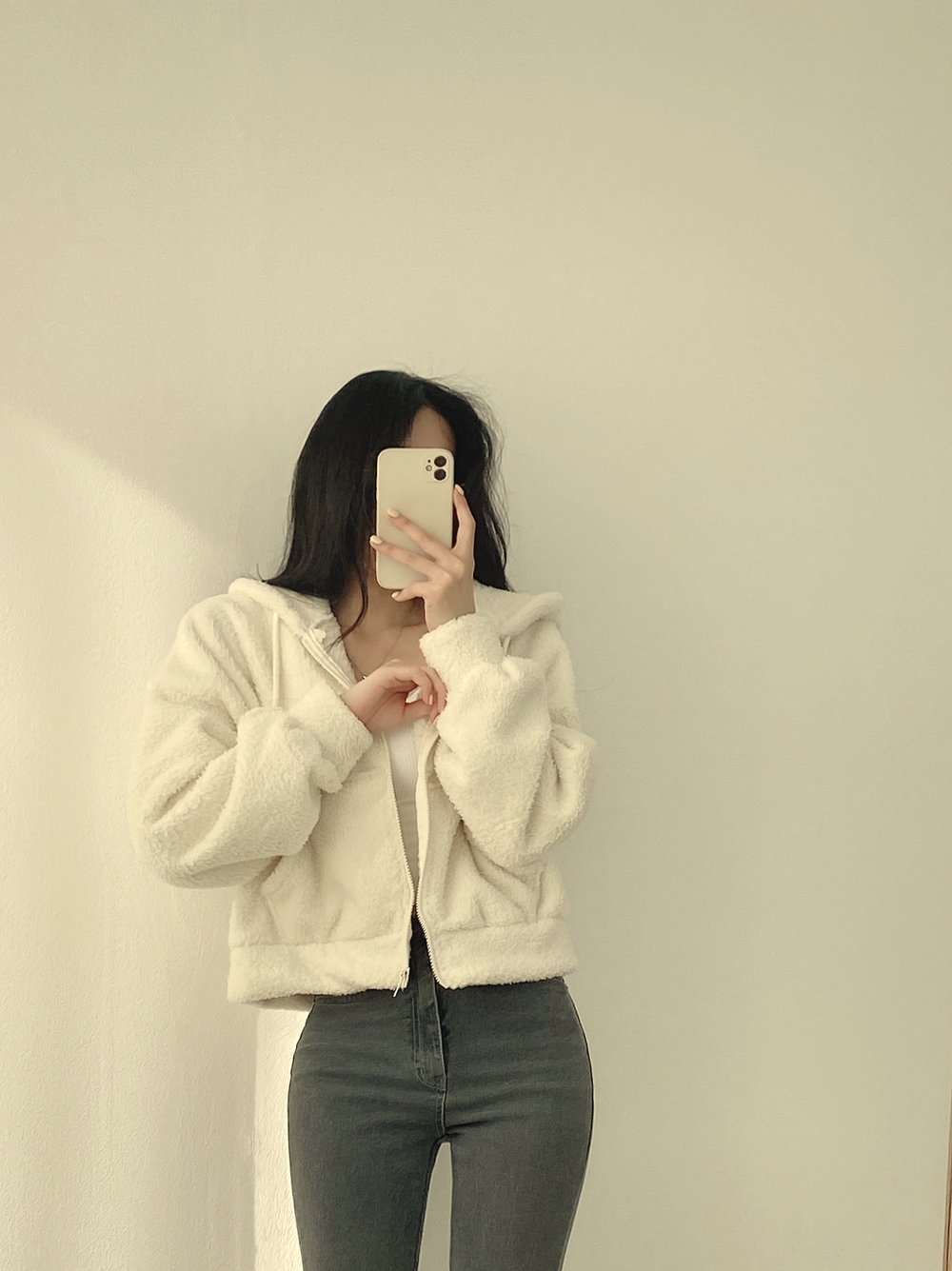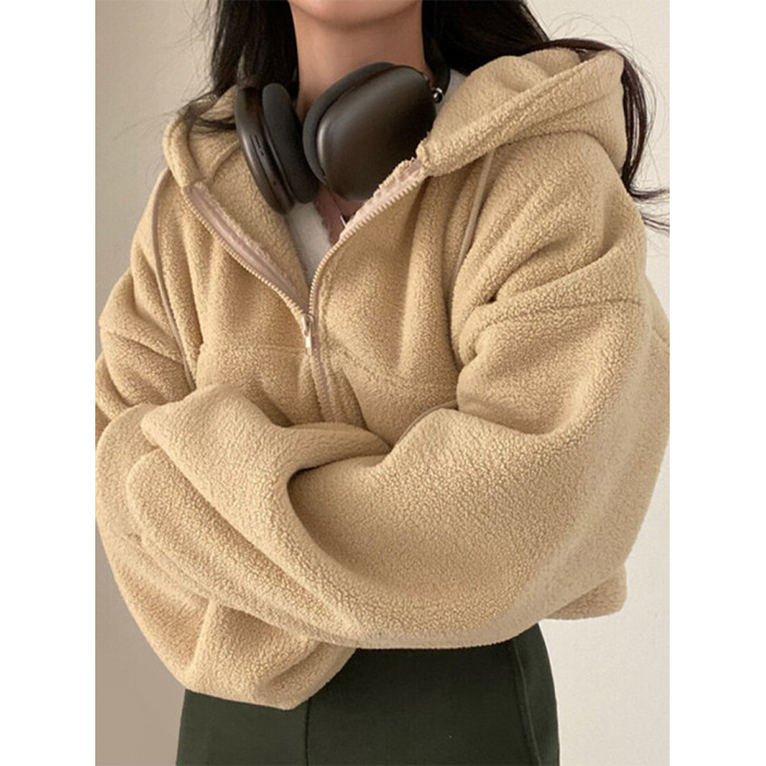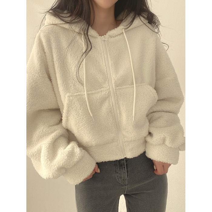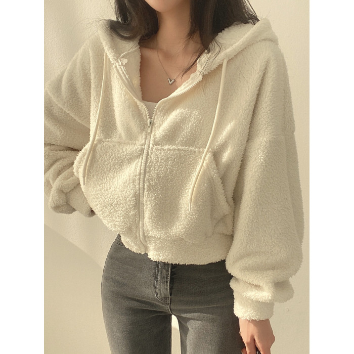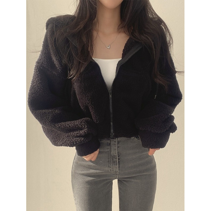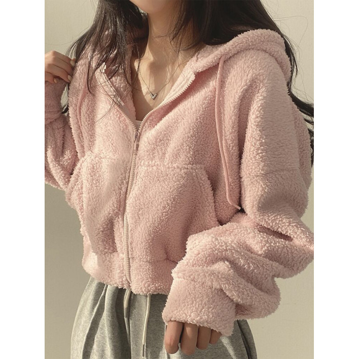 短款羊羔絨連帽外套女小個子秋冬季加絨加厚時尚百搭開衫拉鍊上衣