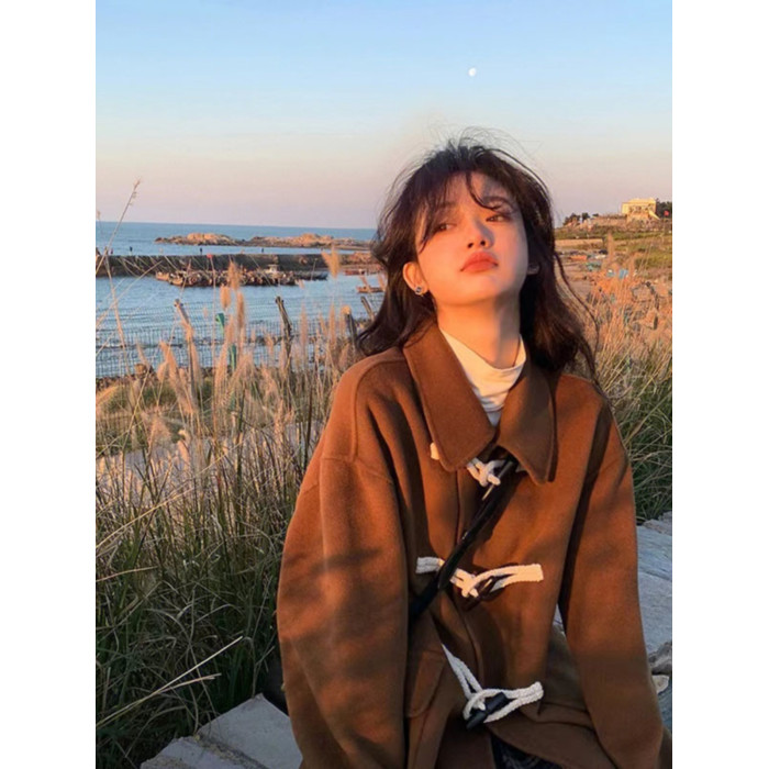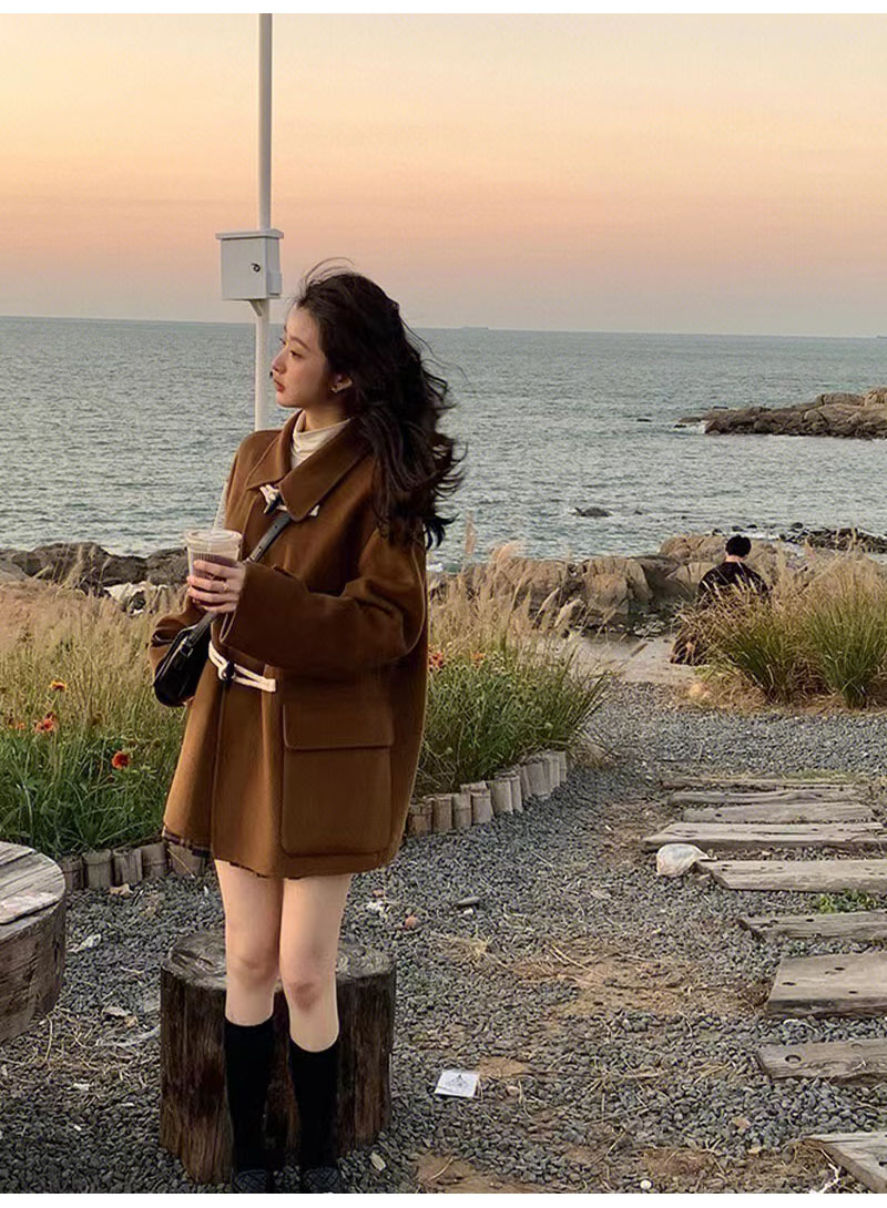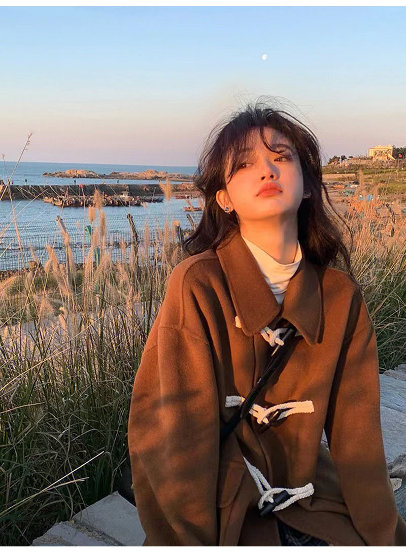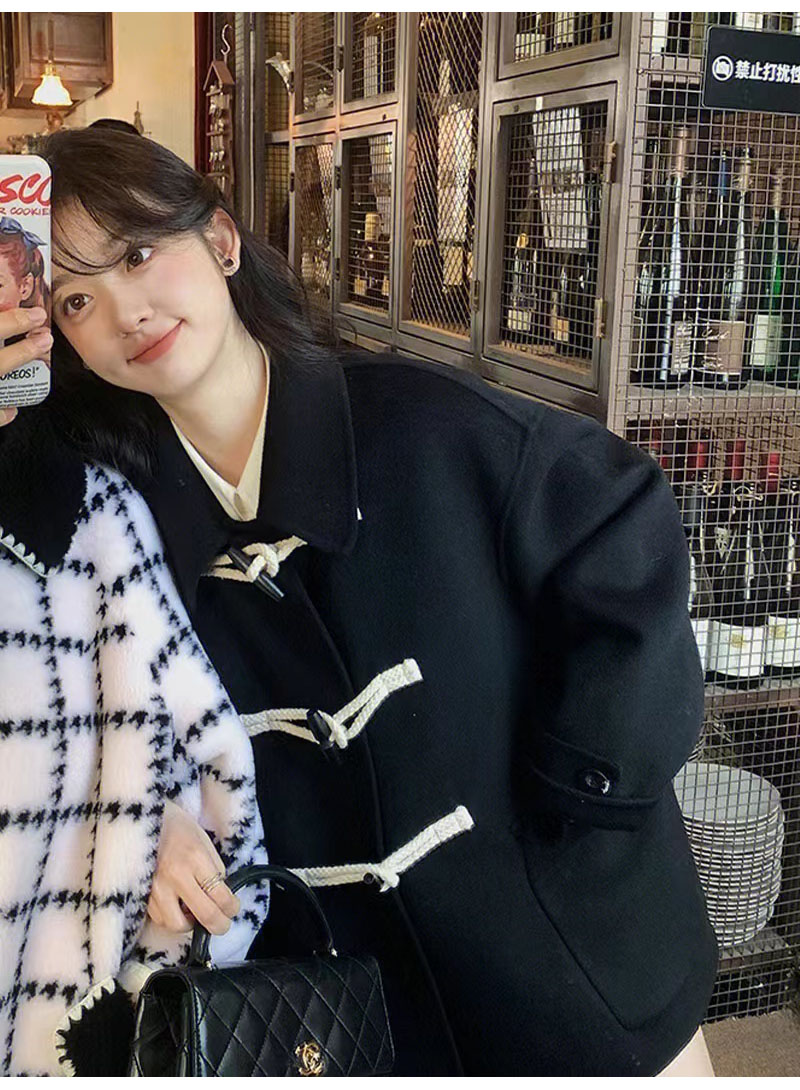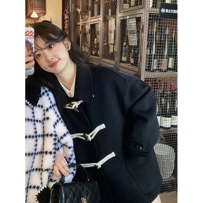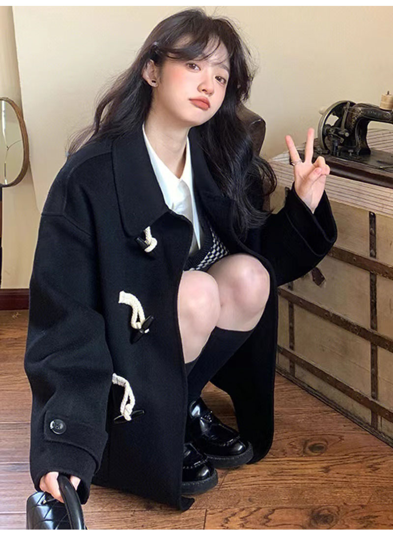 獨特超好看深冬黑色牛角釦呢子大衣女入冬季2025新款毛呢外套加厚