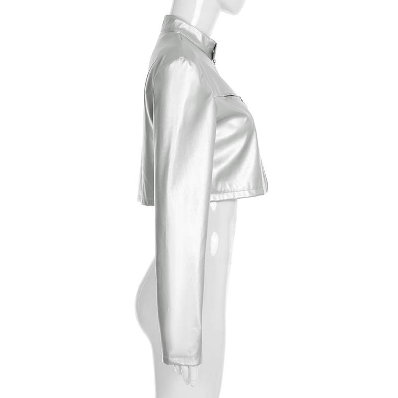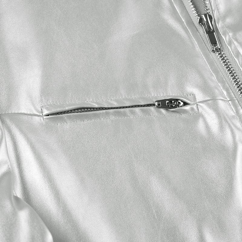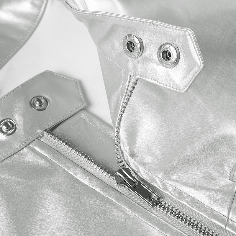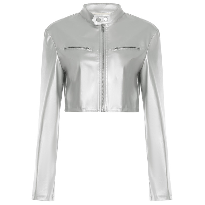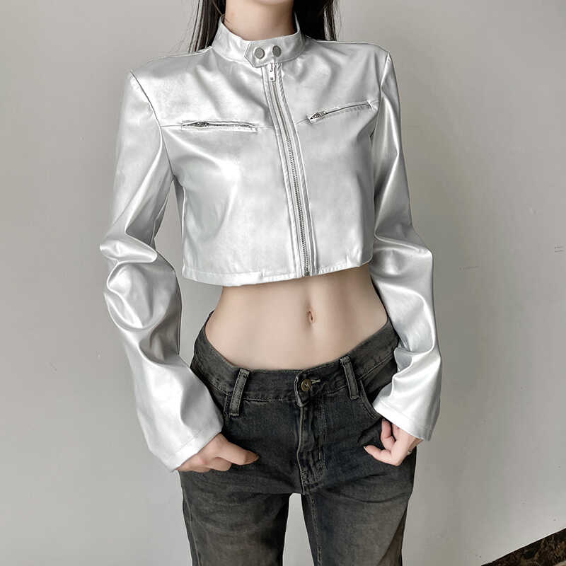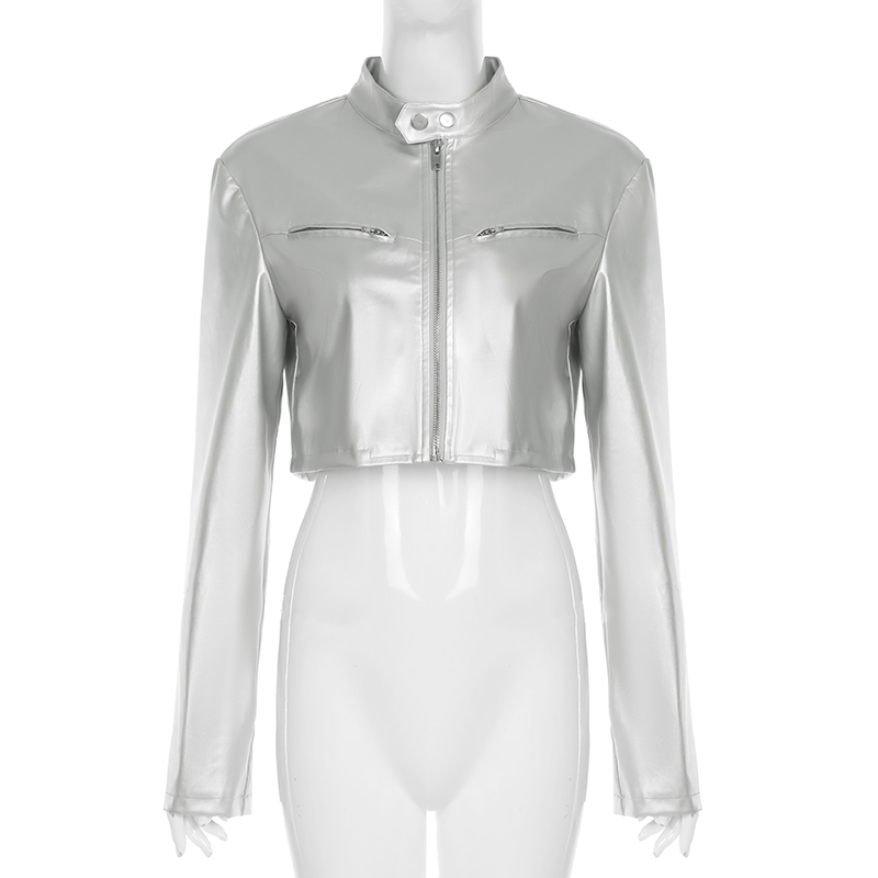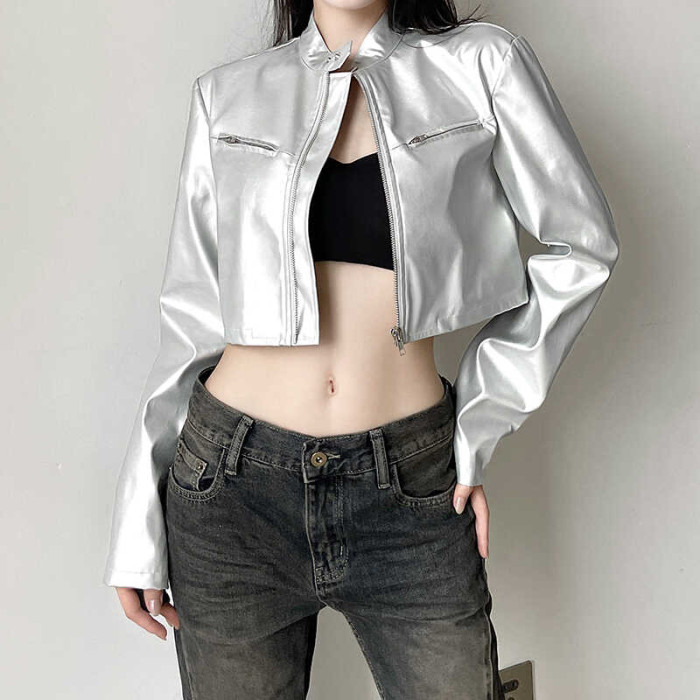 WEEKEEP 帥氣銀色短款機車風皮衣外套女開衫立領百搭跳舞夾克上衣