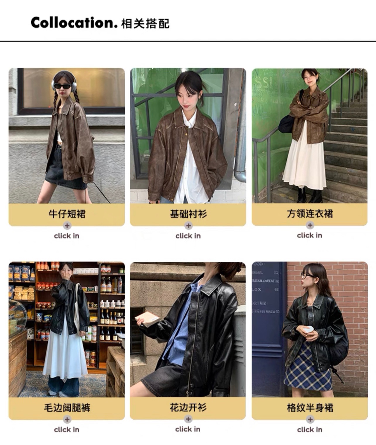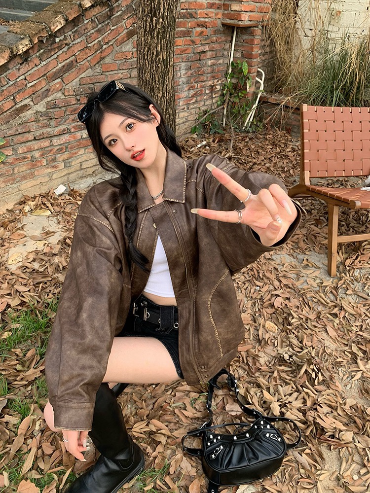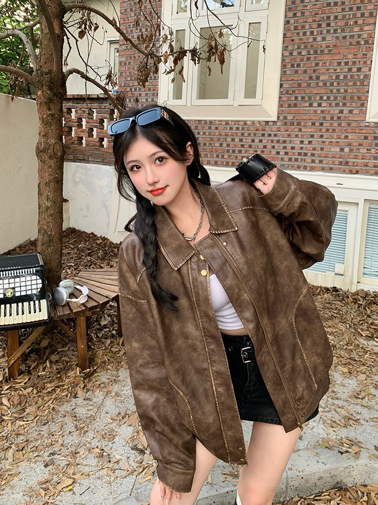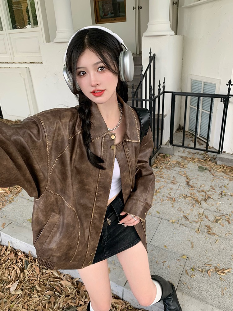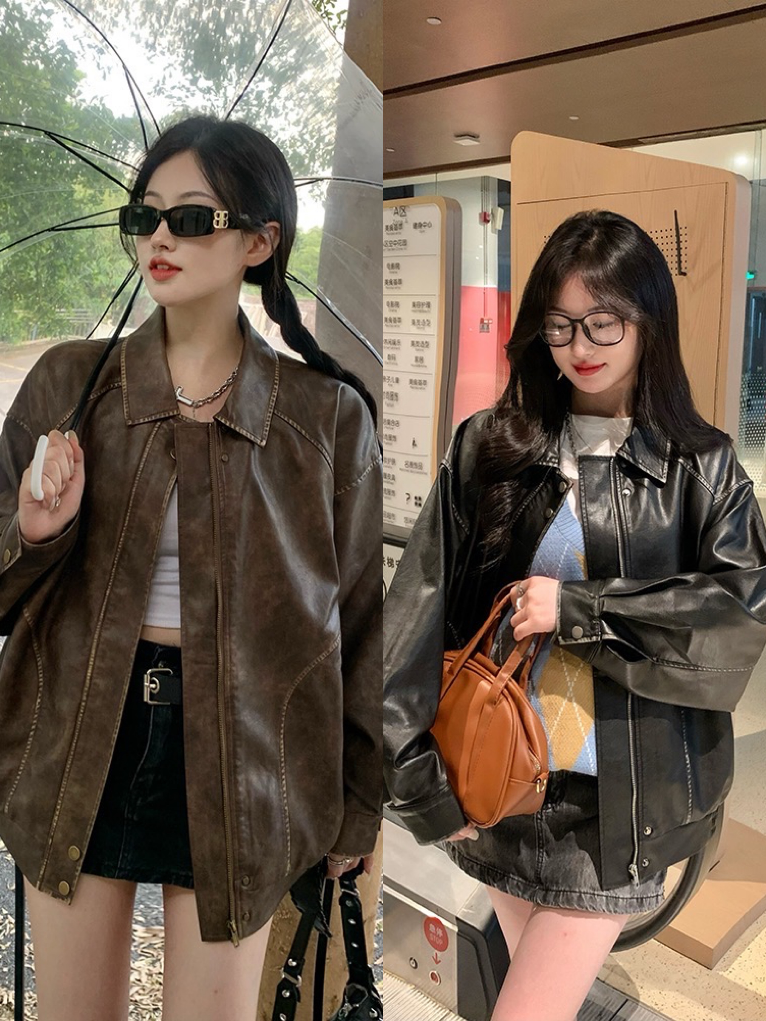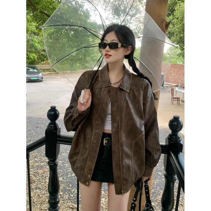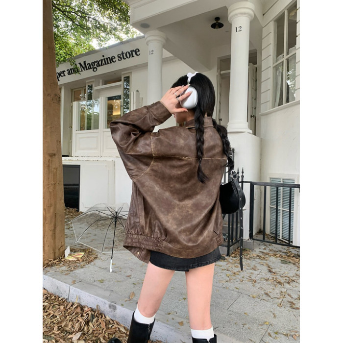 美式復古做舊棕色皮衣外套女春韓版寬松設計感小衆嬉皮士夾克上衣