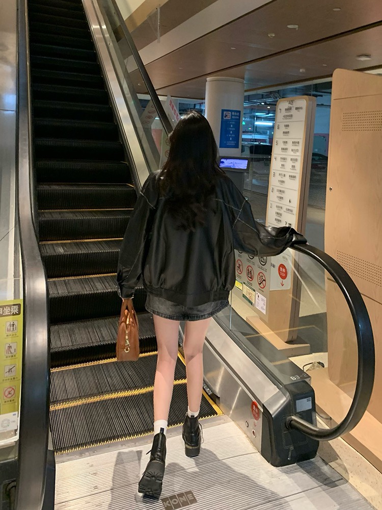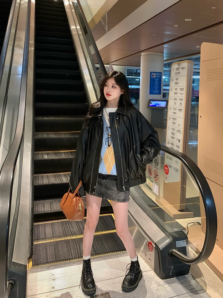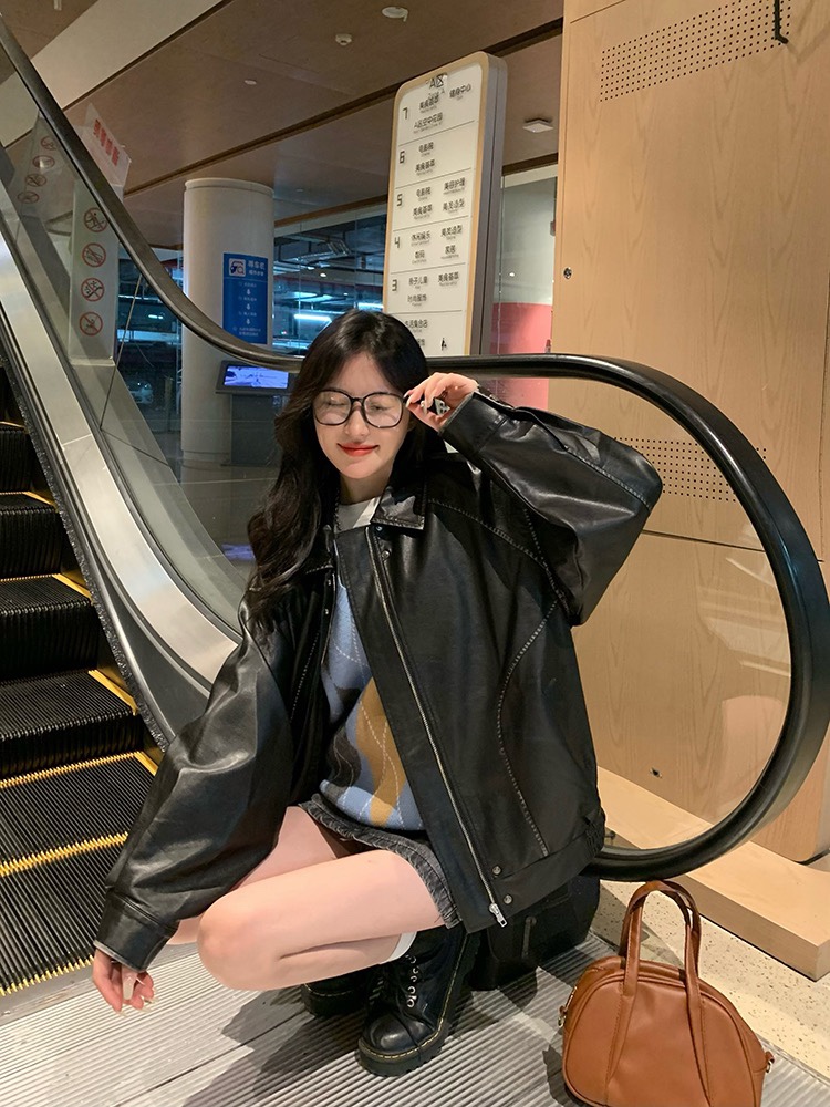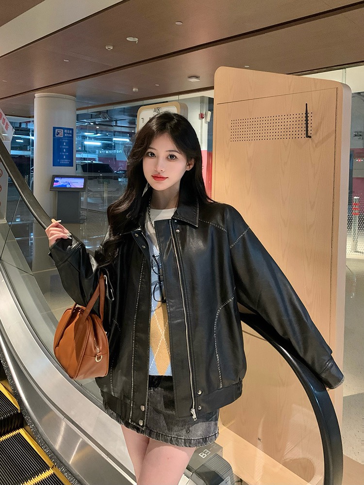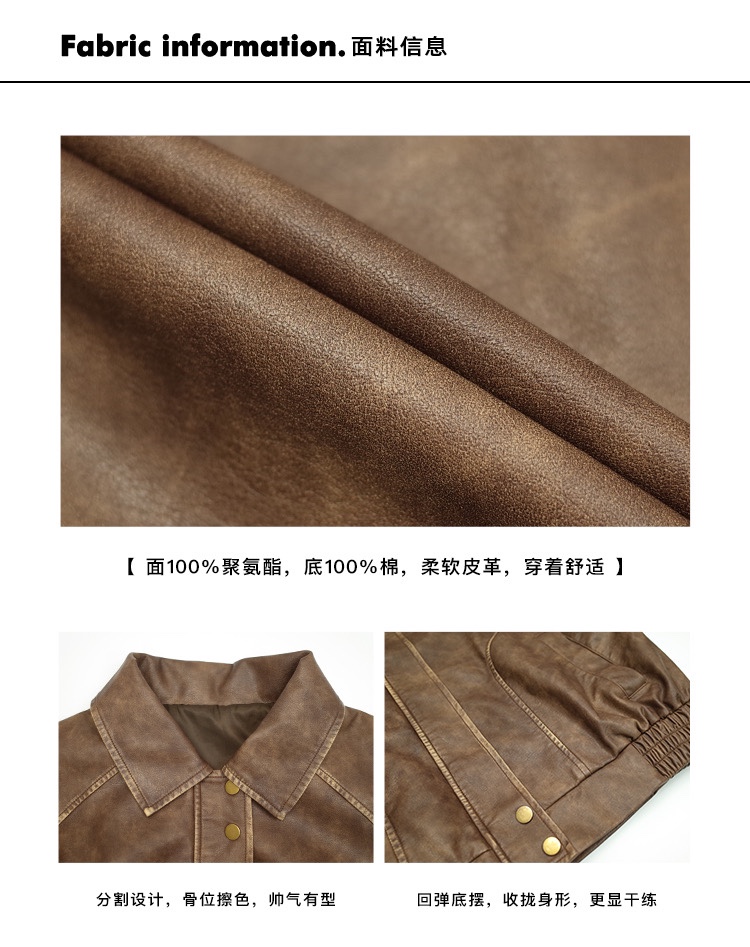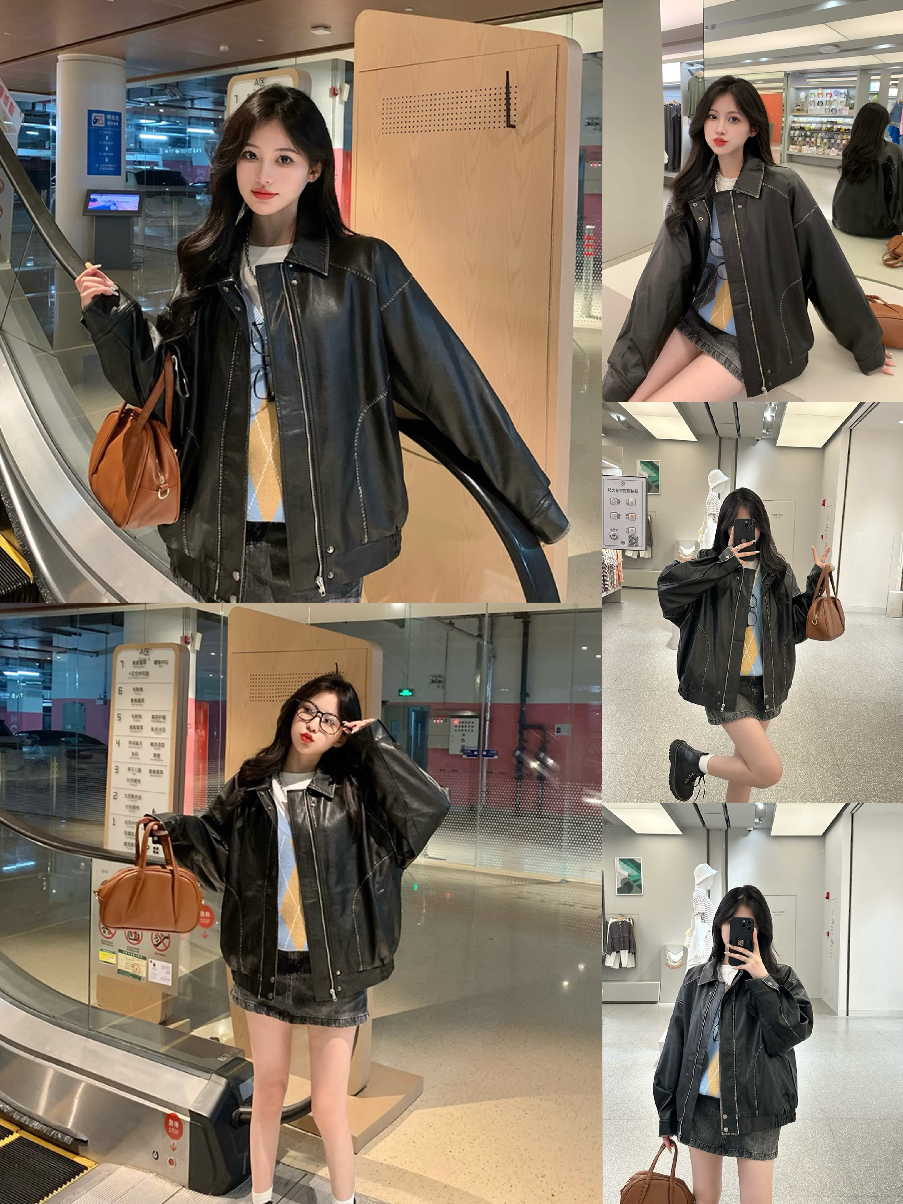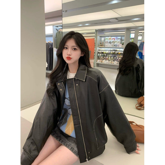 美式復古做舊棕色皮衣外套女春韓版寬松設計感小衆嬉皮士夾克上衣