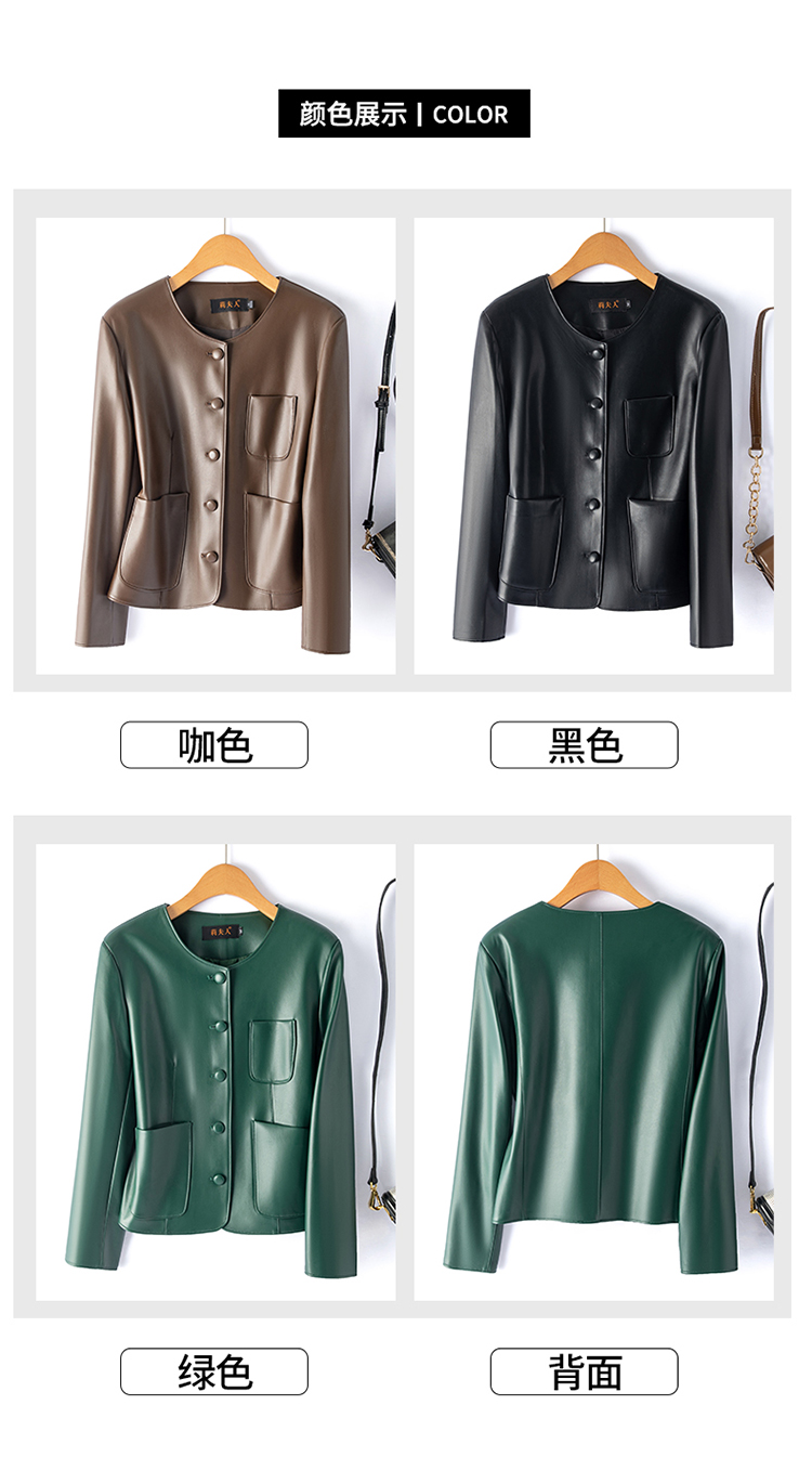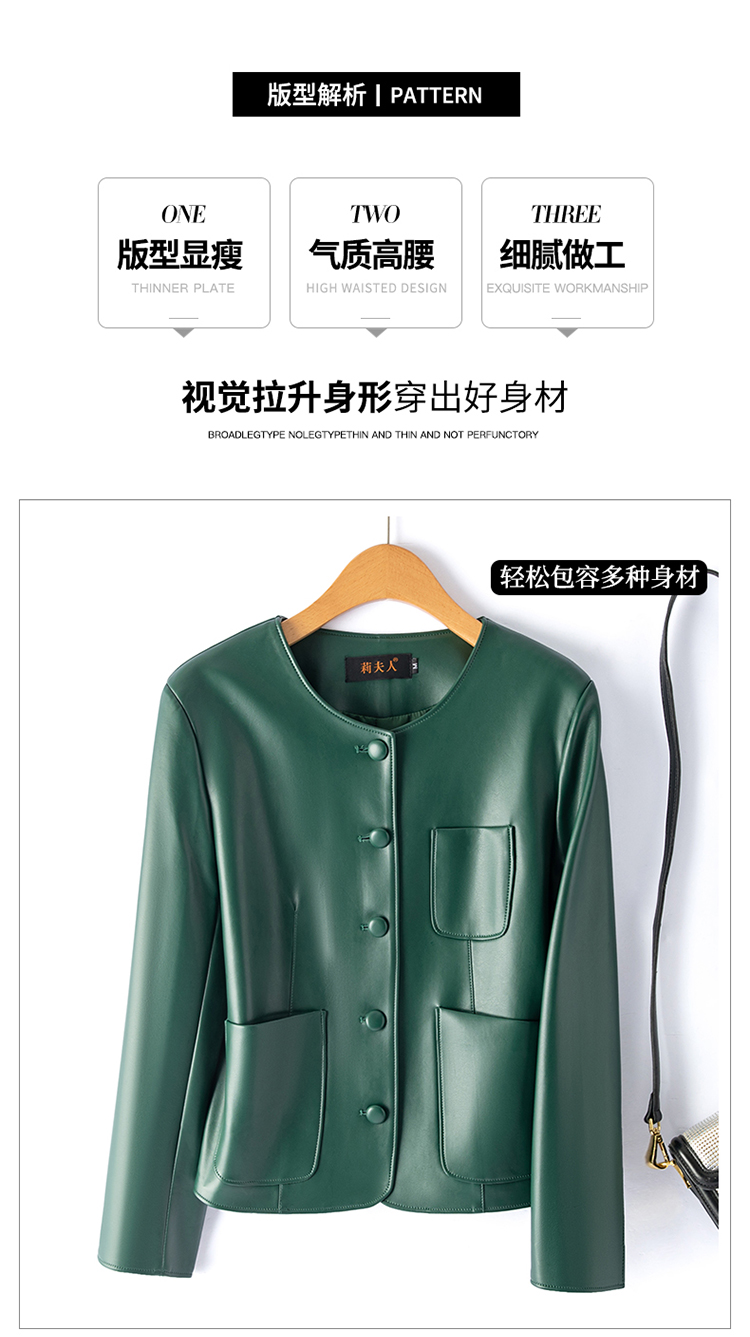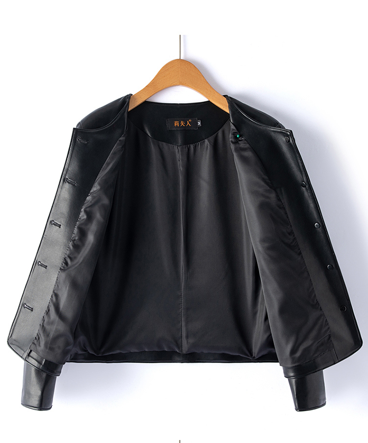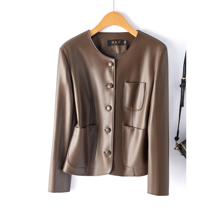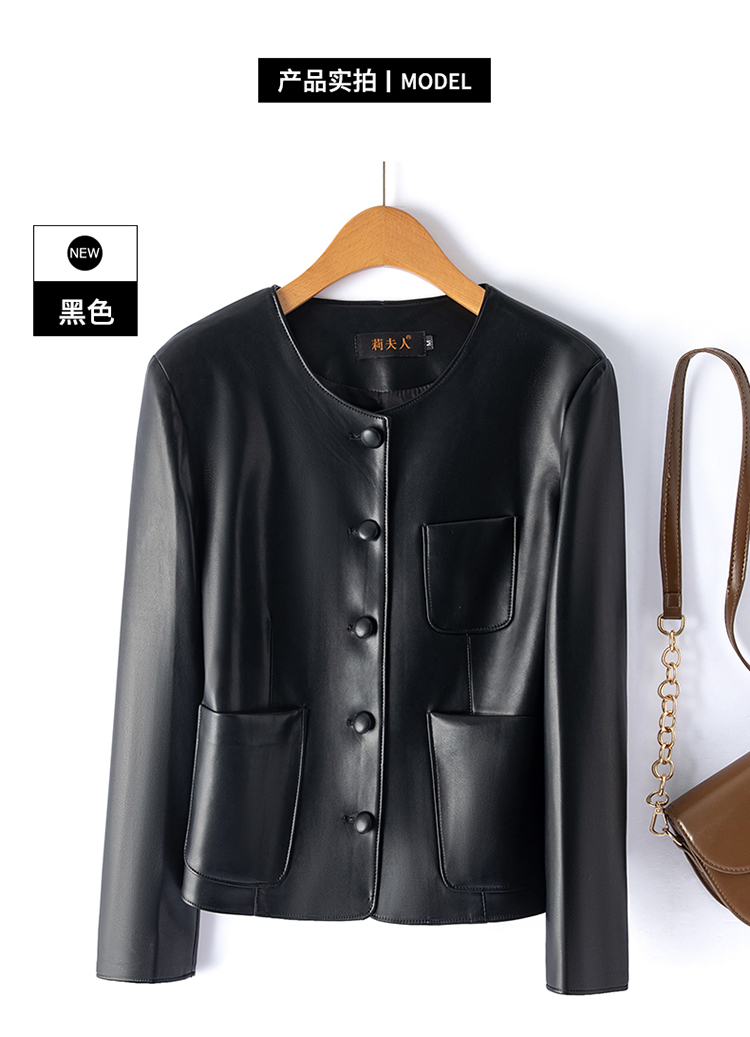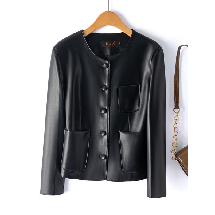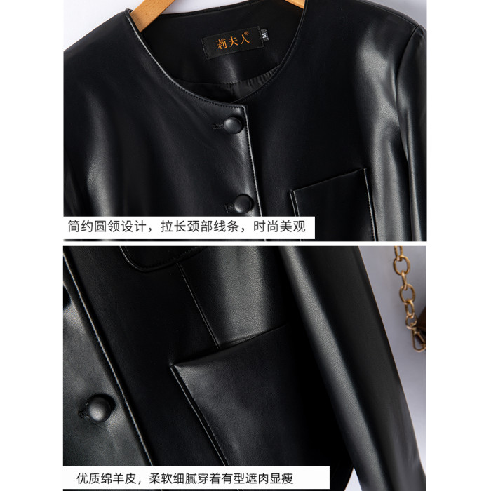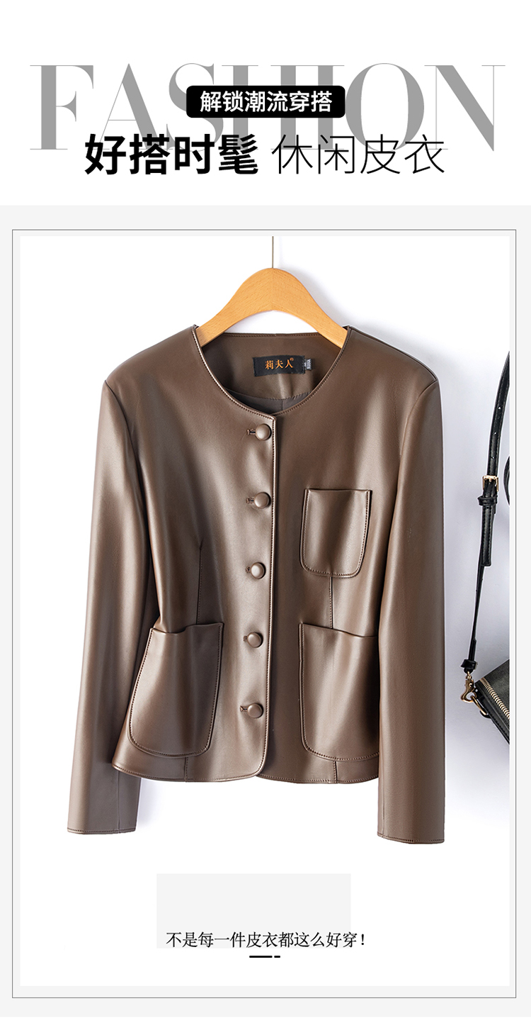 海甯真皮皮衣女短款單排釦皮夾克綿羊皮機車圓領百搭顯瘦時尚外套