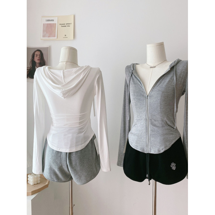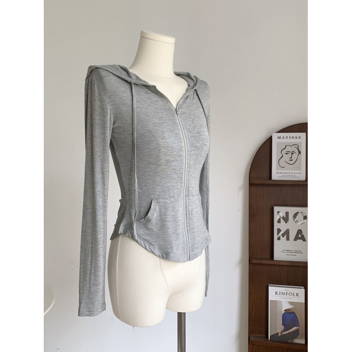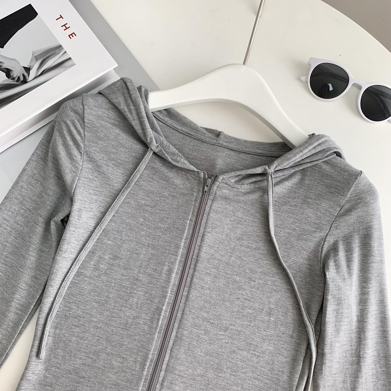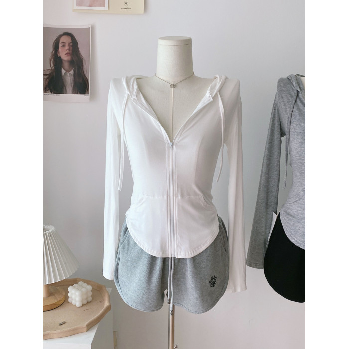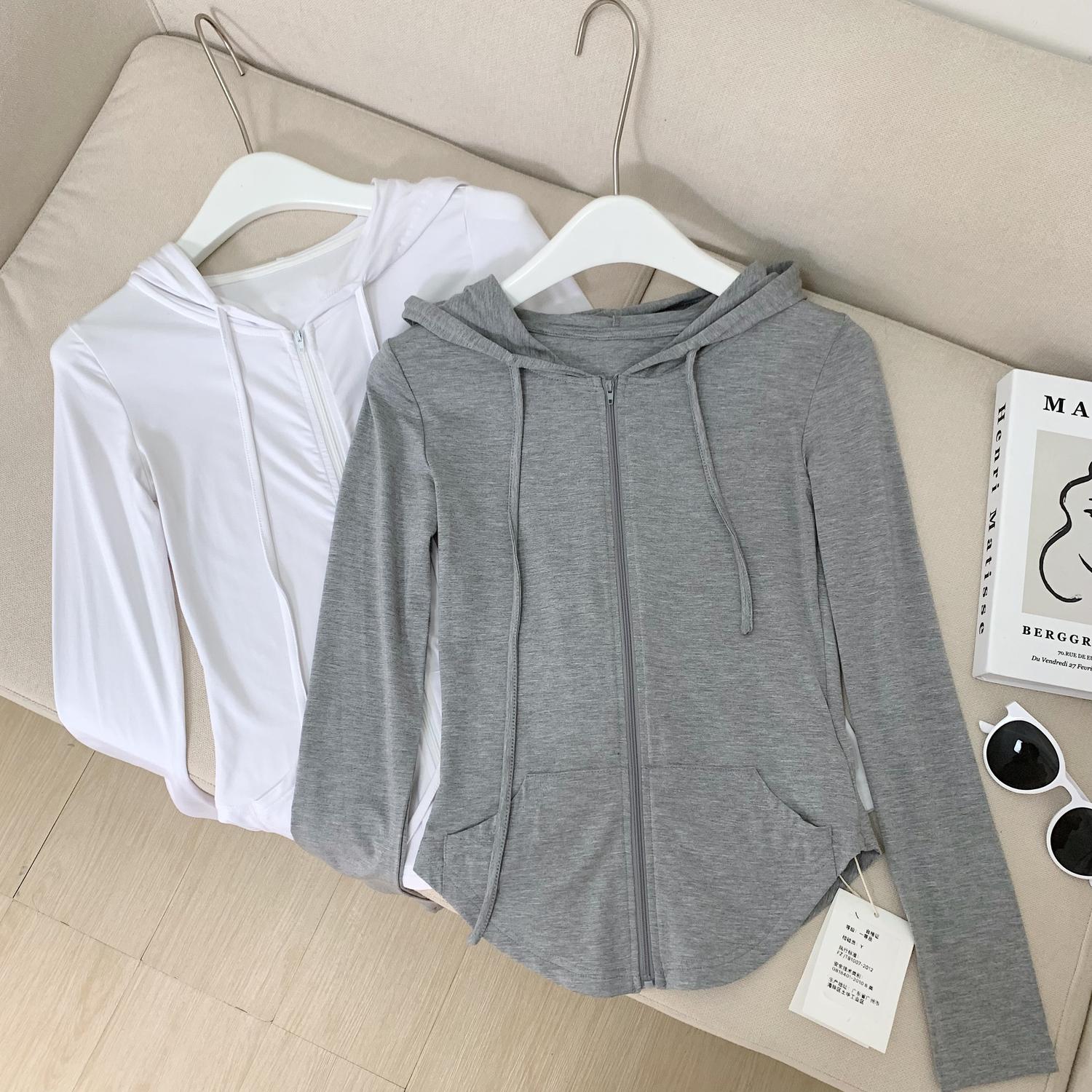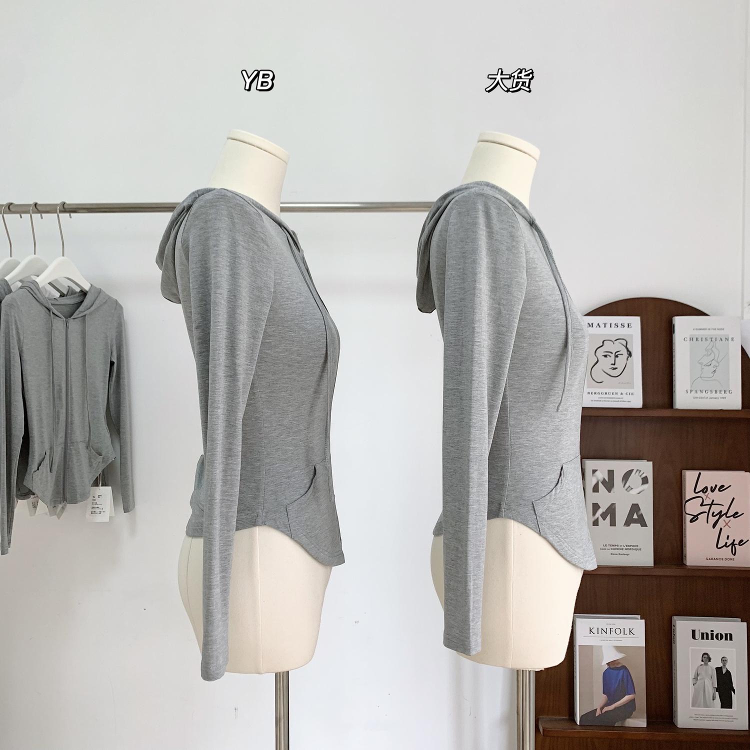 POPW 莫代爾連帽長袖T恤短外套女新款修身顯瘦弧形下擺防曬開衫