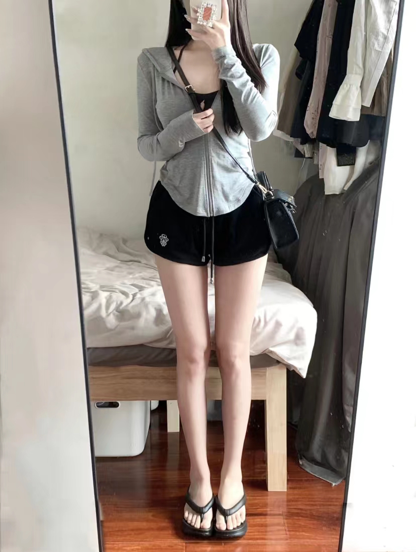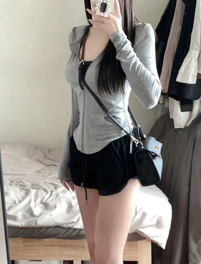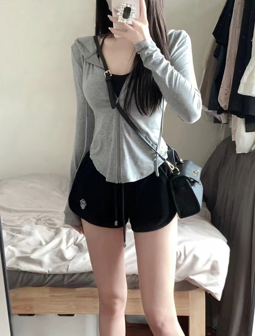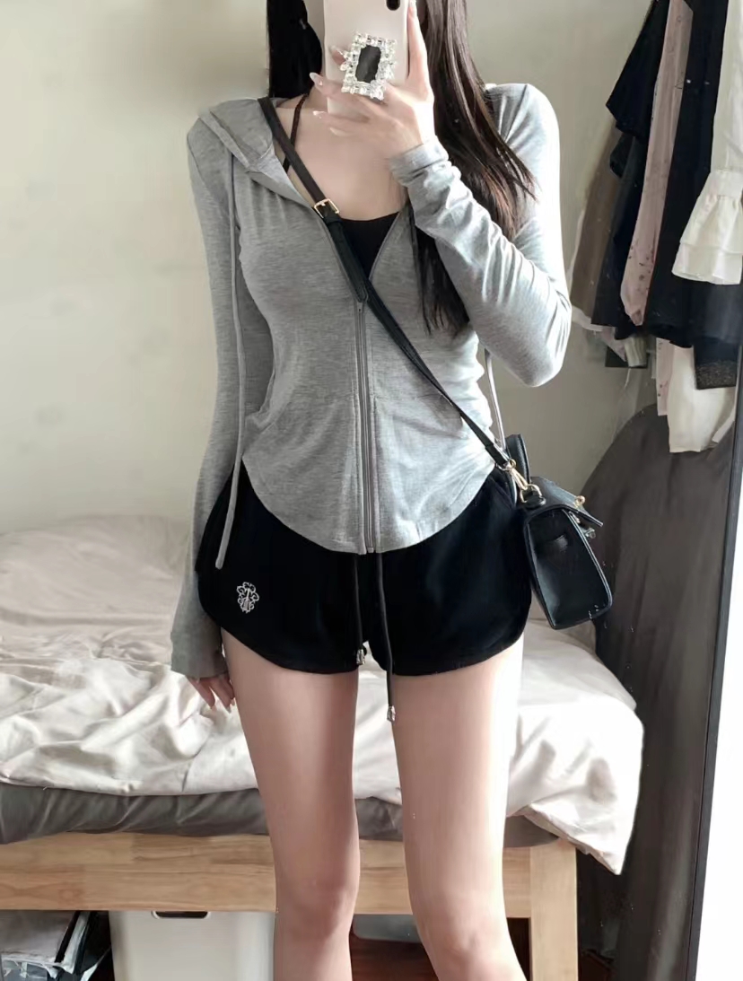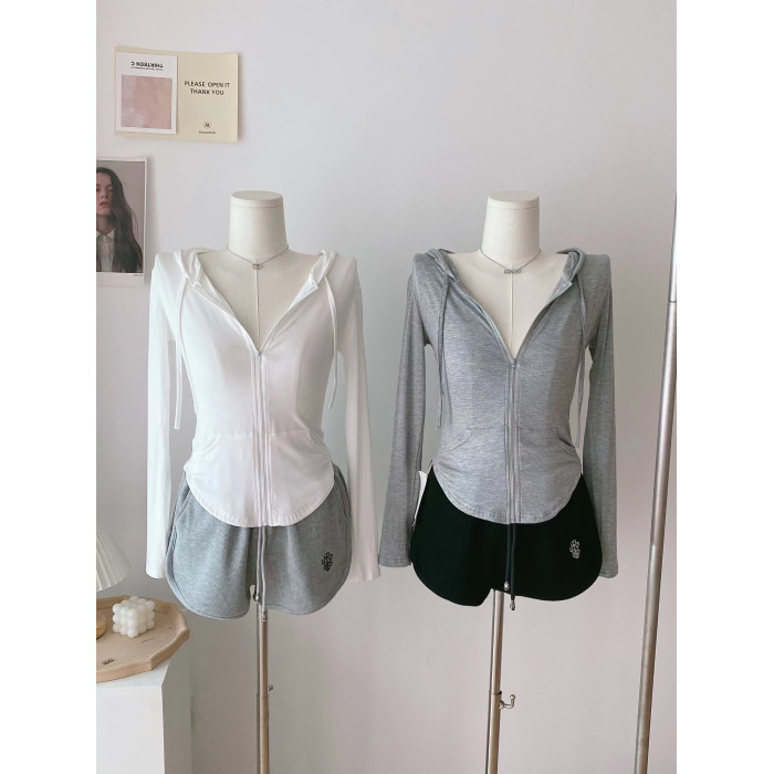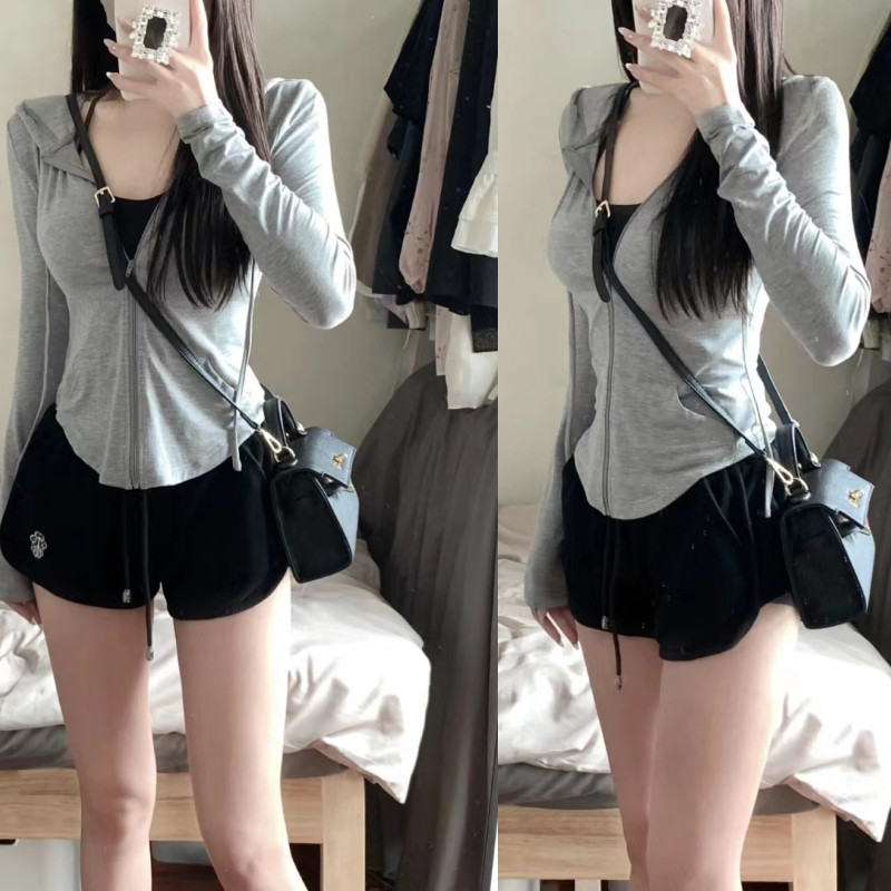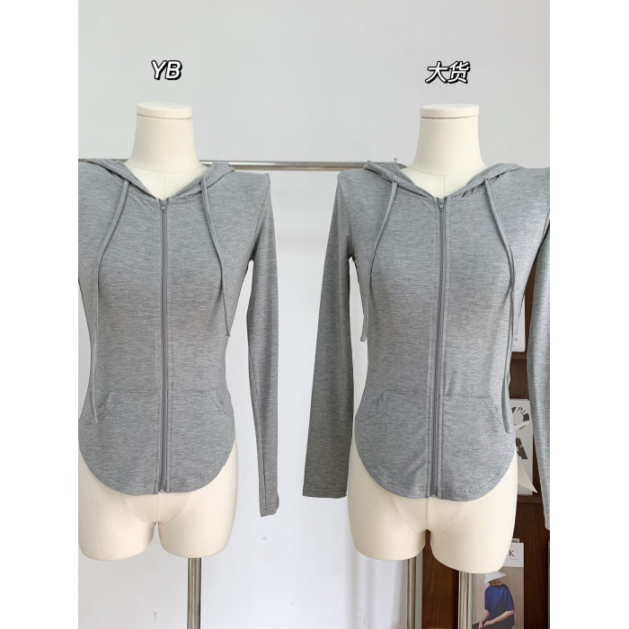 POPW 莫代爾連帽長袖T恤短外套女新款修身顯瘦弧形下擺防曬開衫