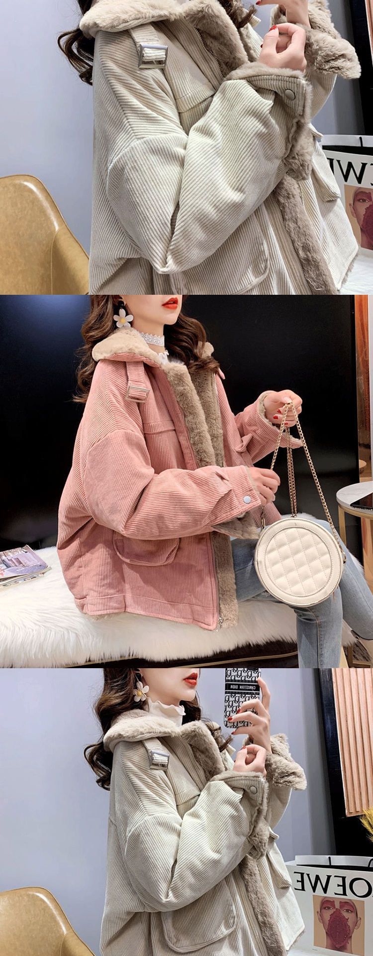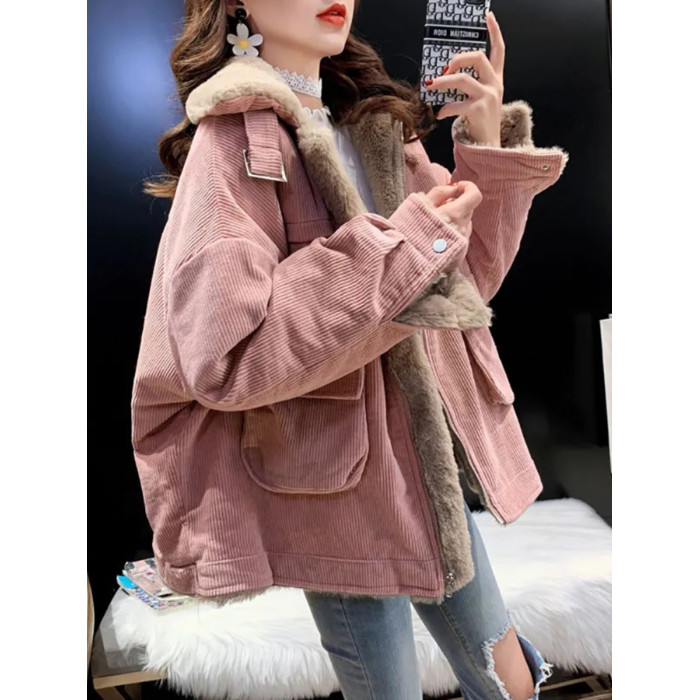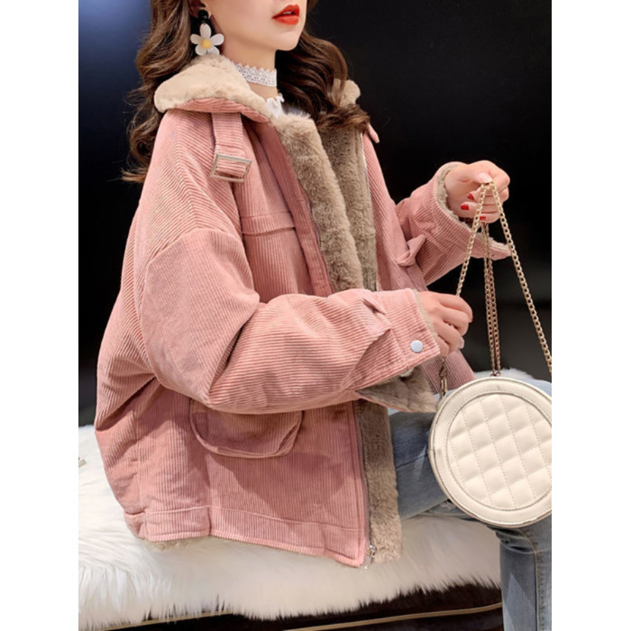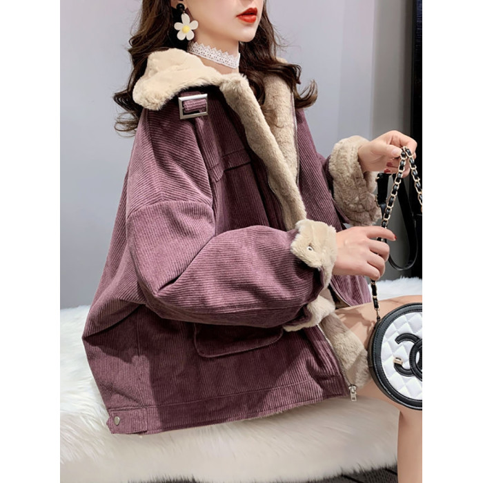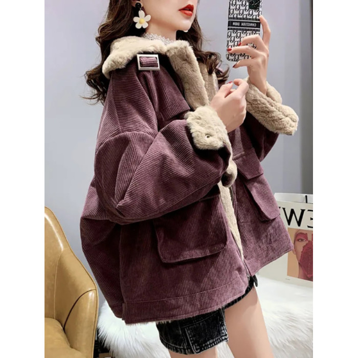 羊羔毛工裝燈芯絨外套女秋冬季寬松百搭毛毛保暖加絨加厚棉衣棉服
