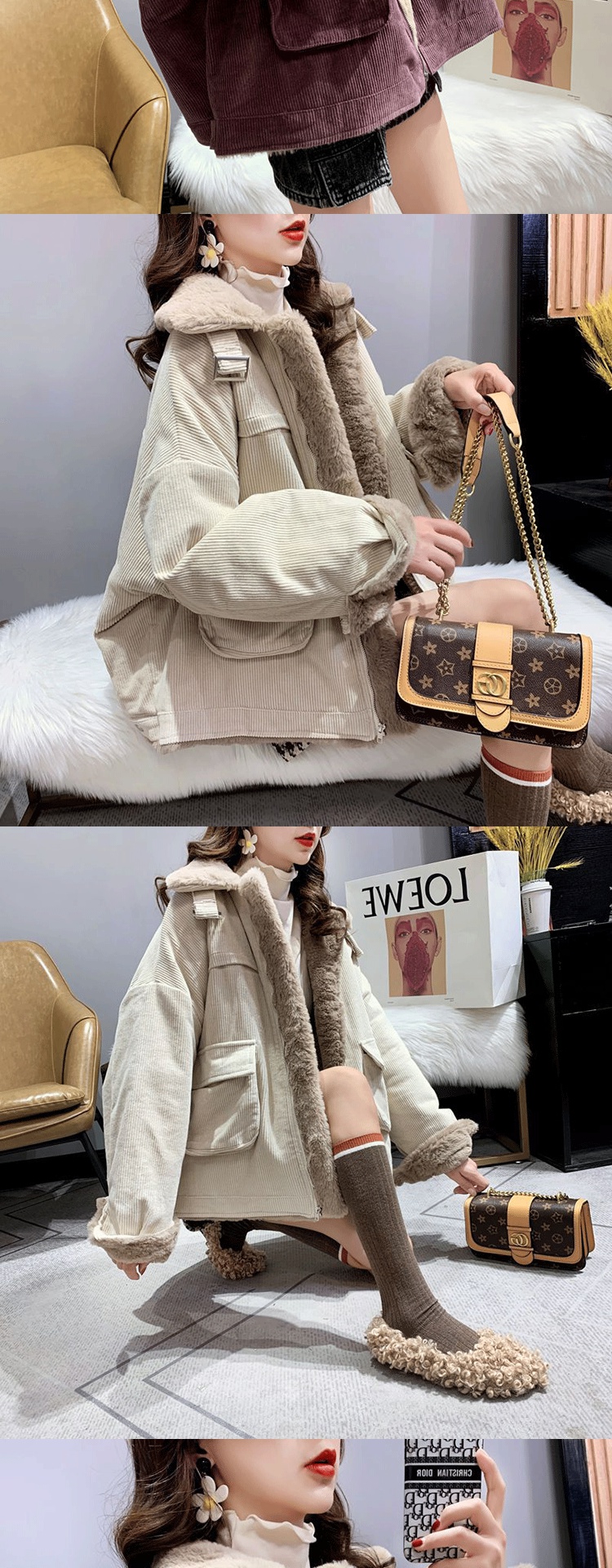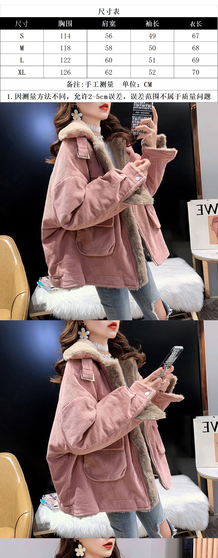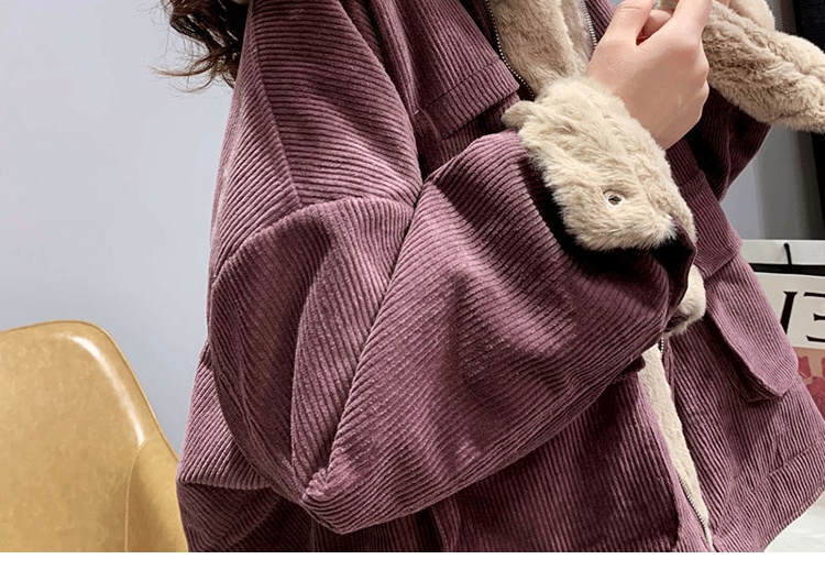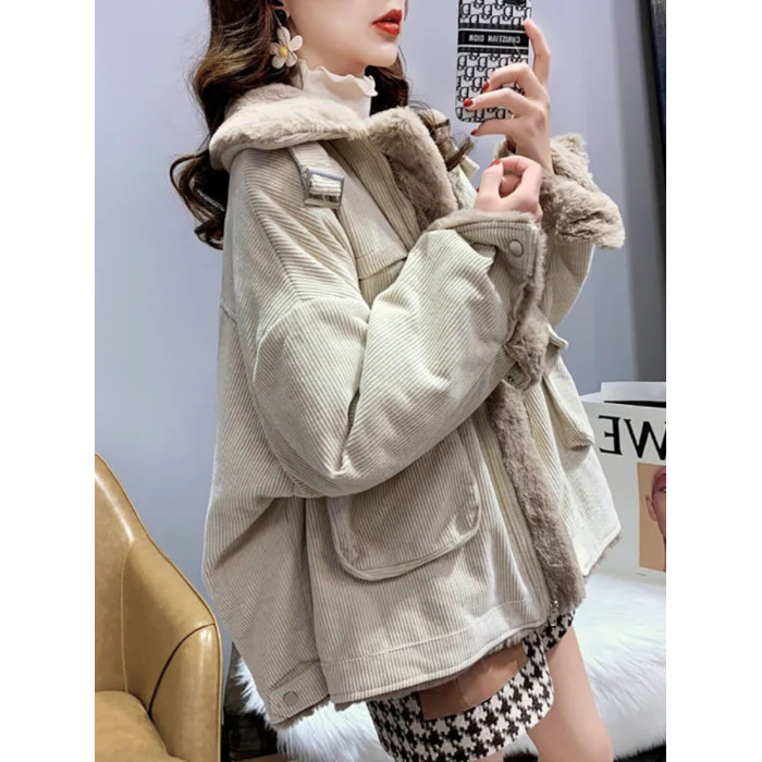 羊羔毛工裝燈芯絨外套女秋冬季寬松百搭毛毛保暖加絨加厚棉衣棉服