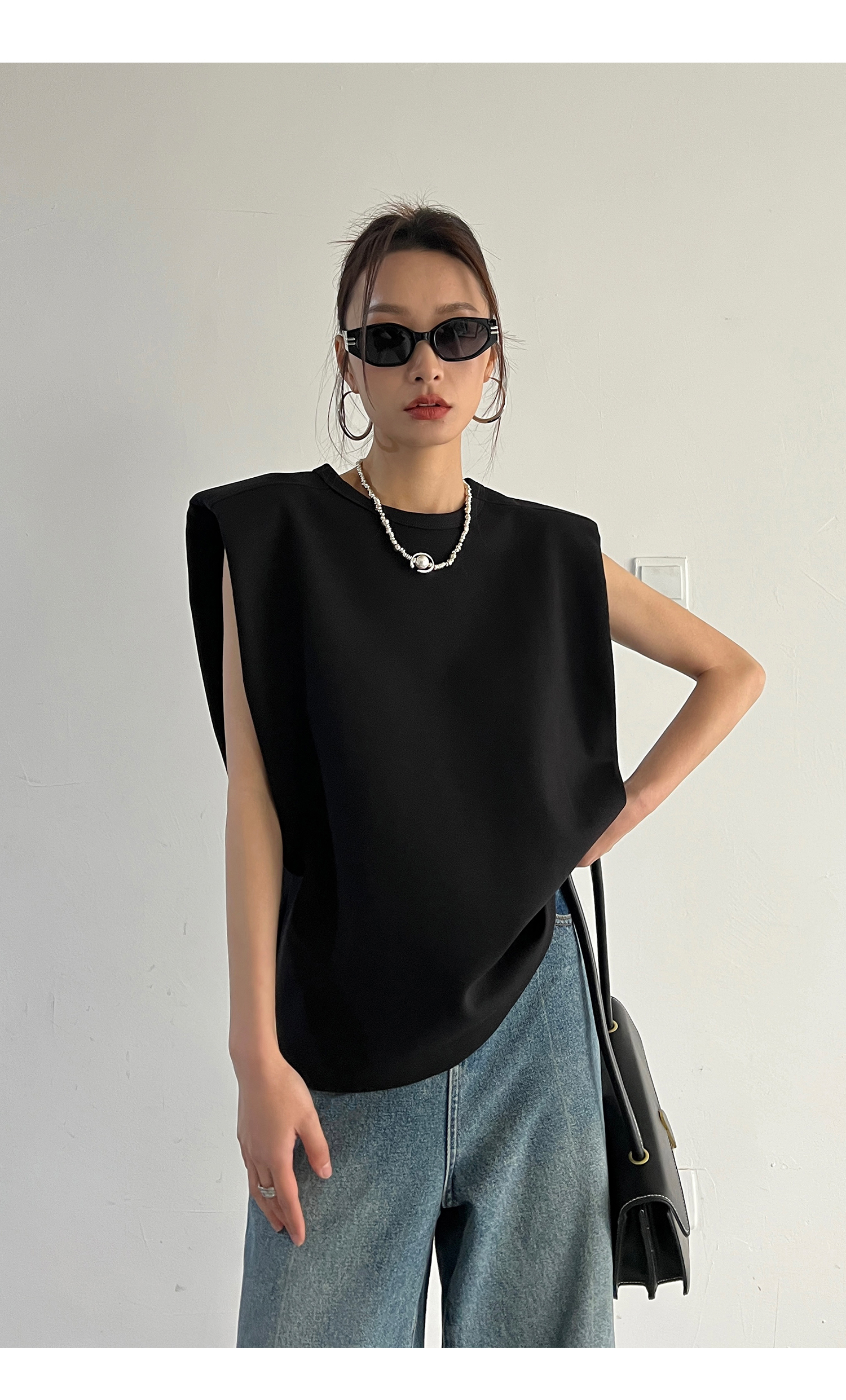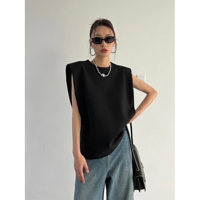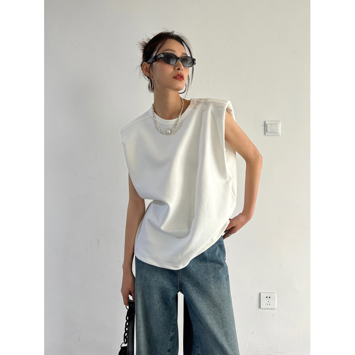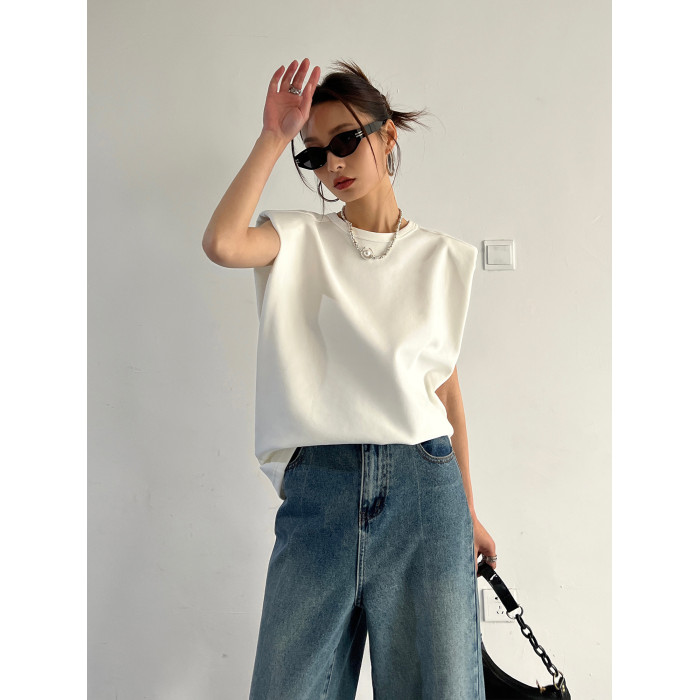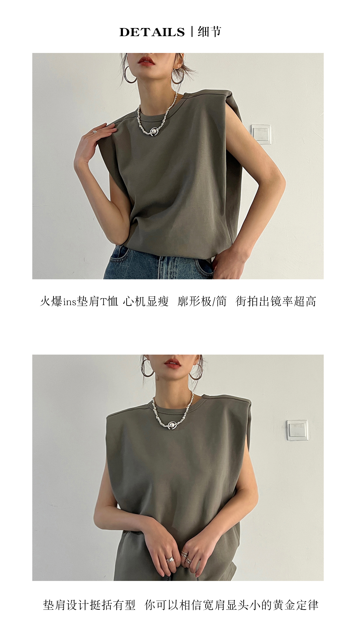 2025年夏季新款直角正肩韓版寬松顯瘦法式無袖小衆墊肩背心t恤女