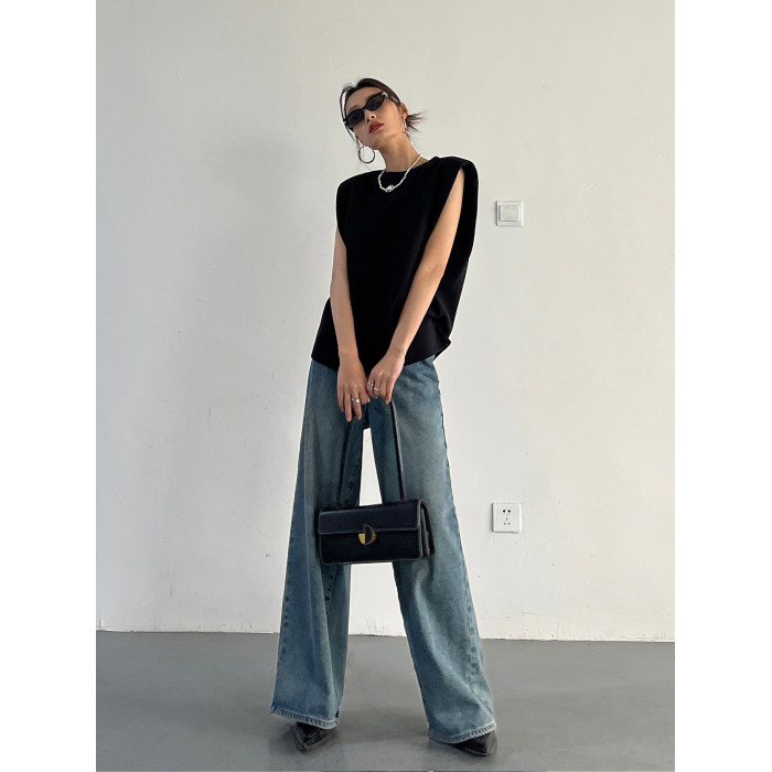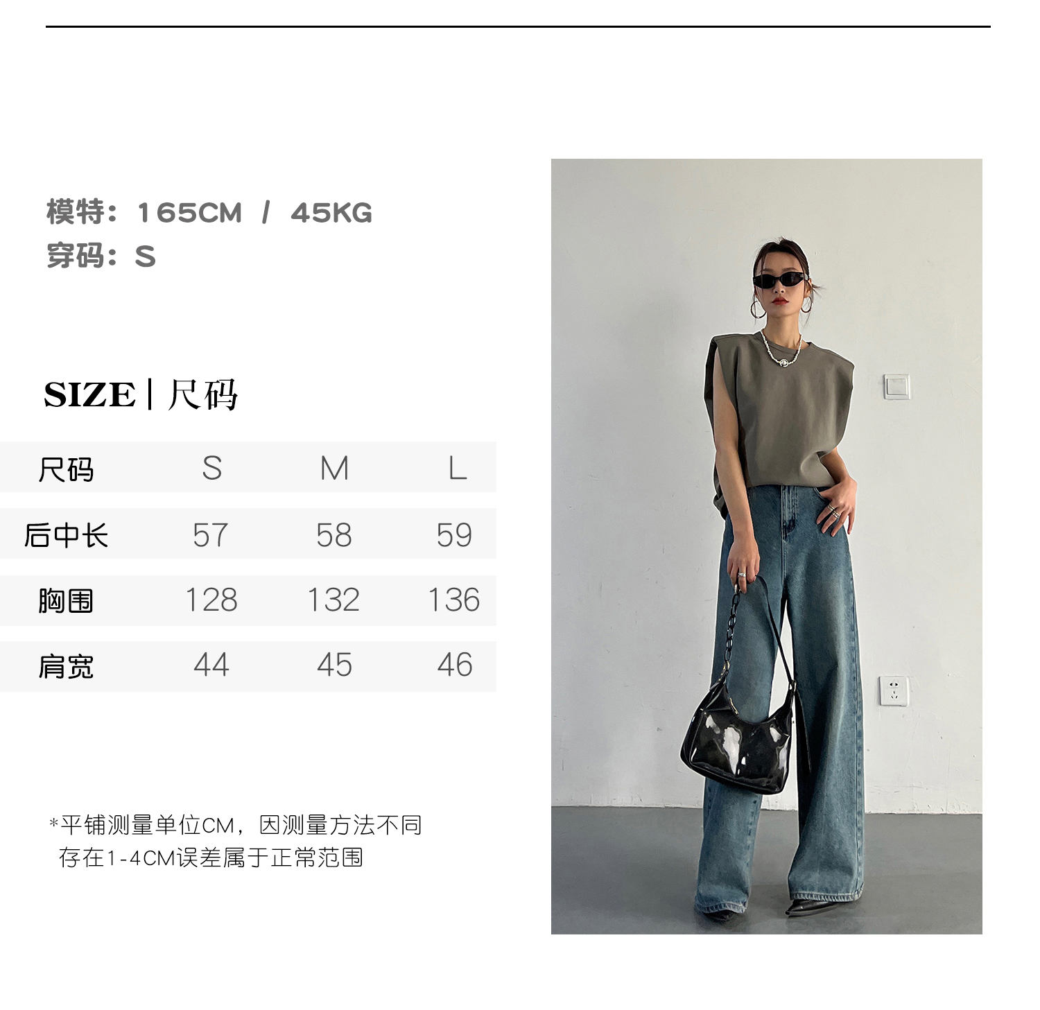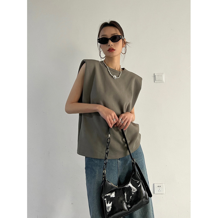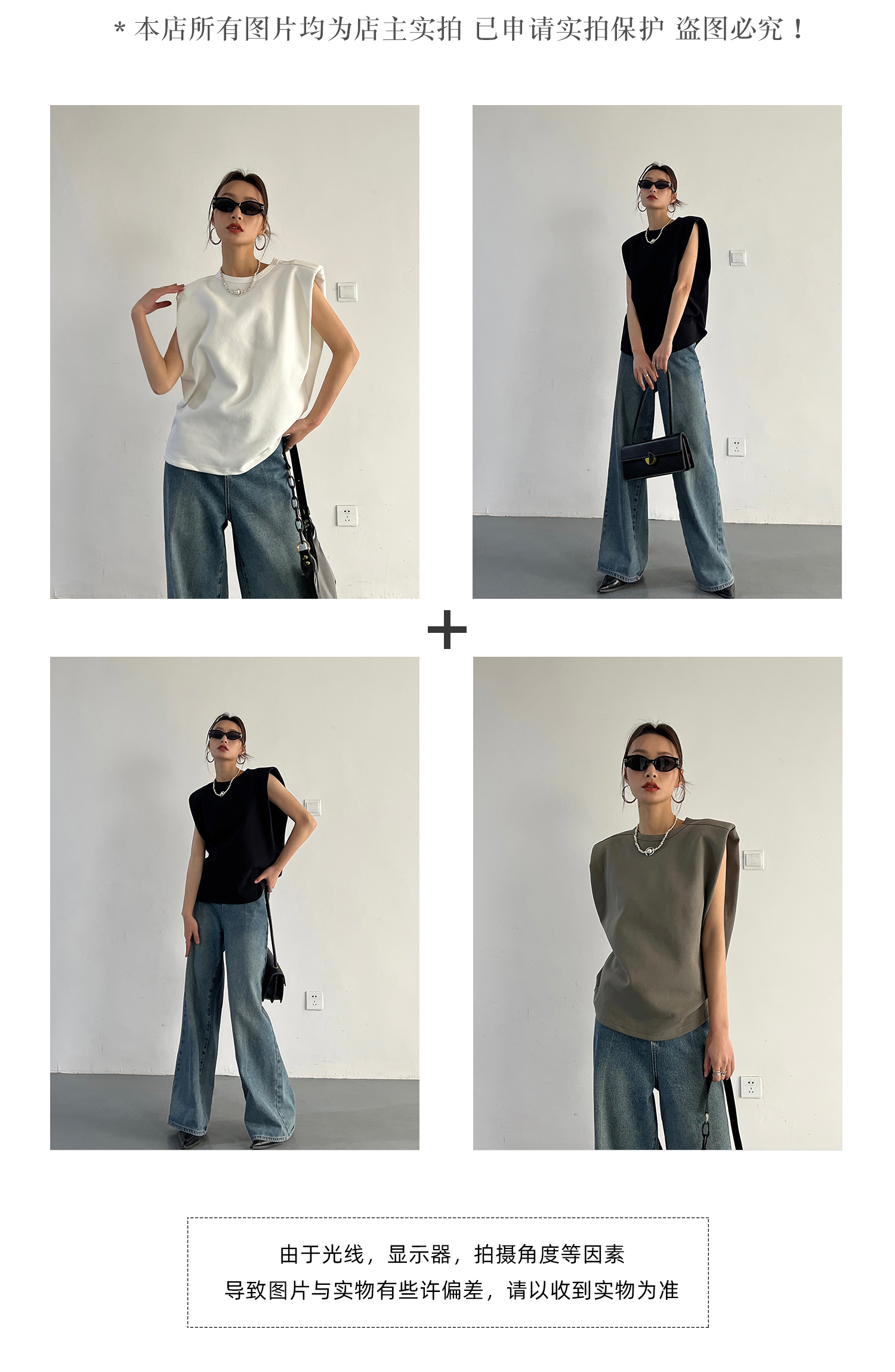 2025年夏季新款直角正肩韓版寬松顯瘦法式無袖小衆墊肩背心t恤女