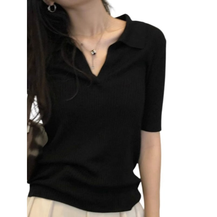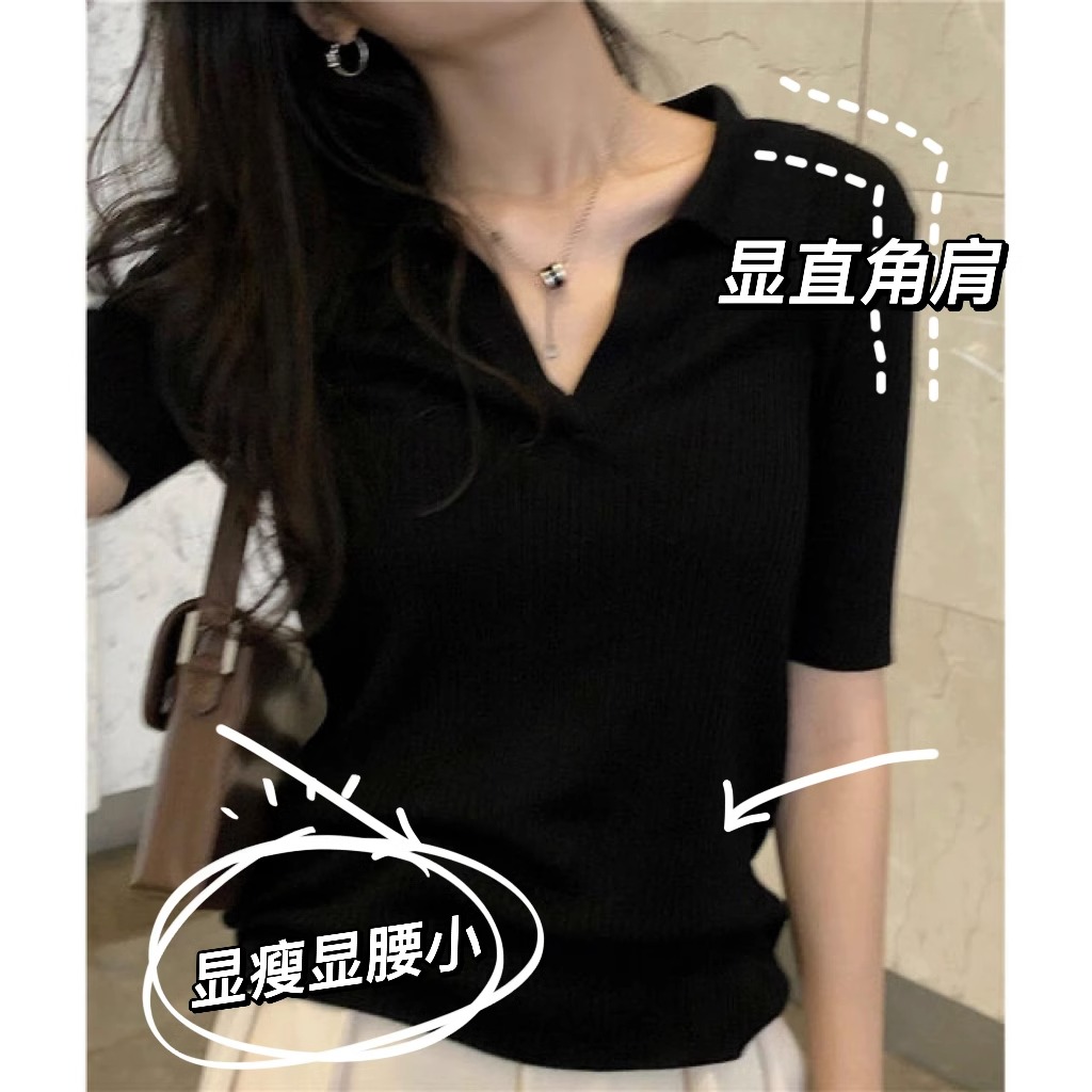 黑色v領短袖正肩t恤女夏季高級感修身顯瘦小個子別致鎖骨短款上衣