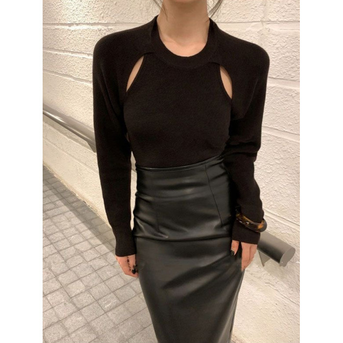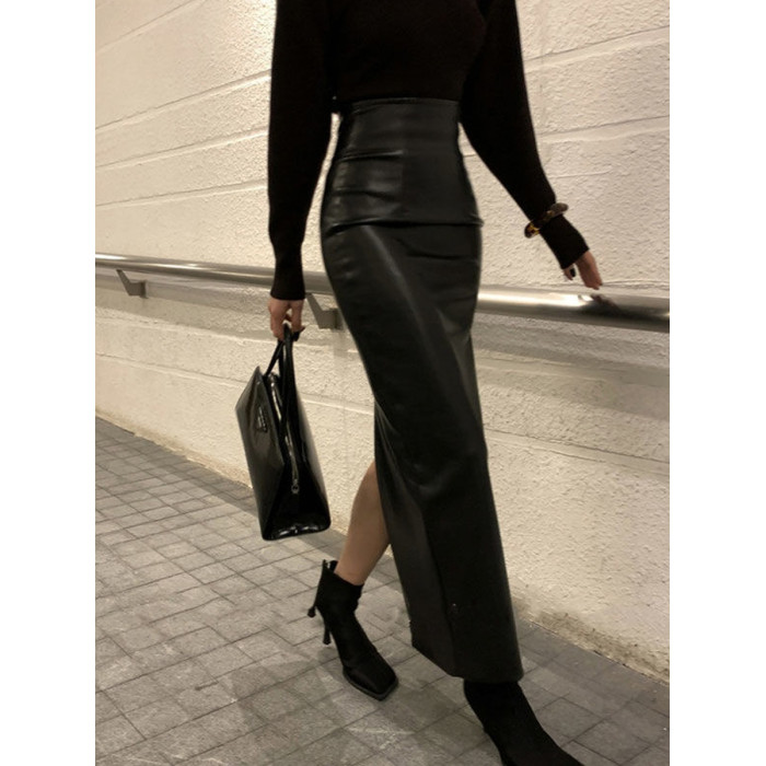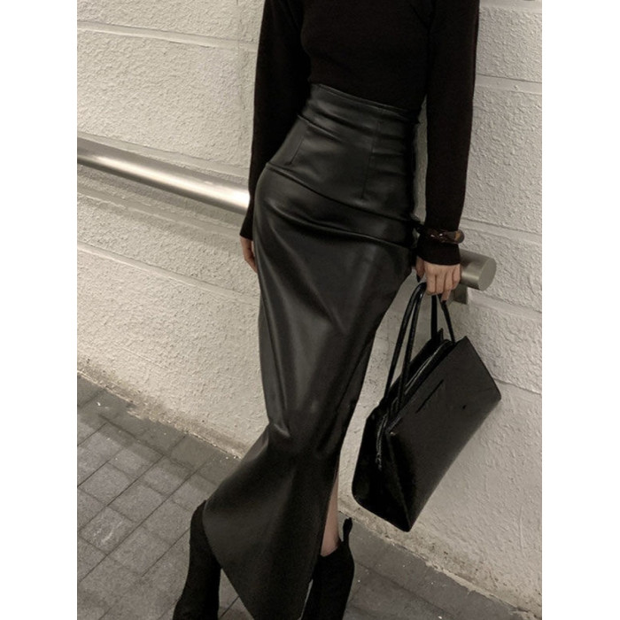 黑色pu皮裙半身裙女秋季新款高腰顯瘦辣妹性感中長款開叉包臀裙子