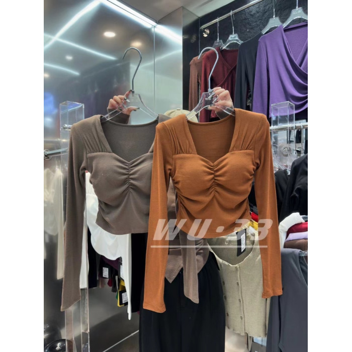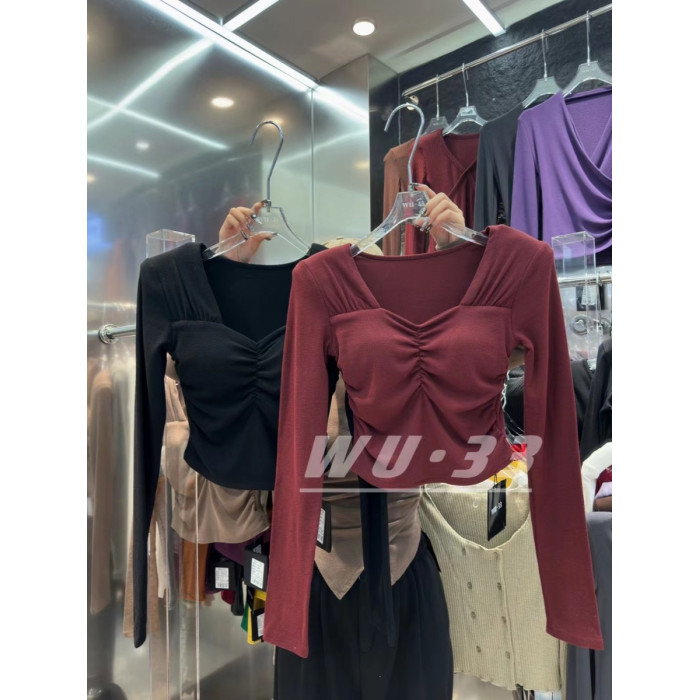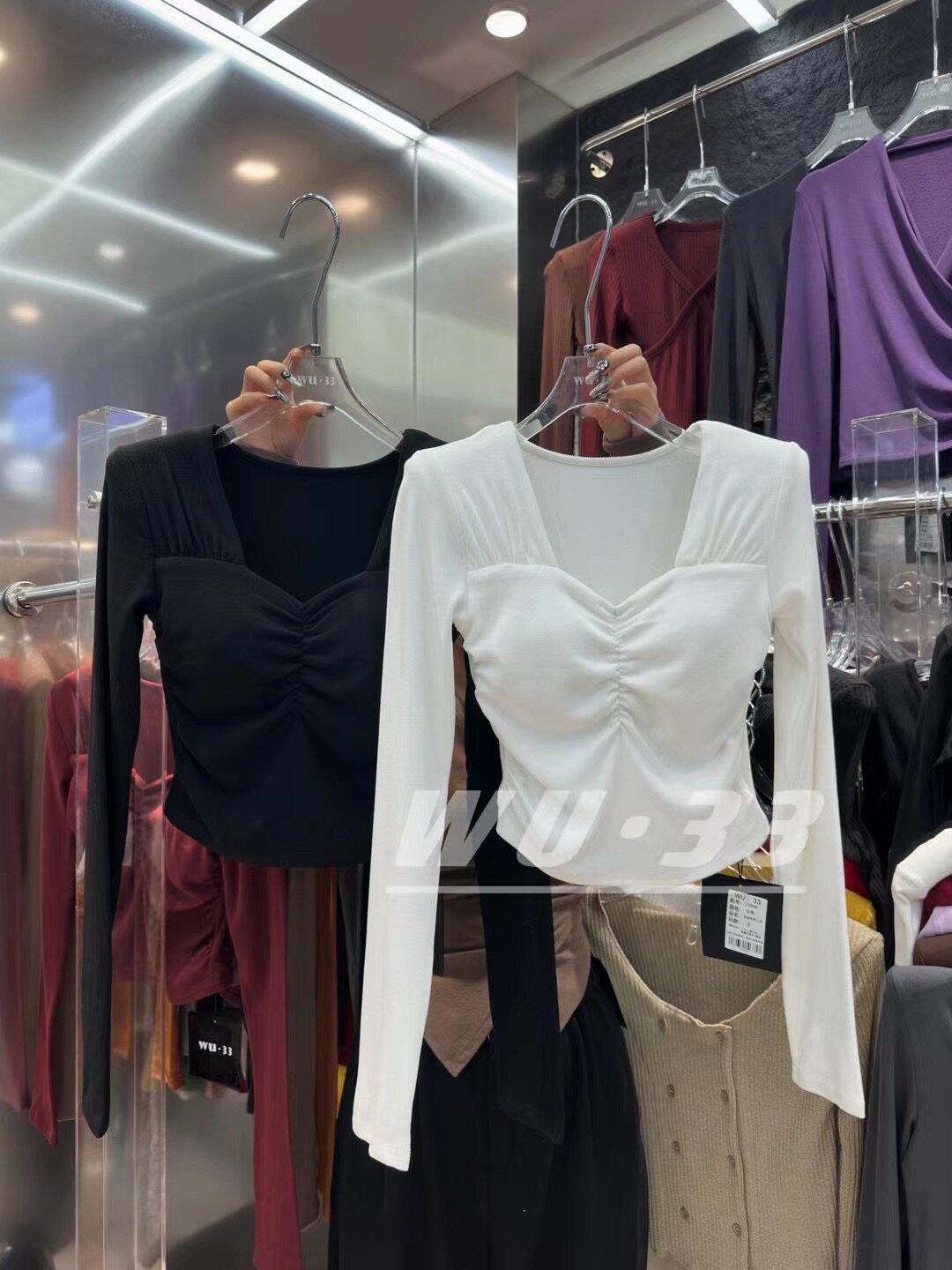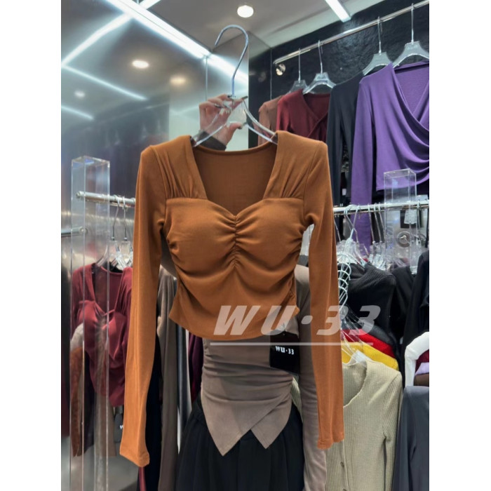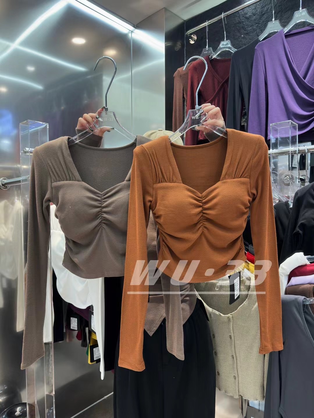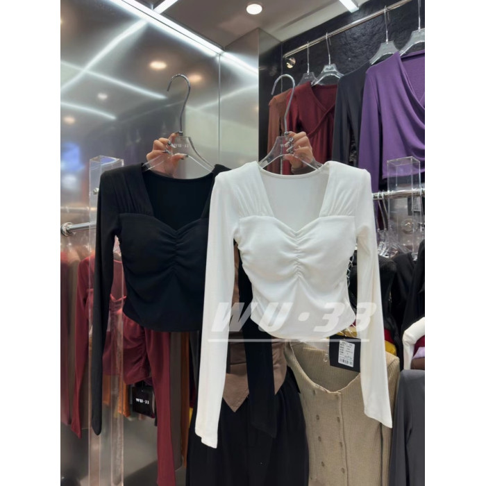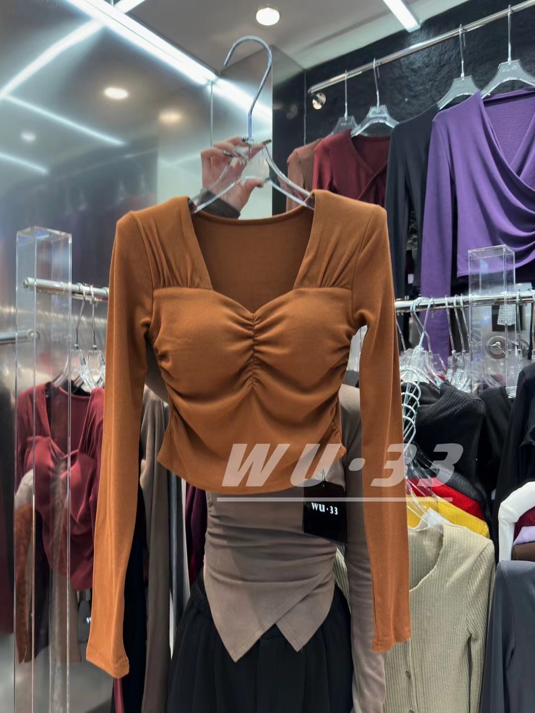 2025秋冬新款韓版修身顯瘦褶皺設計感方領上衣加絨帶胸墊長袖T恤