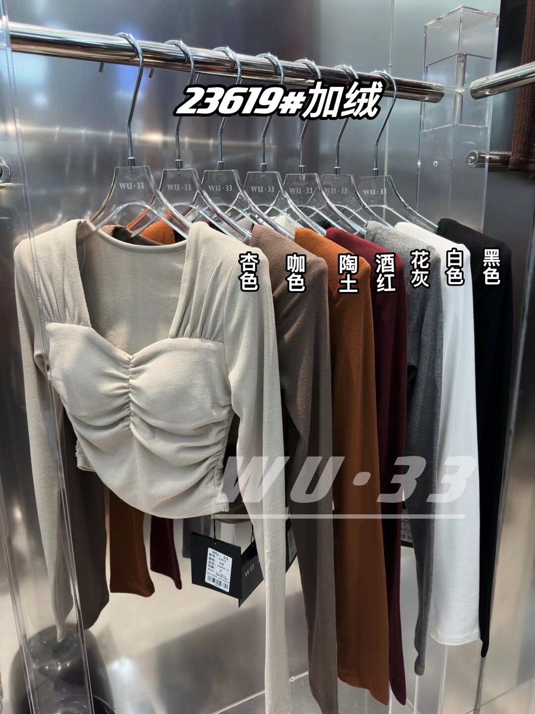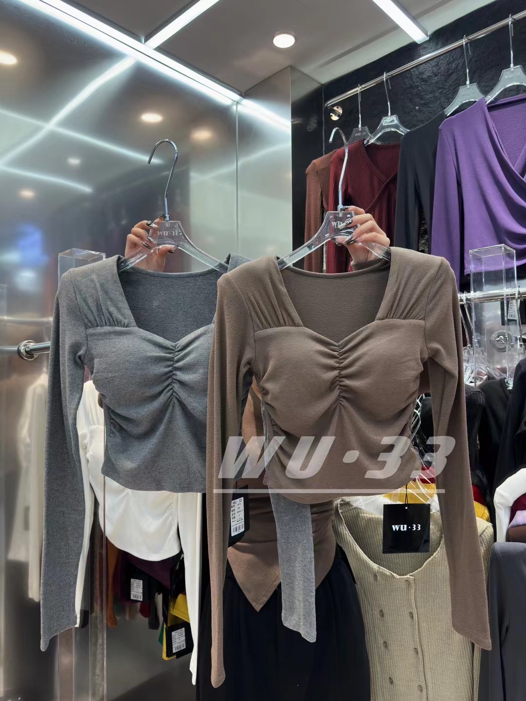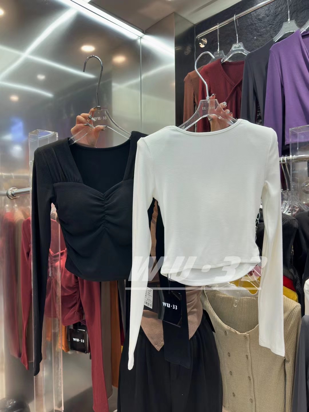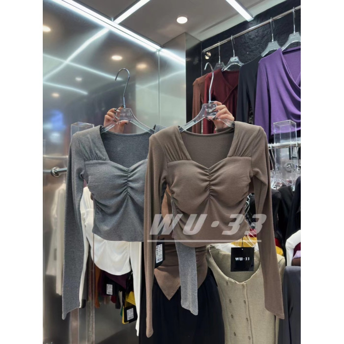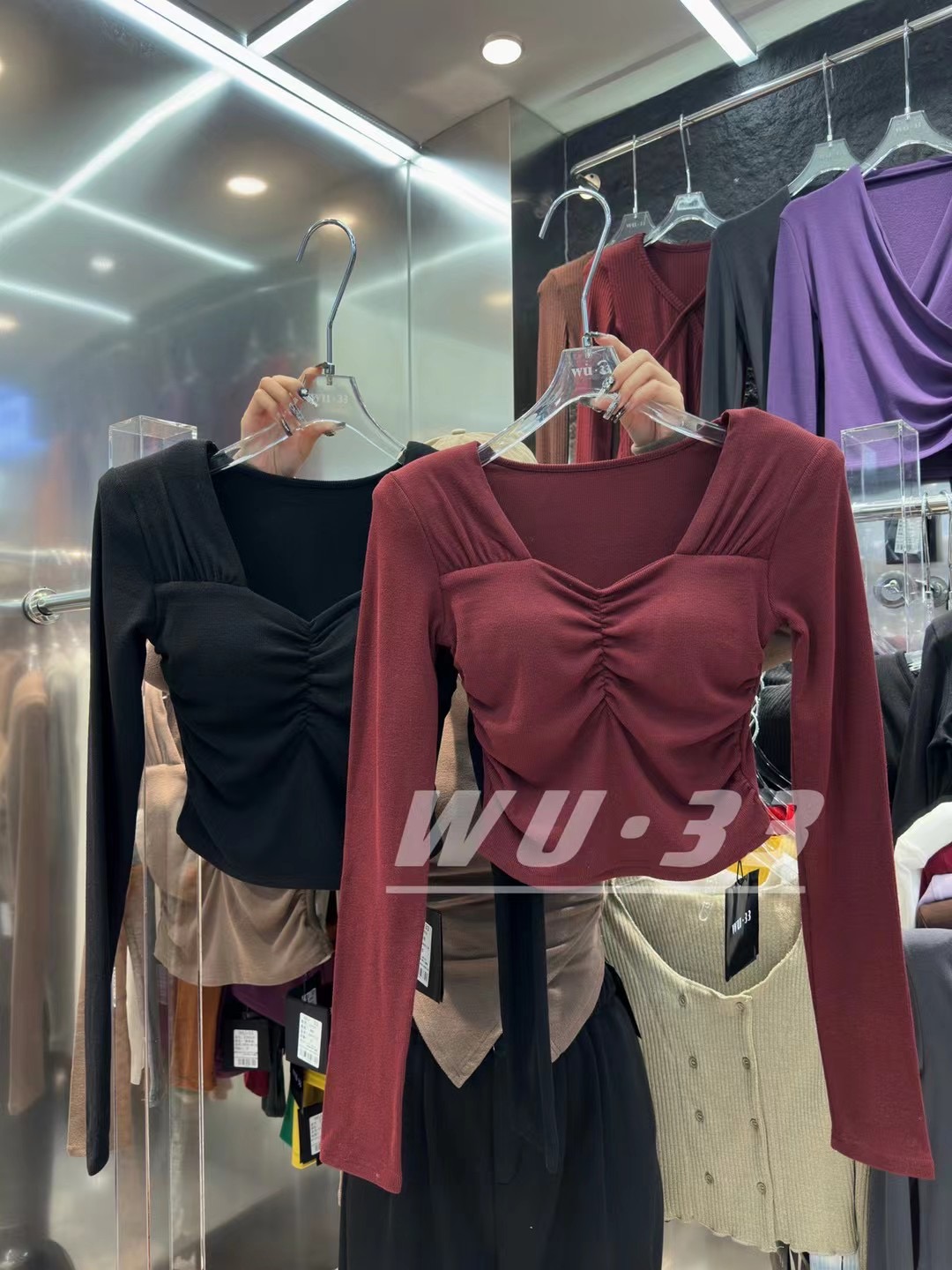 2025秋冬新款韓版修身顯瘦褶皺設計感方領上衣加絨帶胸墊長袖T恤