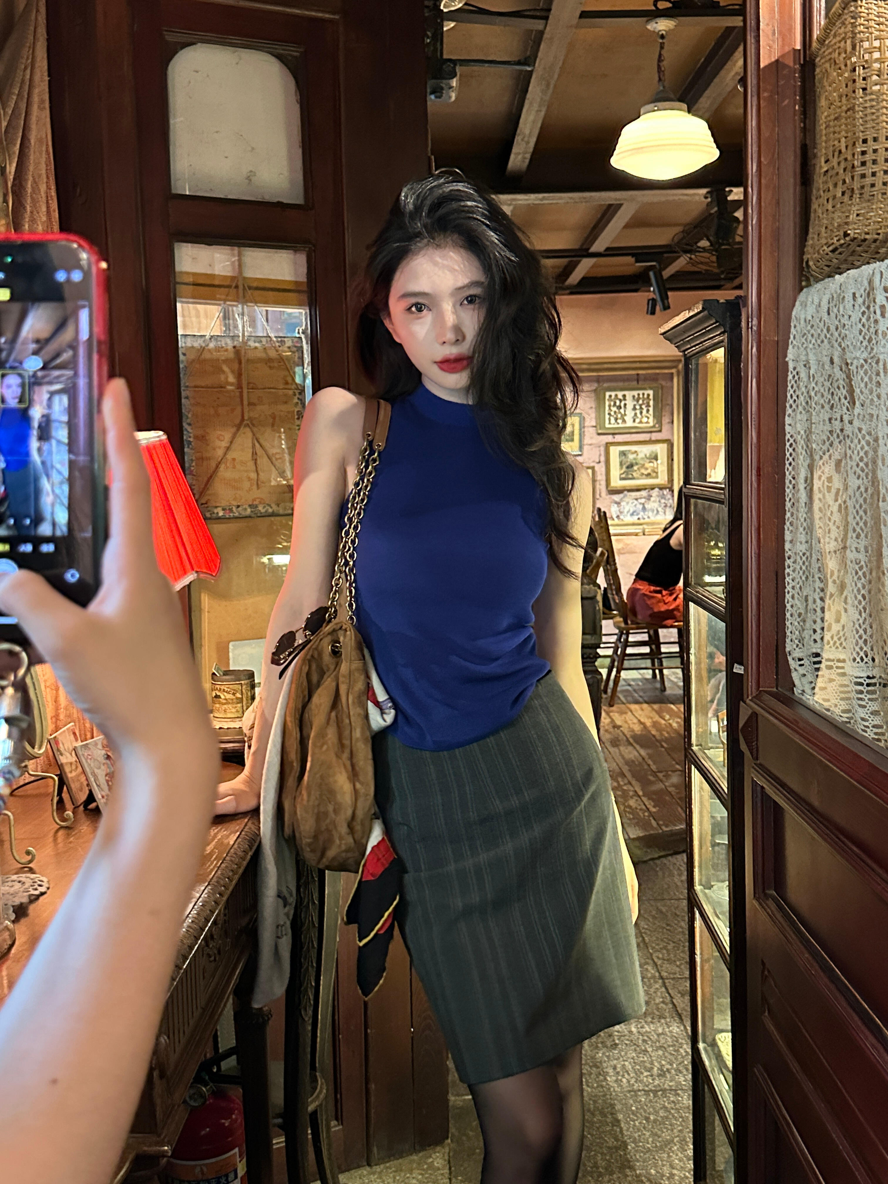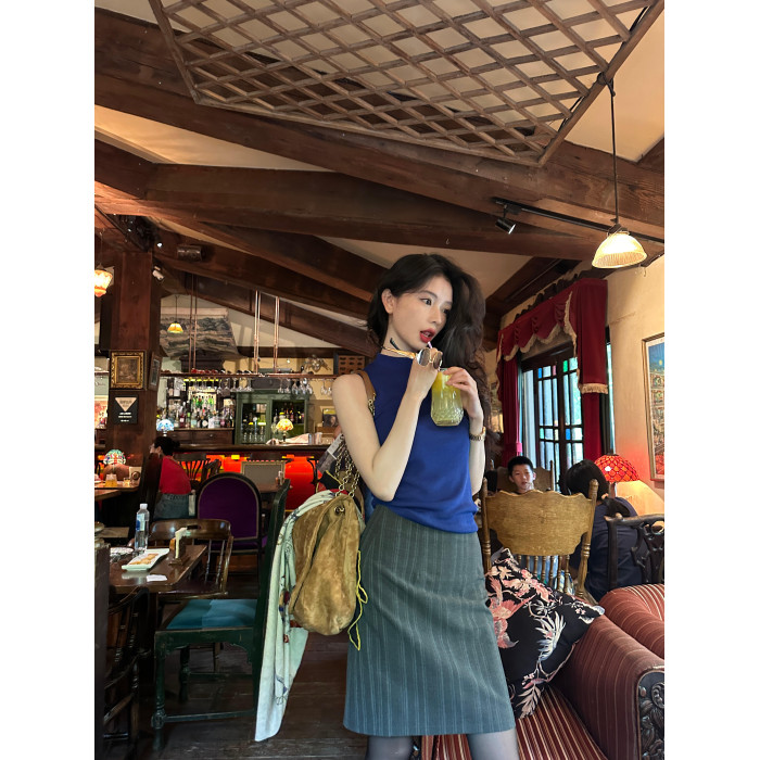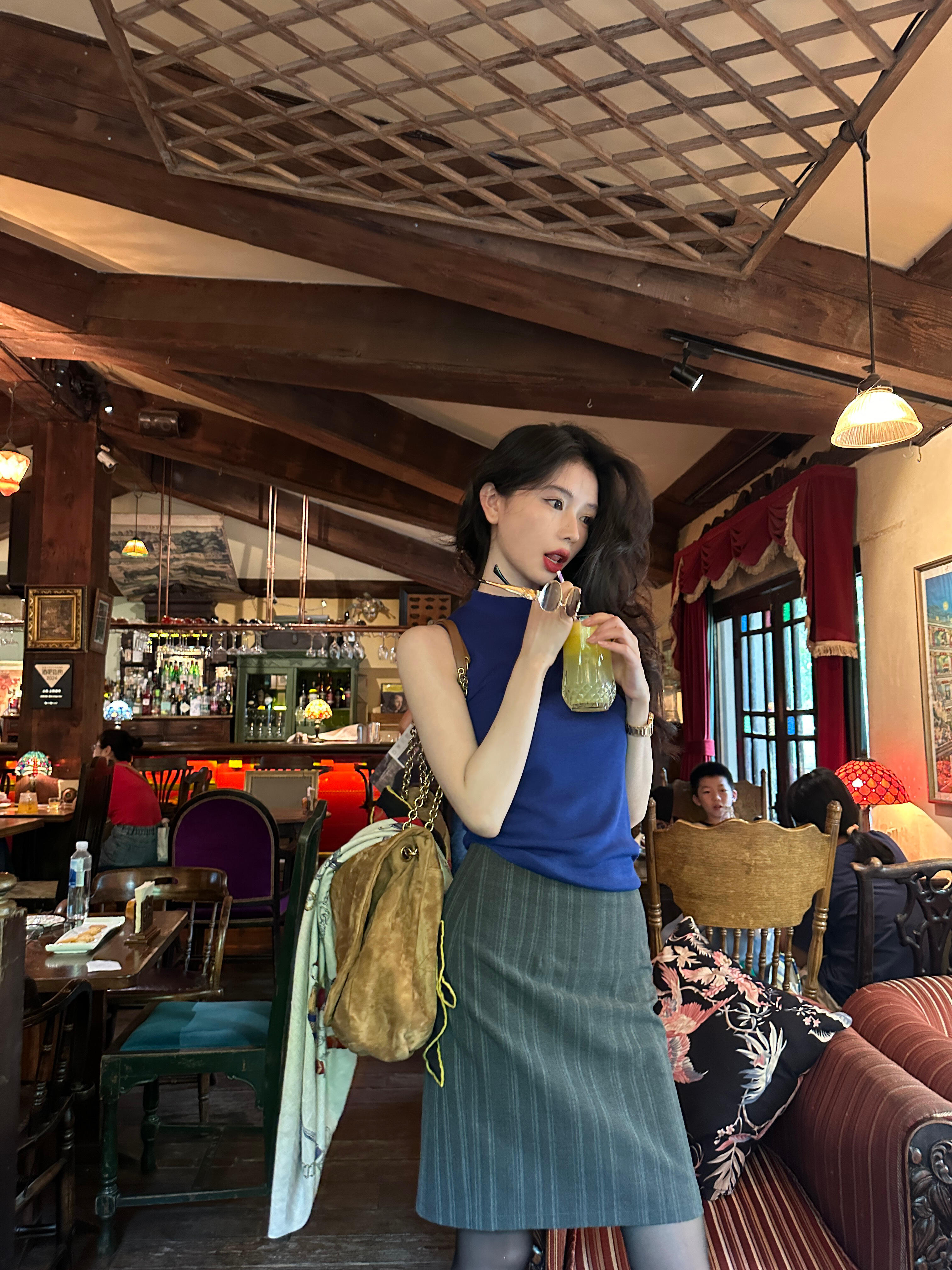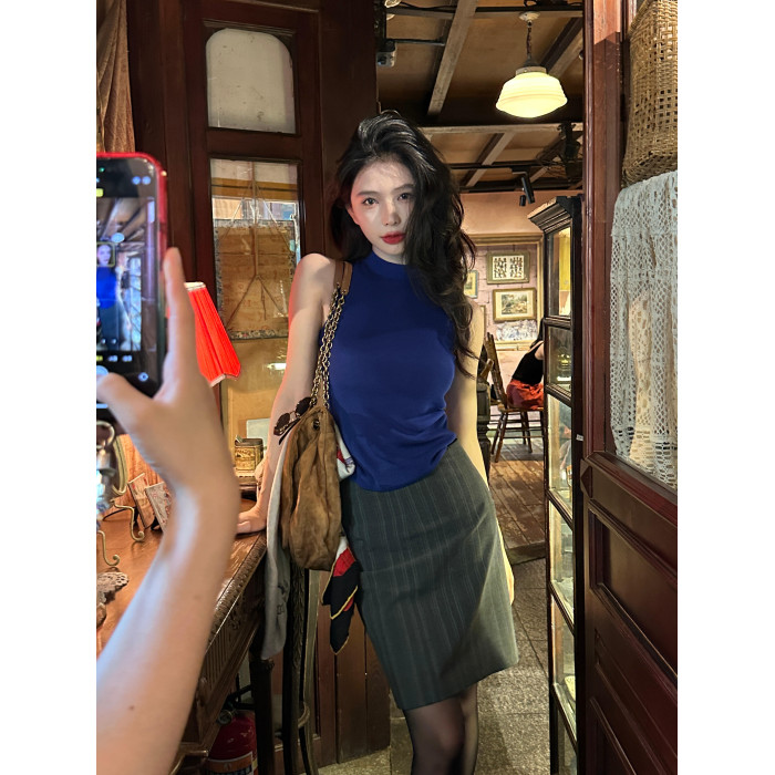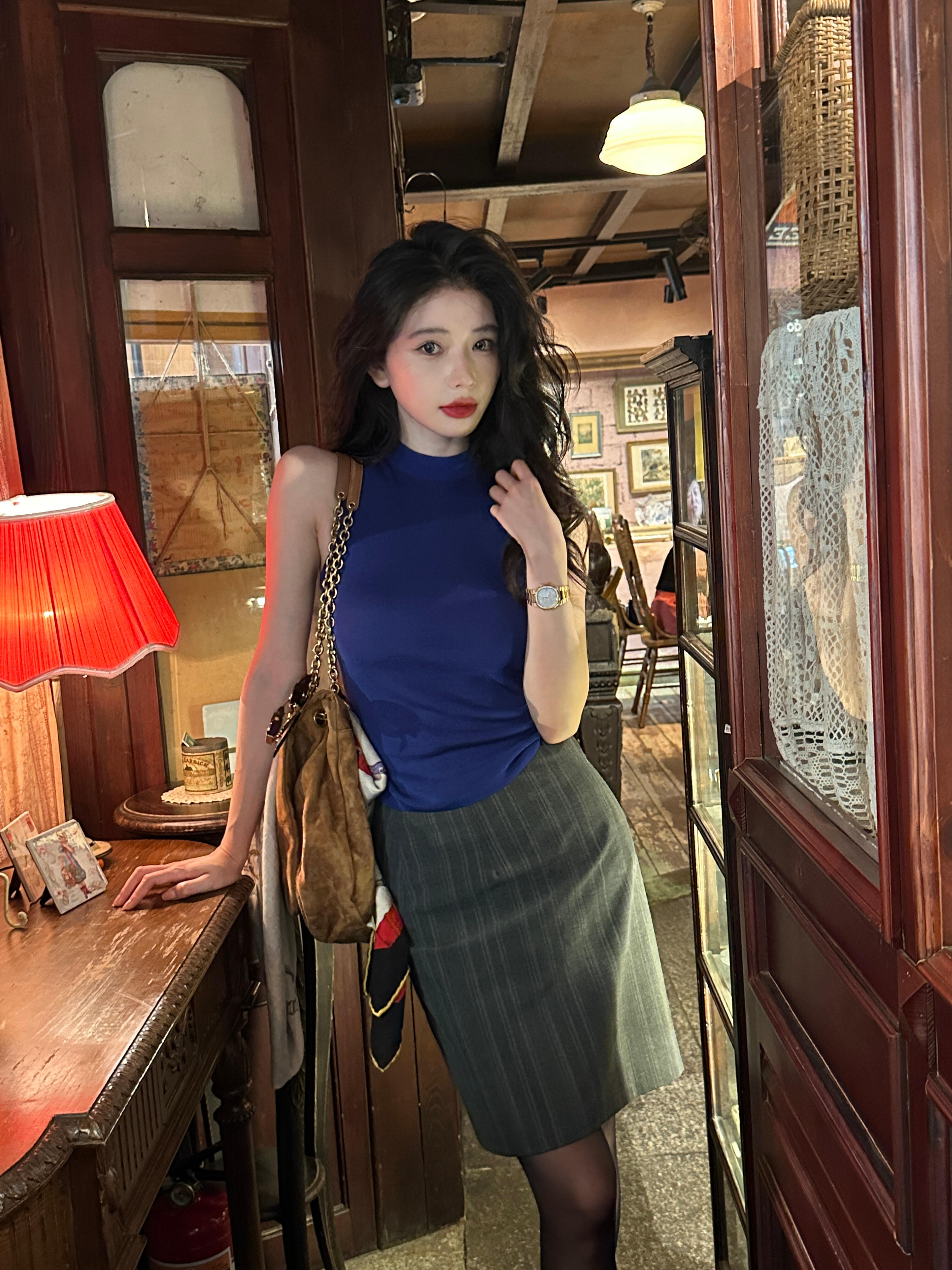 Nabi復古竪條紋西裝包臀半身裙女OL氣質開叉顯瘦修身灰色直筒短裙