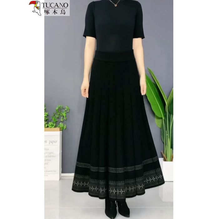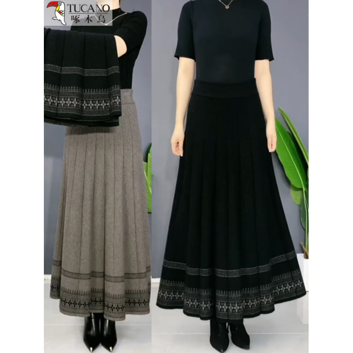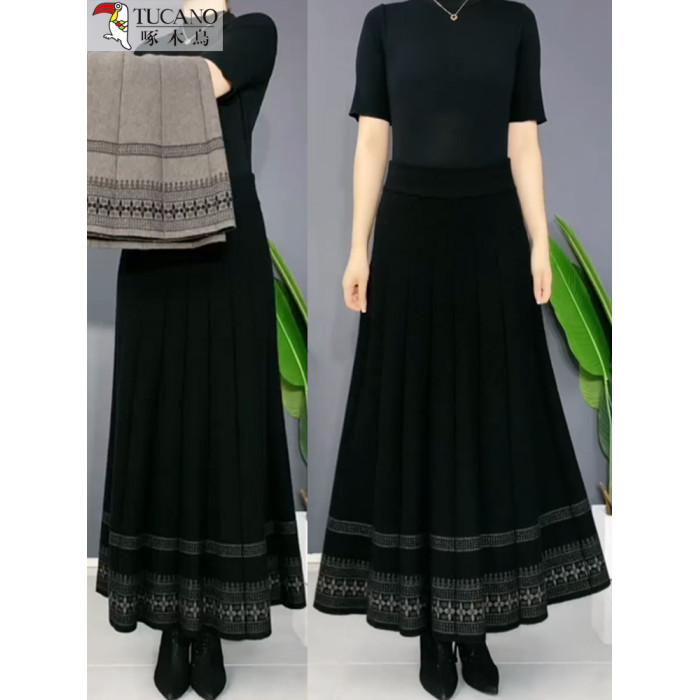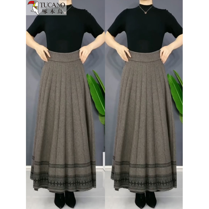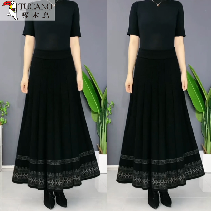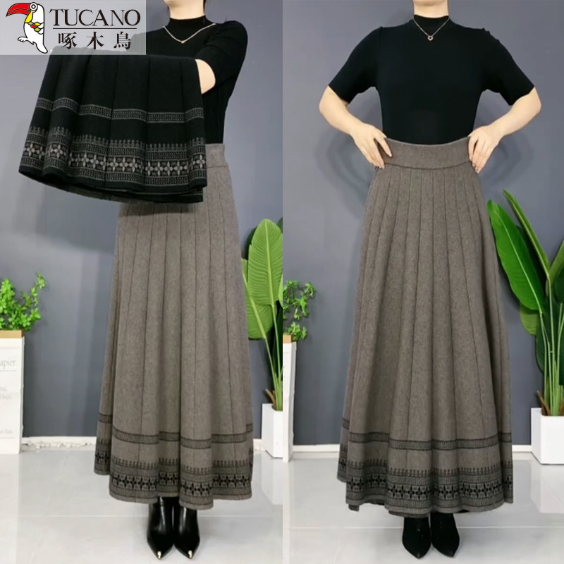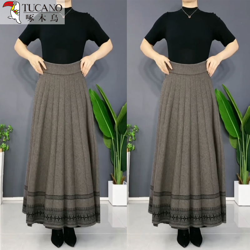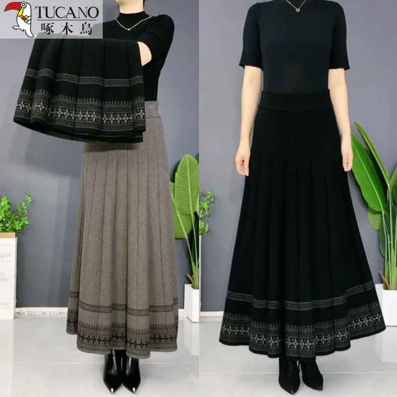啄木鳥冬季厚款針織羊毛半身裙女保暖高腰大擺裙媽媽舞裙長裙繖裙