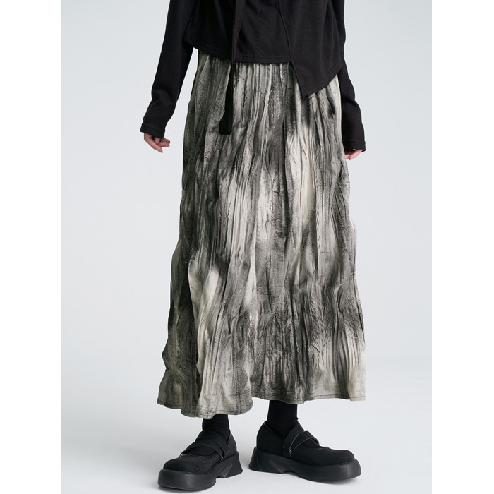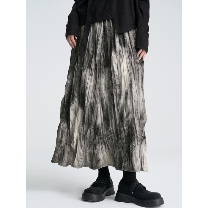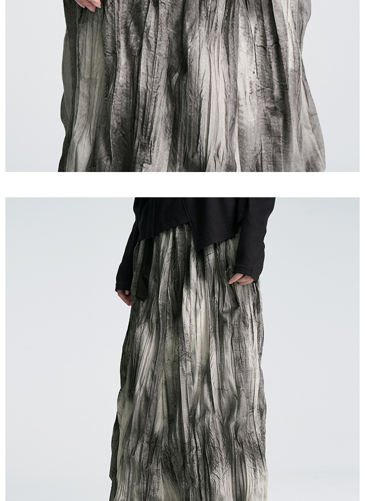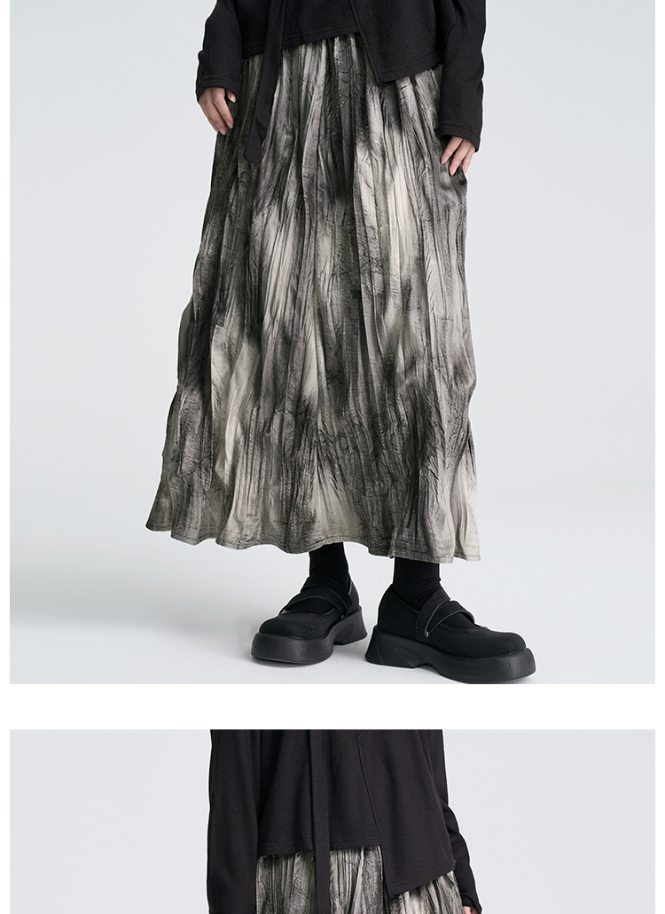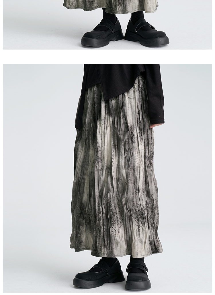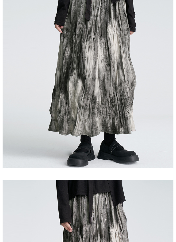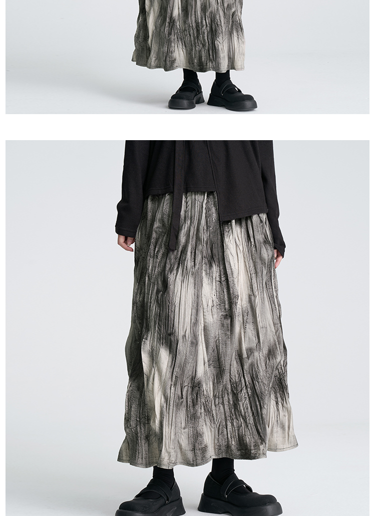陸與山嶼2025新款秋冬款設計感小衆百褶裙加厚裙子水墨印花半身裙