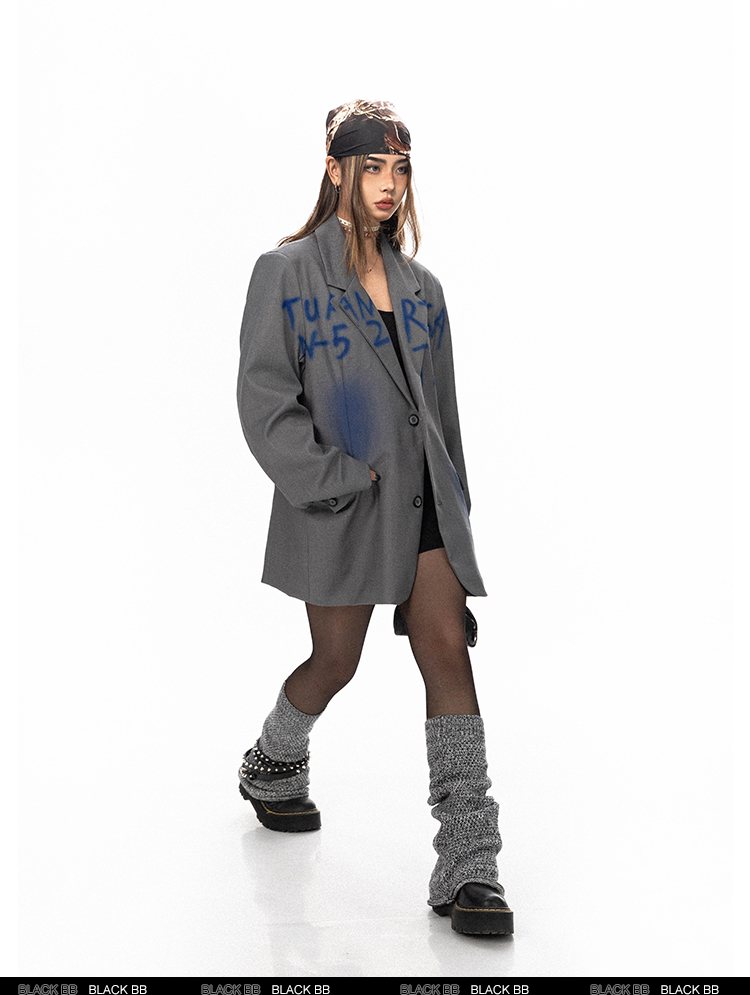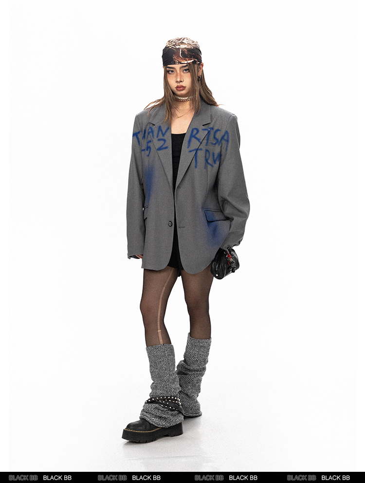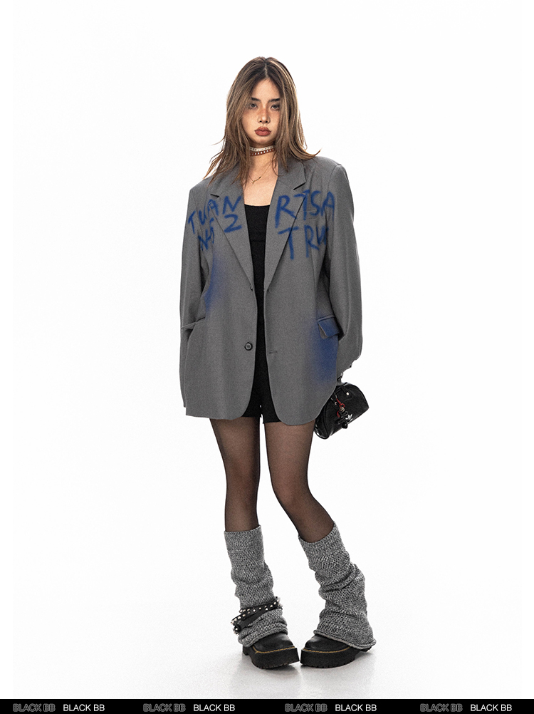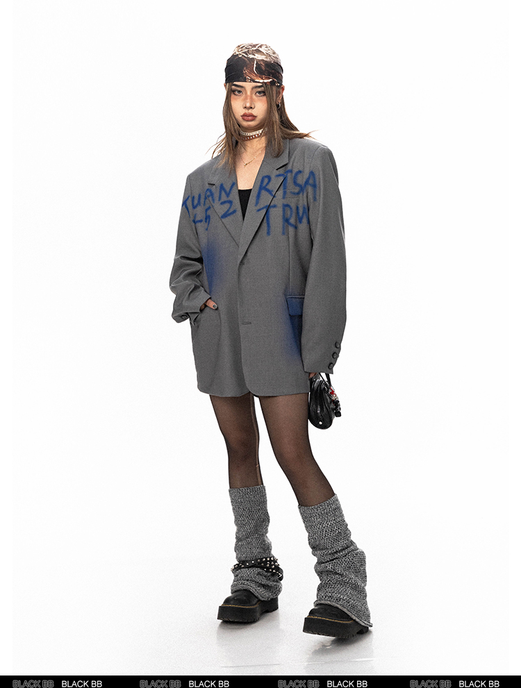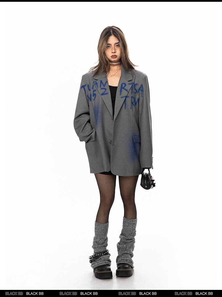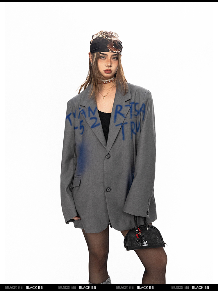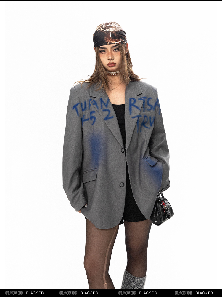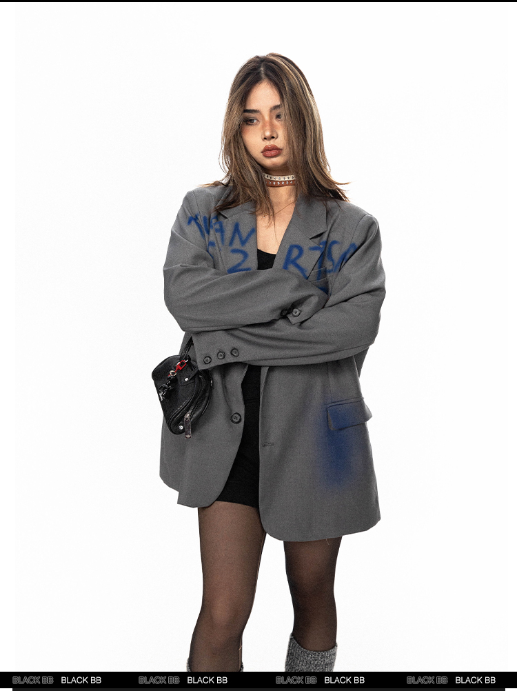 BLACKBB/噴繪撞色字母印花西裝外套女小衆設計感寬松休閒西服上衣