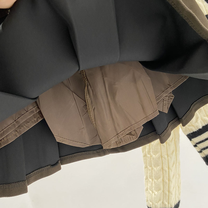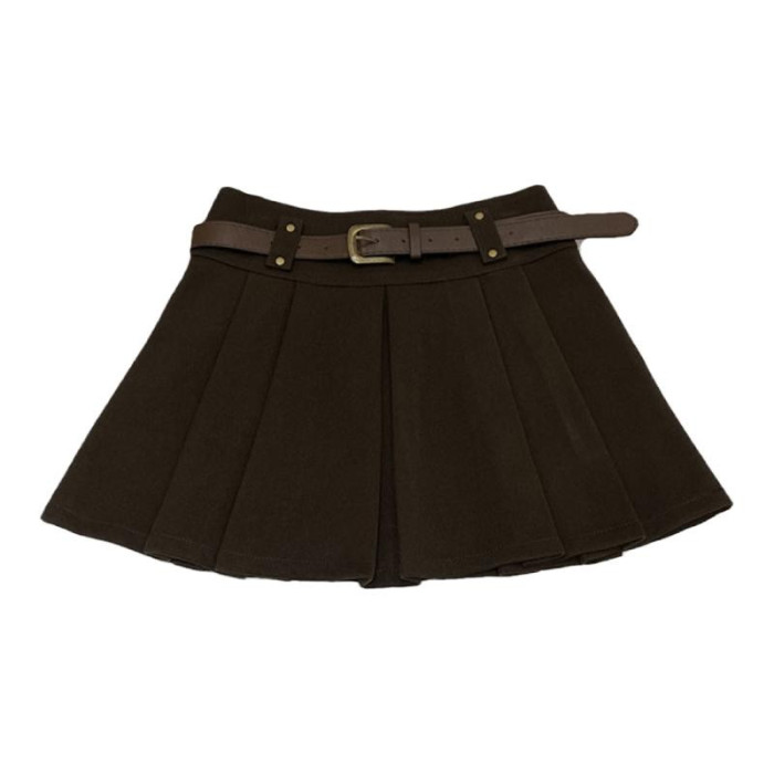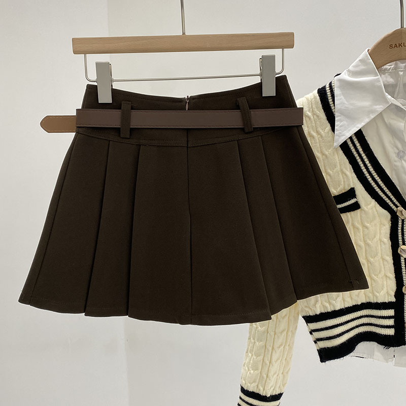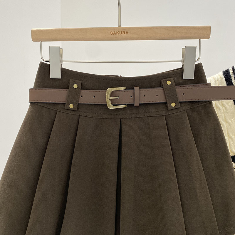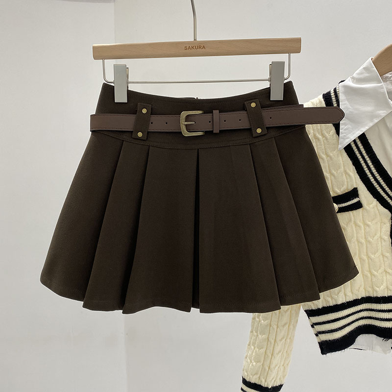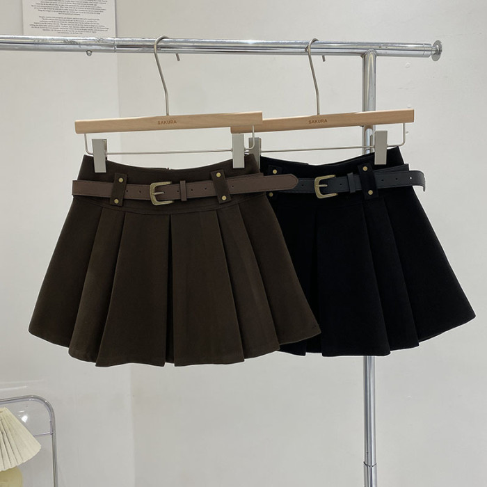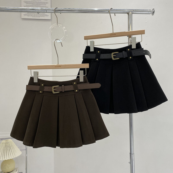 配皮帶高腰黑色防走光呢子百褶裙女2024秋冬韓版百搭A字半身短裙