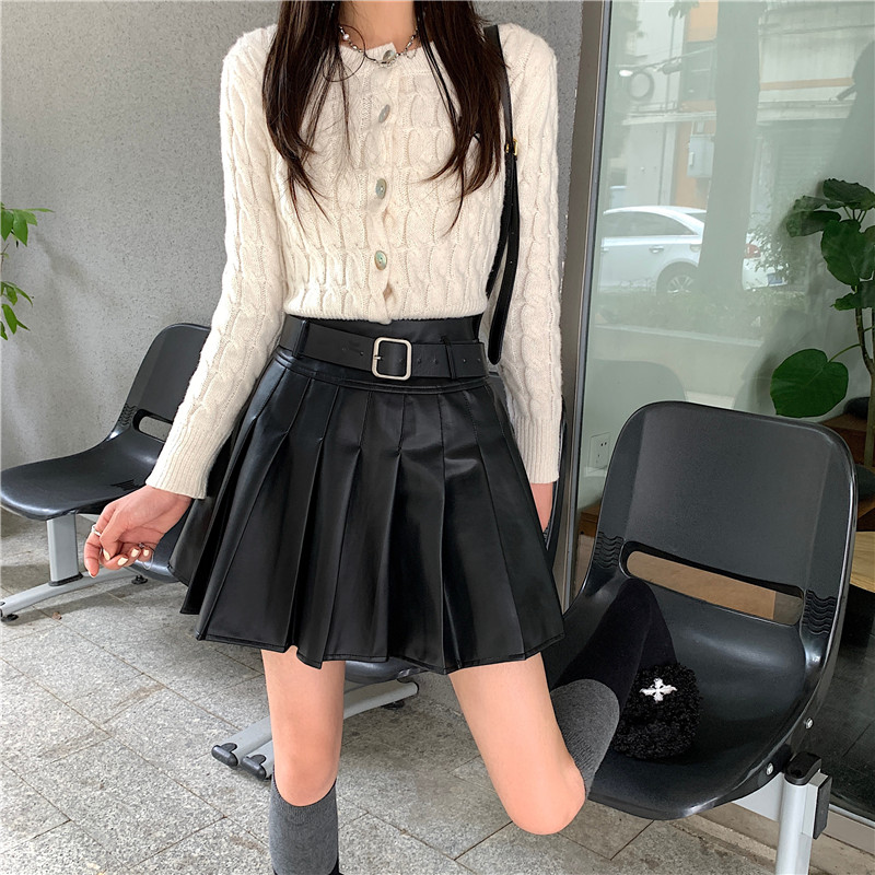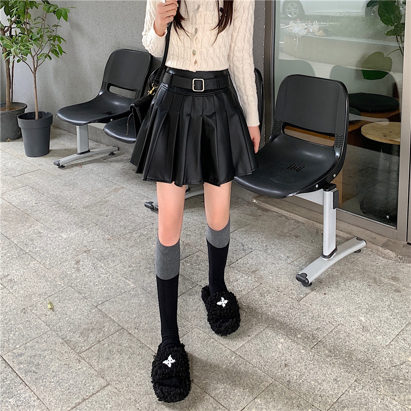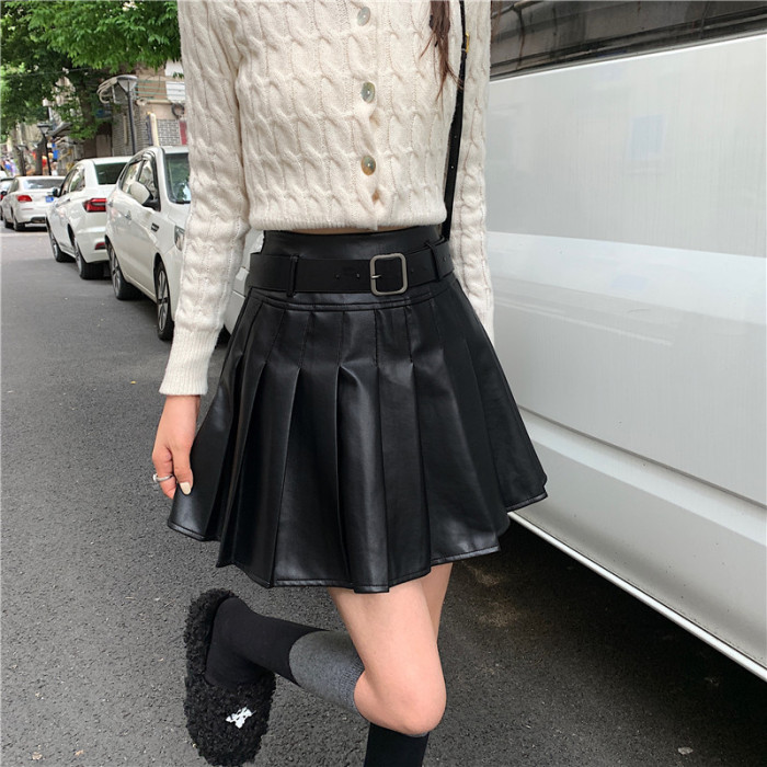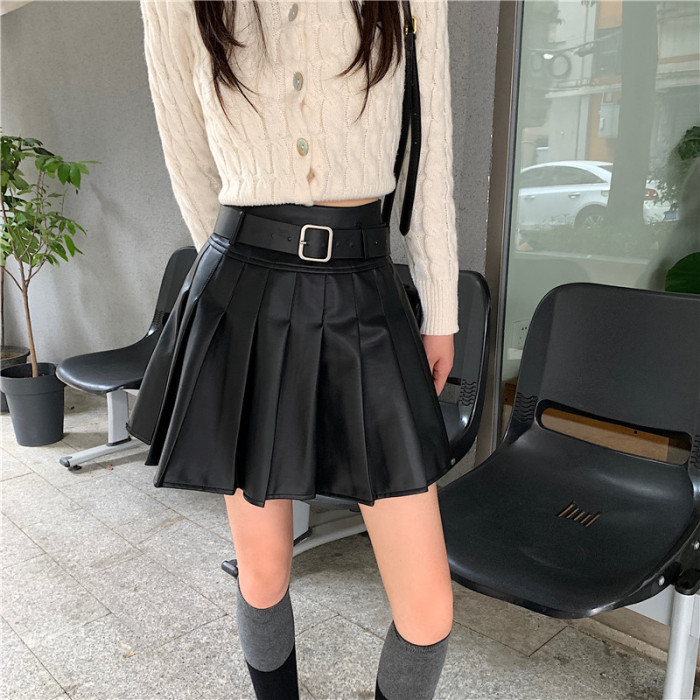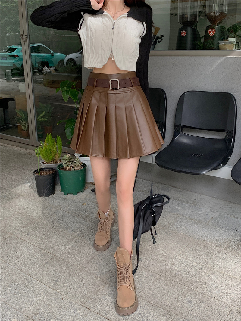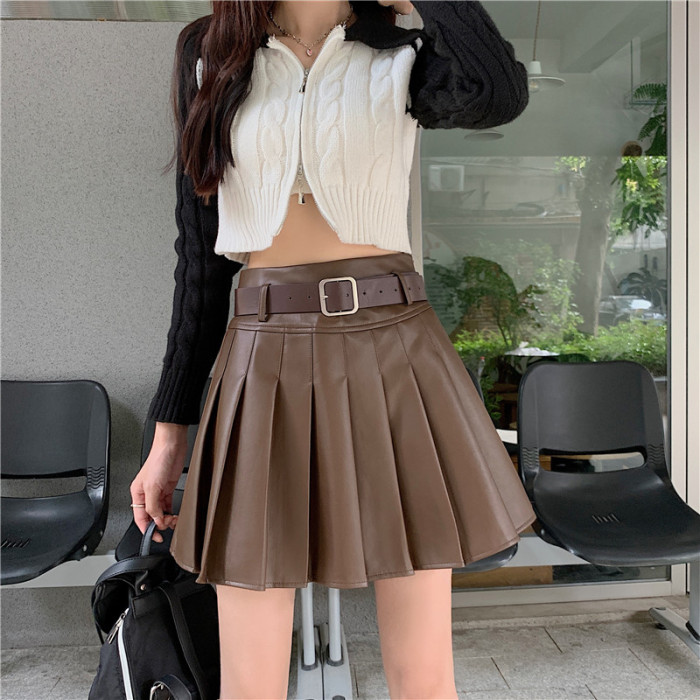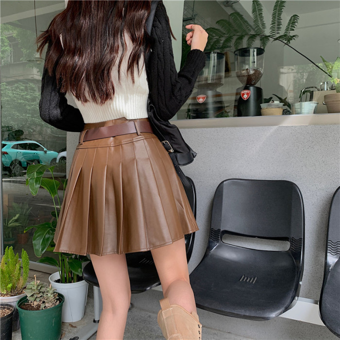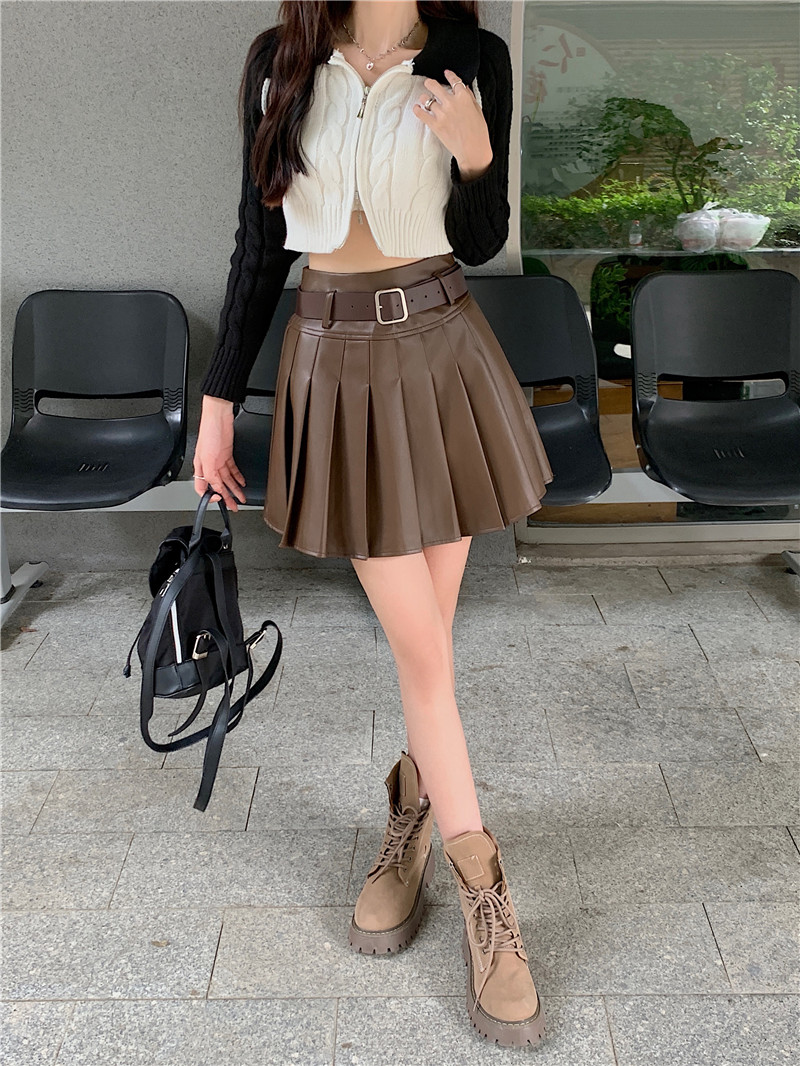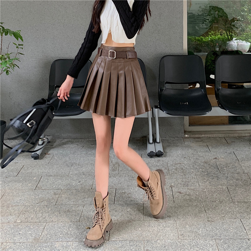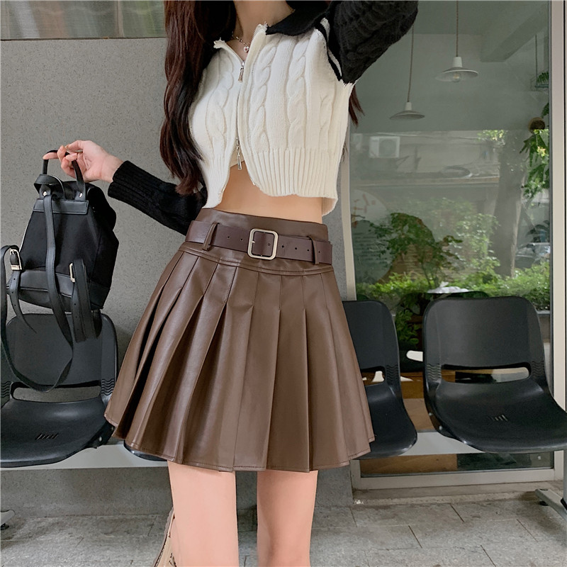 秋冬大碼復古咖色皮裙百褶裙女高腰百搭a字半身裙防走光顯瘦短裙